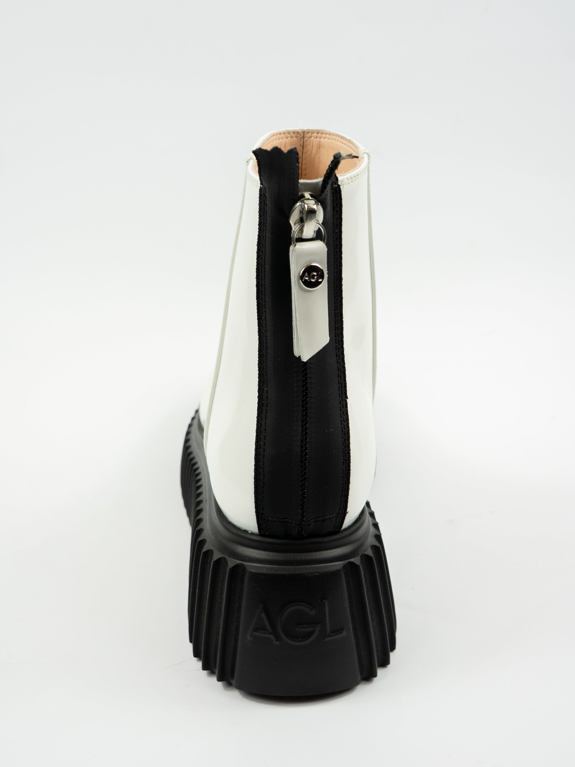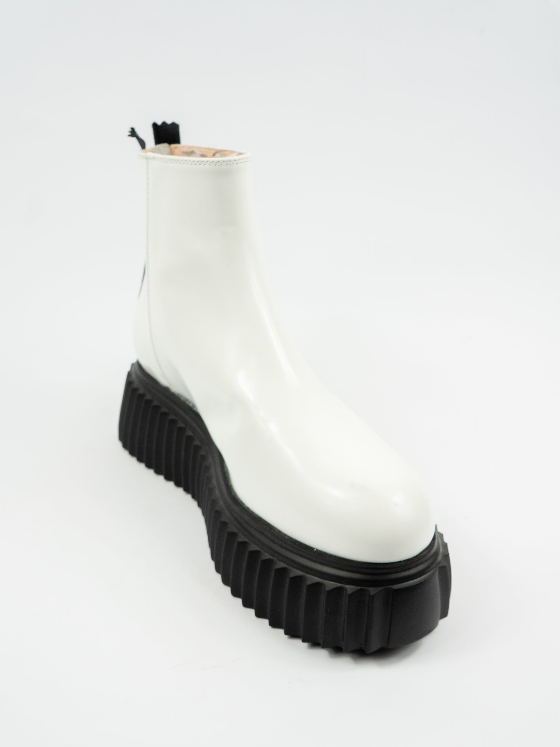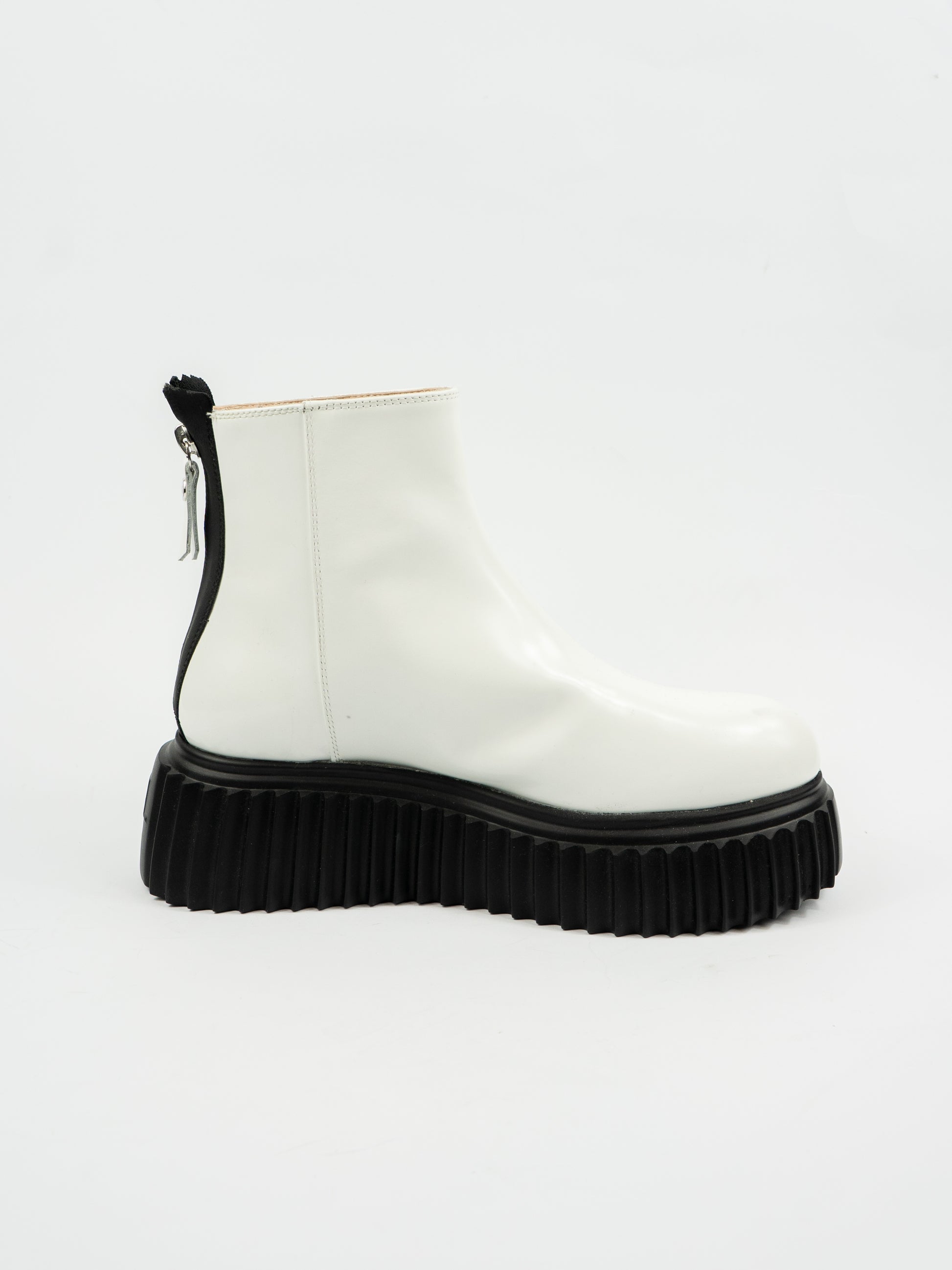 Balti ādas zābaki ar rievotu zoli un rāvēju aizmugurē.