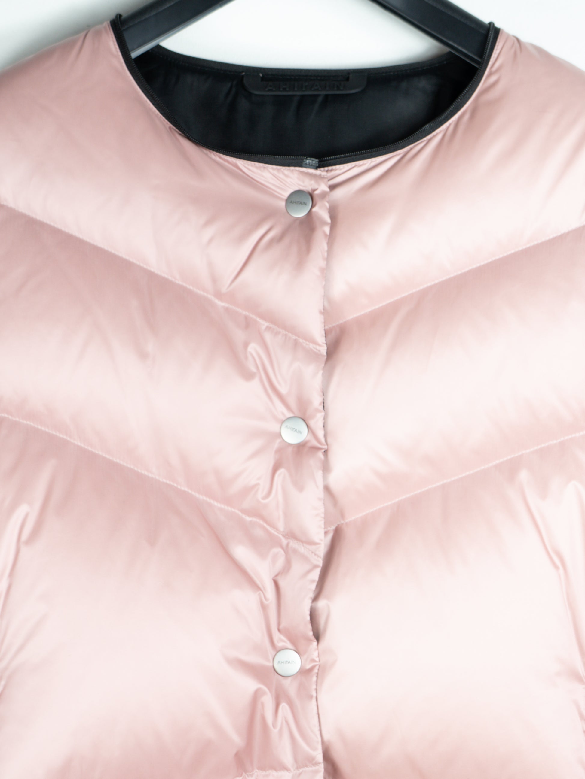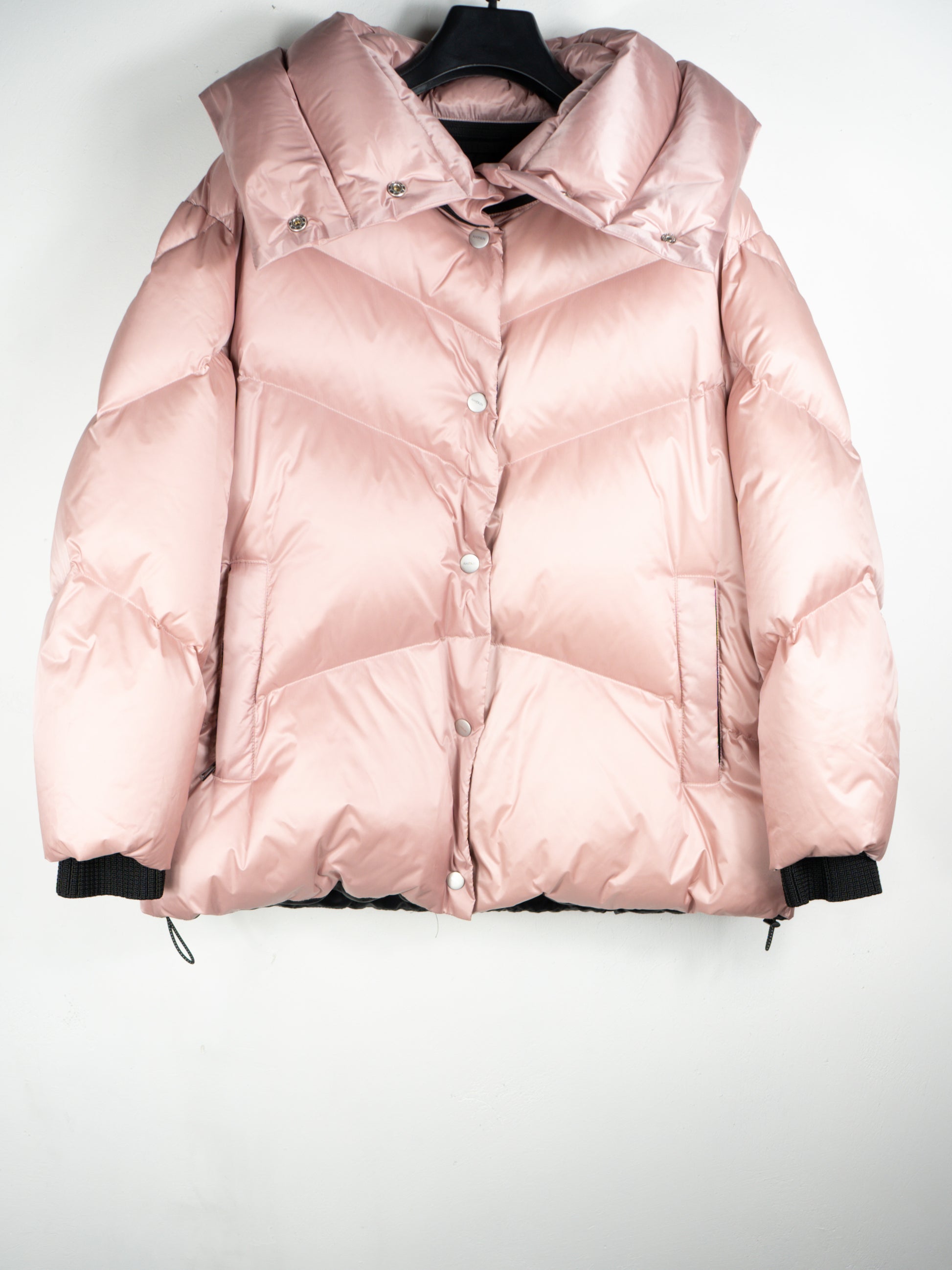 Gaiši rozā jaka ar dūnu pildījumu. Noņemama kapuce, kuru var nomainīt uz apkakli. Ar spiedpogām un savelkamu apakšdaļu. 60% poliesters, 40% poliamīds; 70% dūnas, 30% spalvas.