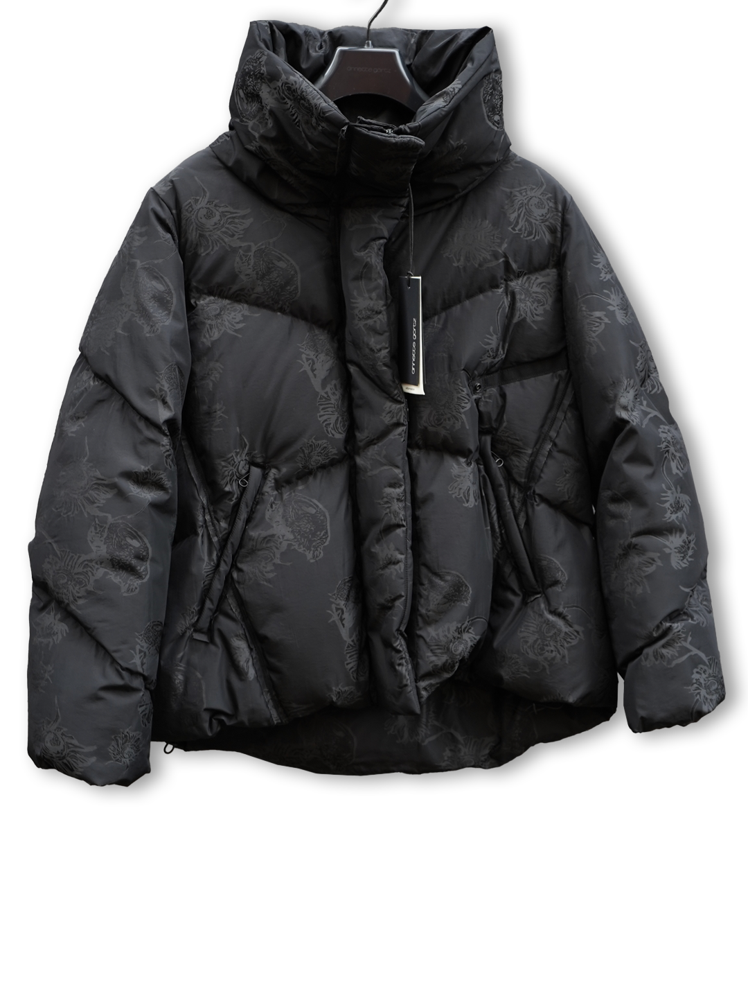 Melna jaka ar rāvēju un spiedpogām. Ziedu raksts. Savelkama apakšdaļa un viduklis. Jaku var valkāt arī citā veidā - pagriežot to no apakšas uz augšu. Pārstrādātas dūnas. 61% poliamīds, 39% poliesters. 90% dūnas, 10% spalvas.