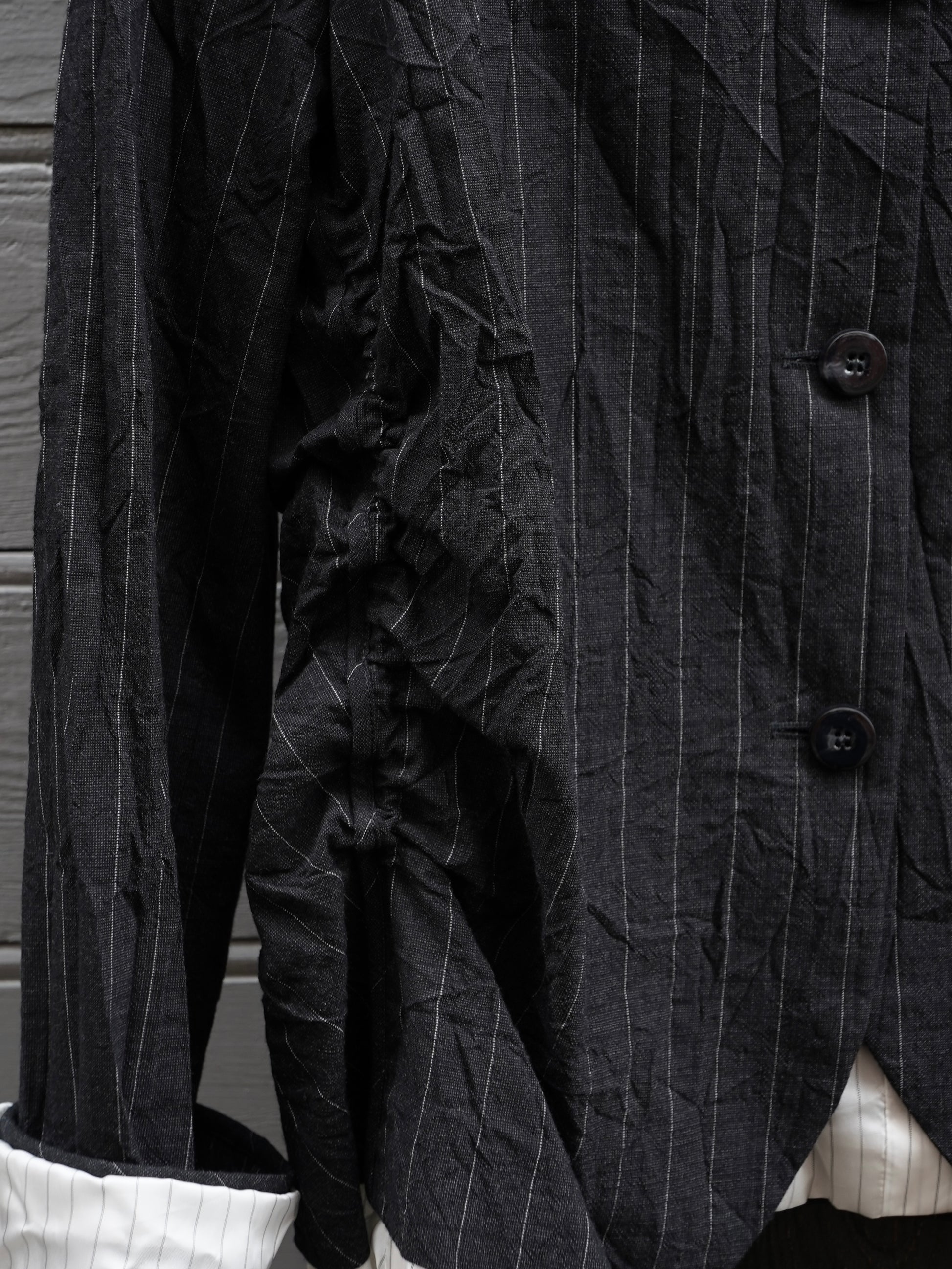 Tumša žakete ar strīpām un baltu oderi. Labais sāns savilkts. Burzīts audums. 74% kokvilna, 26% vilna; 100% viskoze.