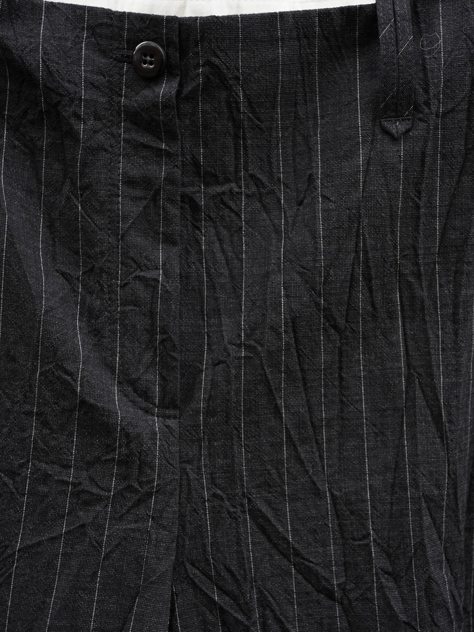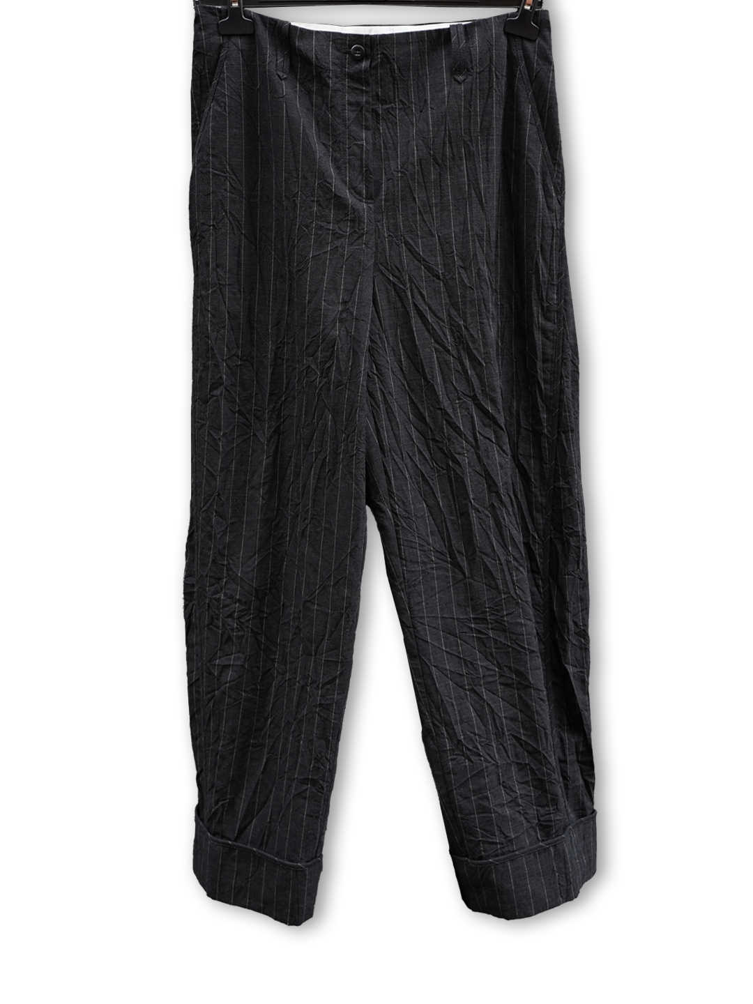 Tumšas, platas bikses ar svītrām. Burzīts audums. 74% kokvilna, 26% vilna.