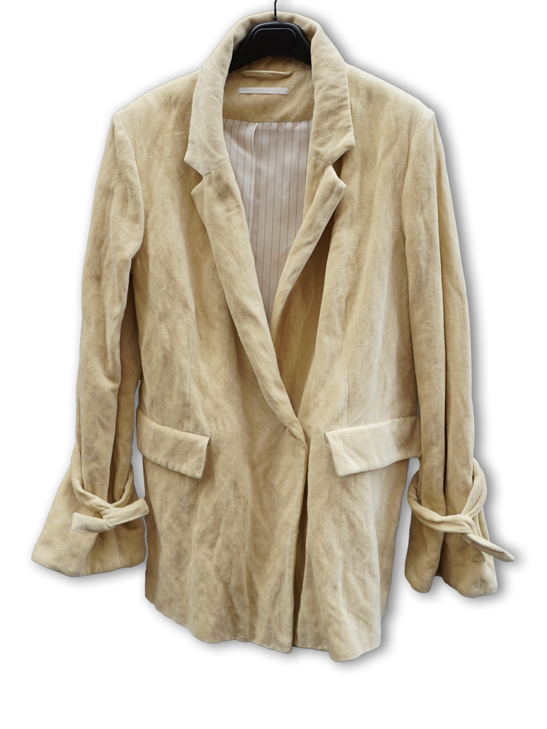 Dzeltena samta žakete ar šķēlumiem sānā. Piedurknes elemens no stieples. 92% kokvilna, 8% metāls; 100% viskoze.