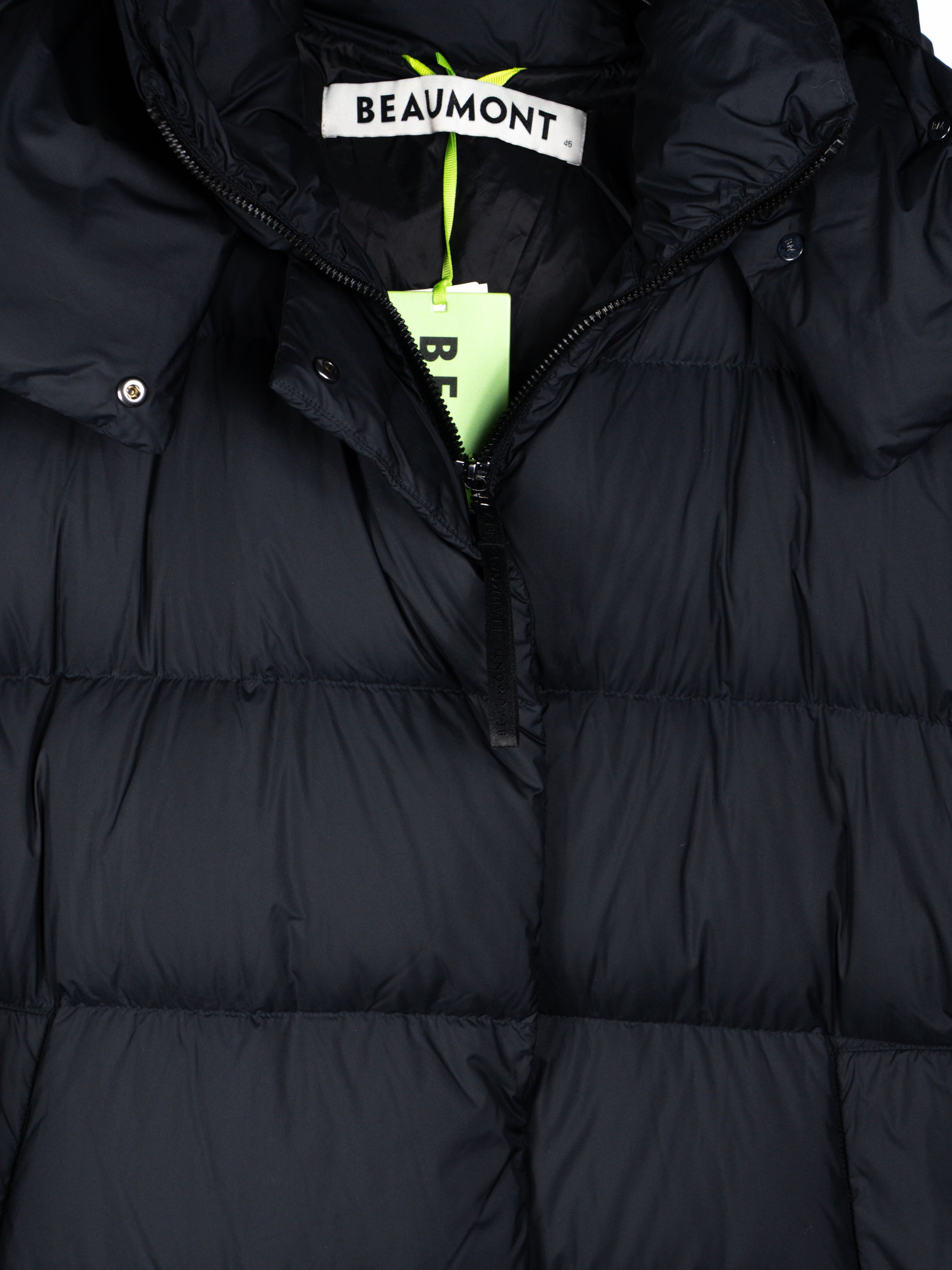 Melna jaka ar premium kvalitātes dūnu pildījumu. Ar rāvēju un spiedpogām. Kapuce noņemama. 90% dūnas, 10% spalvas.