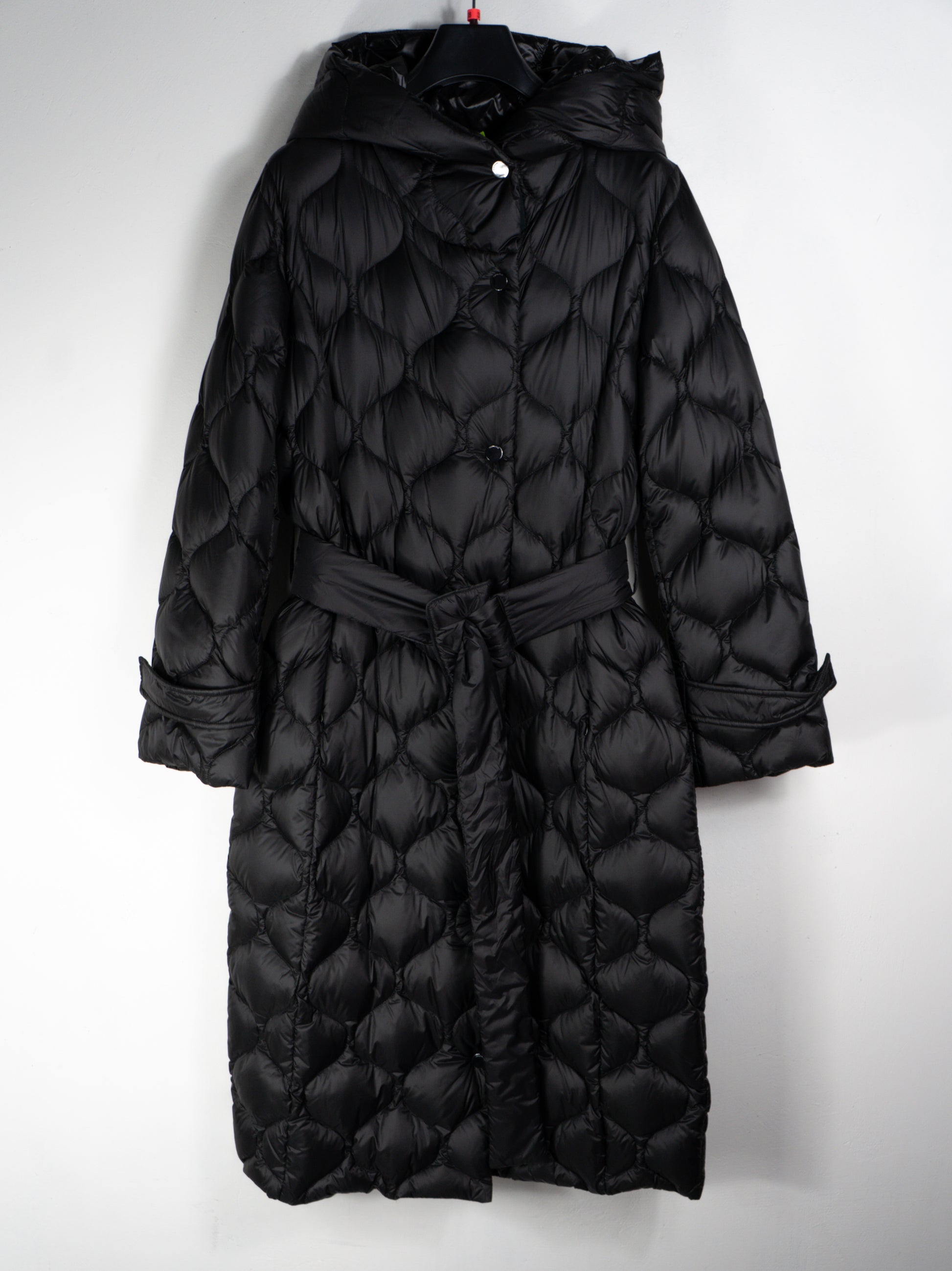 Dūnu mētelis rāvēju un spiedpogām, kapuci un jostu. 90% dūnas, 10% spalvas.