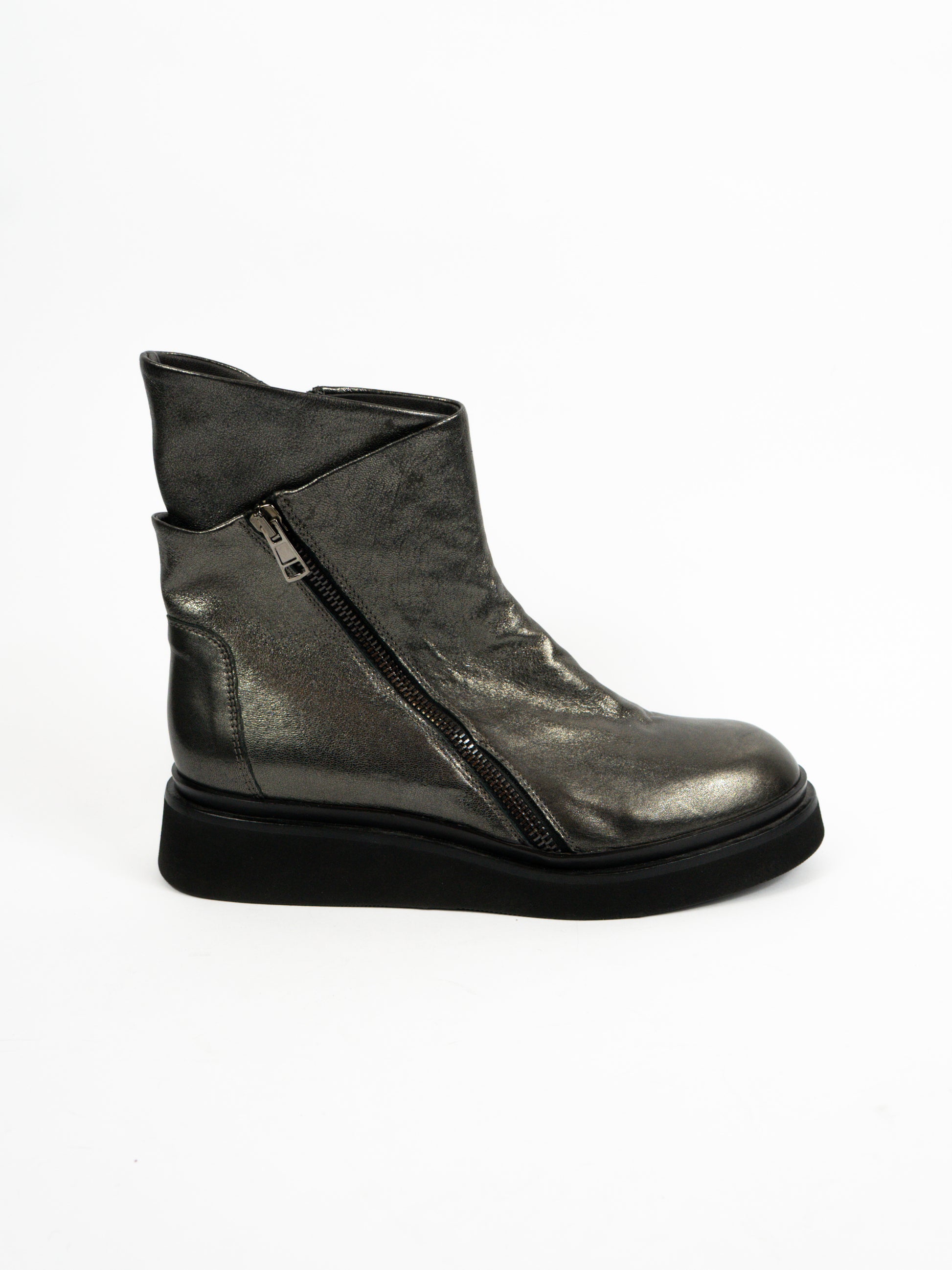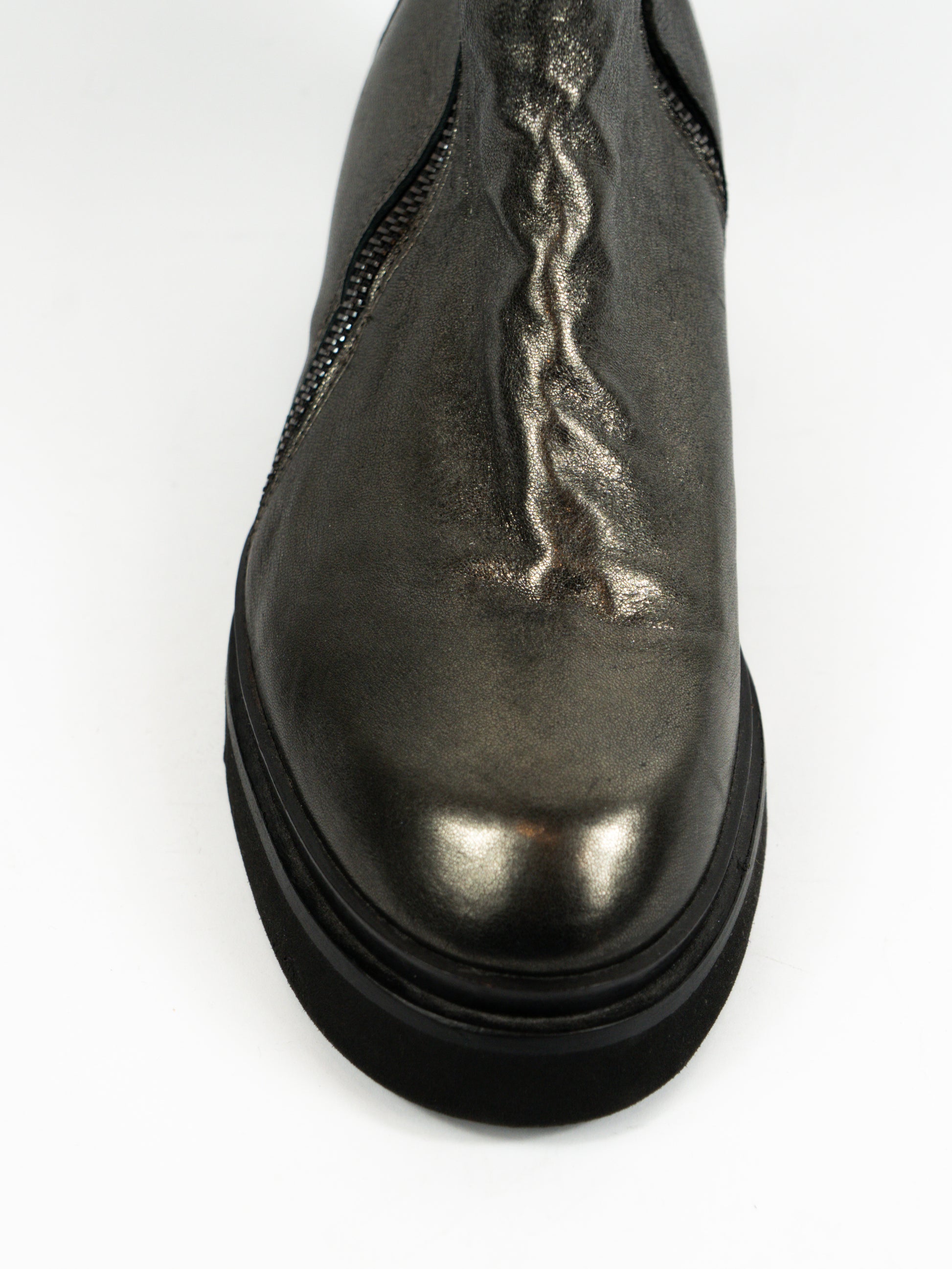 Pelēki ādas zābaki ar spīdumu. Sānos rāvēji.