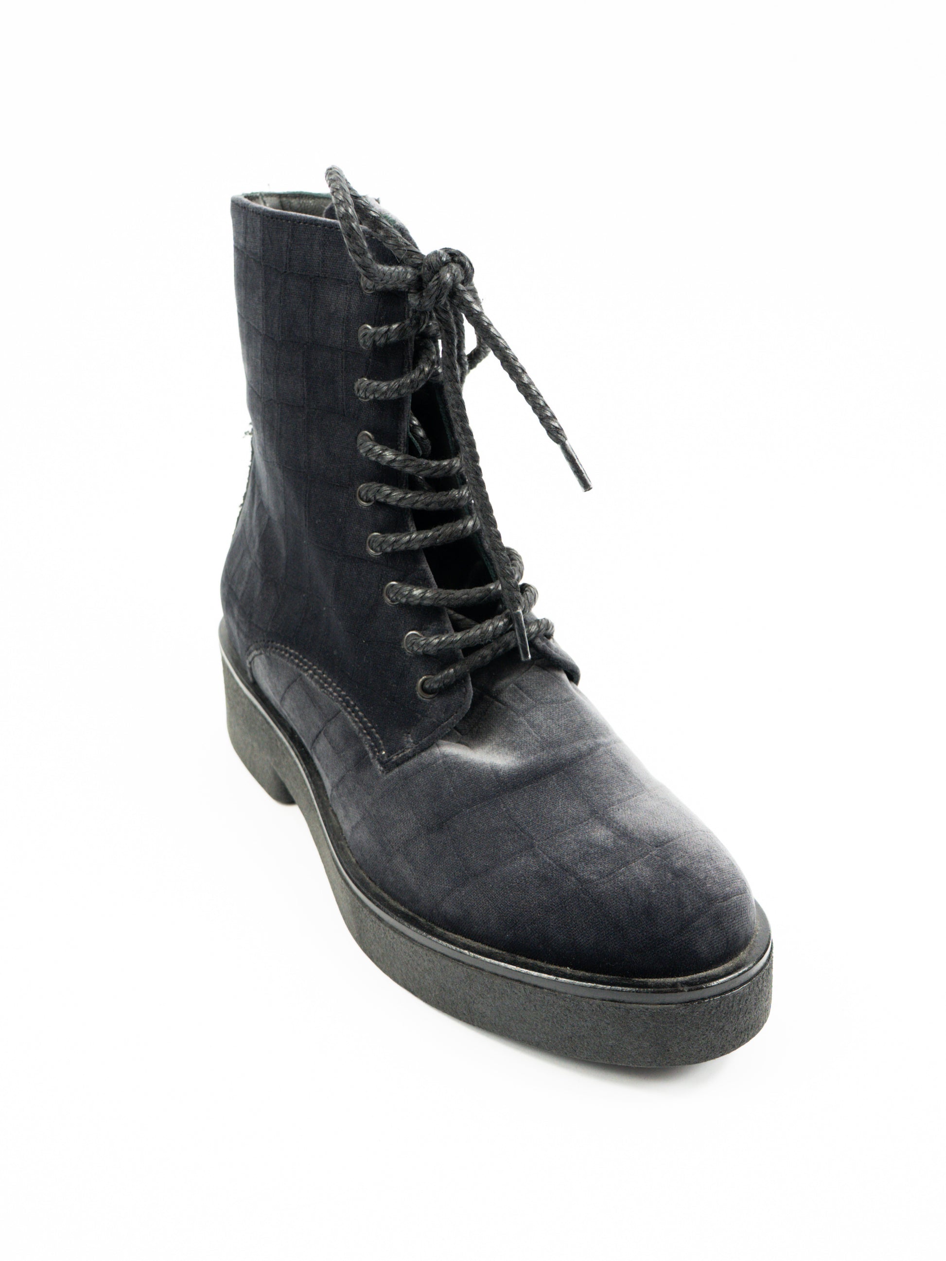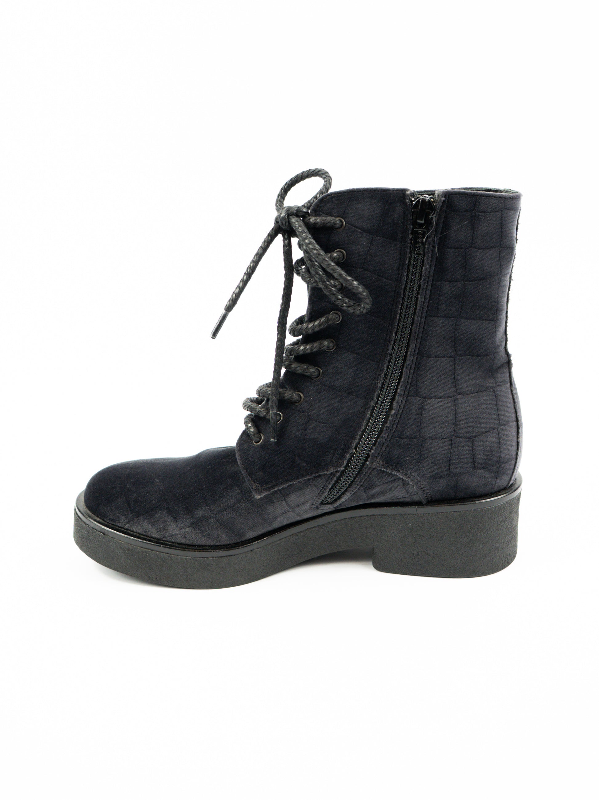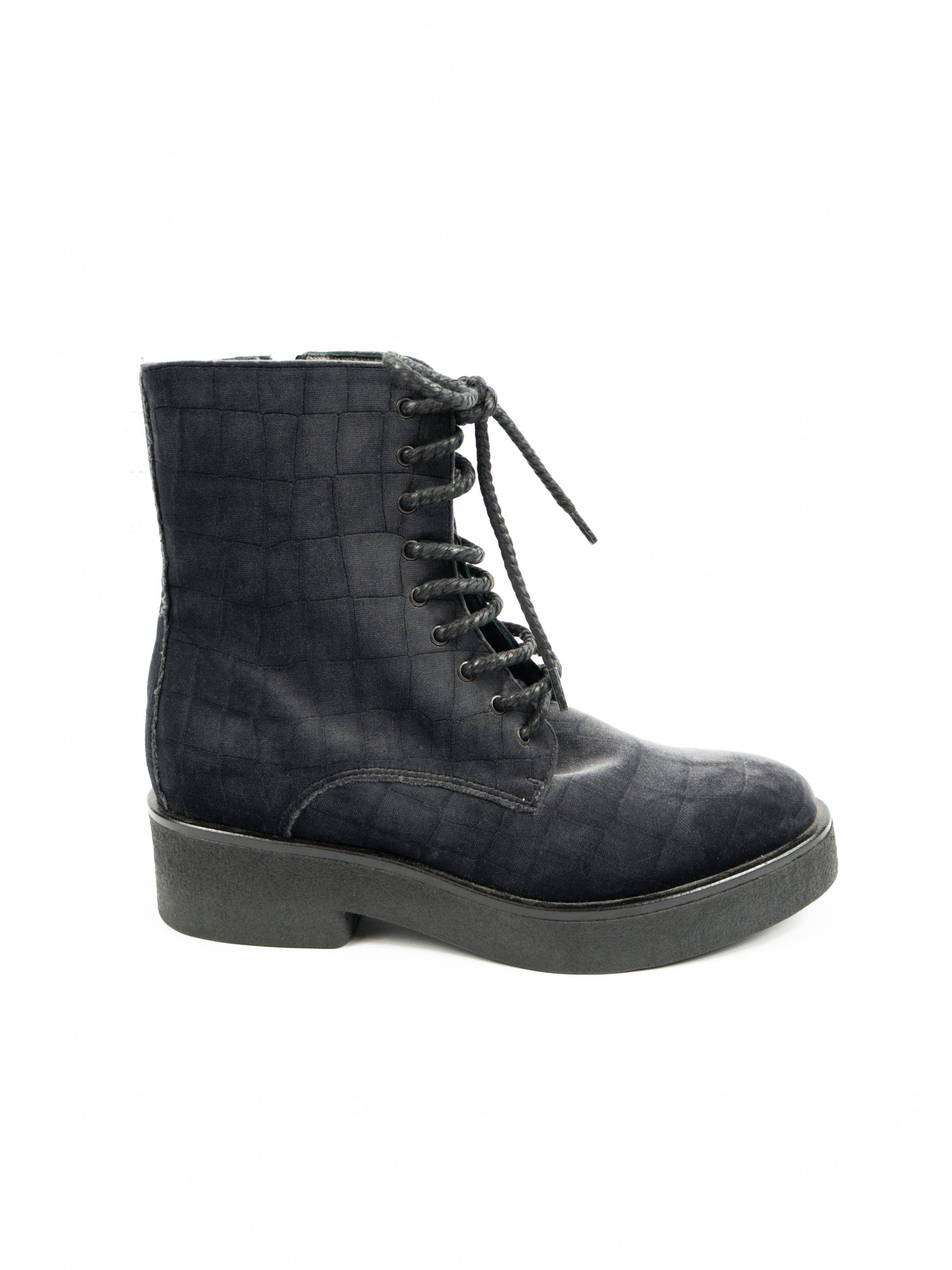 Pelēki samta šņorzābaki ar ādas iekšpusi. Sānā rāvējs.
