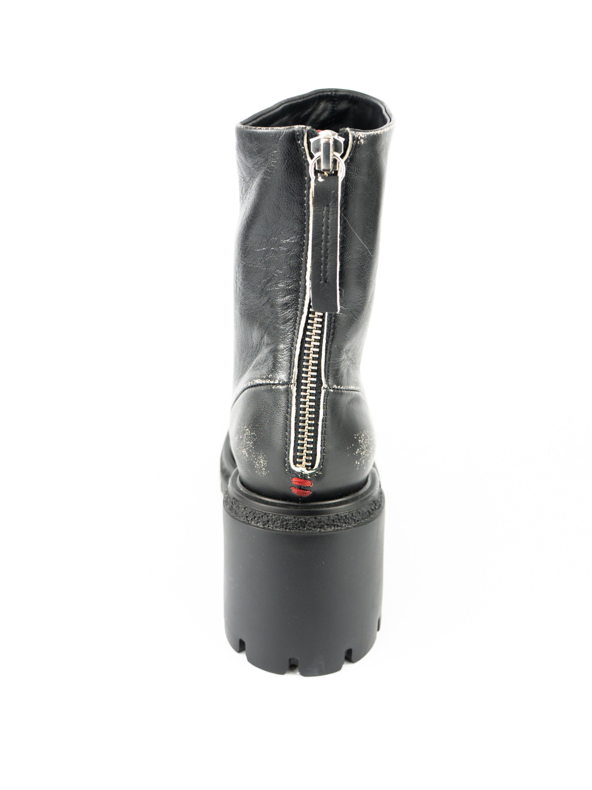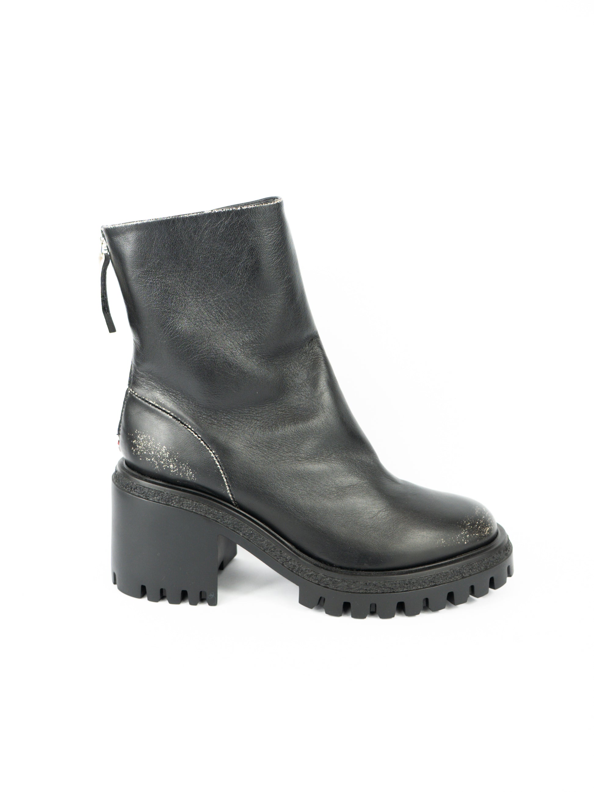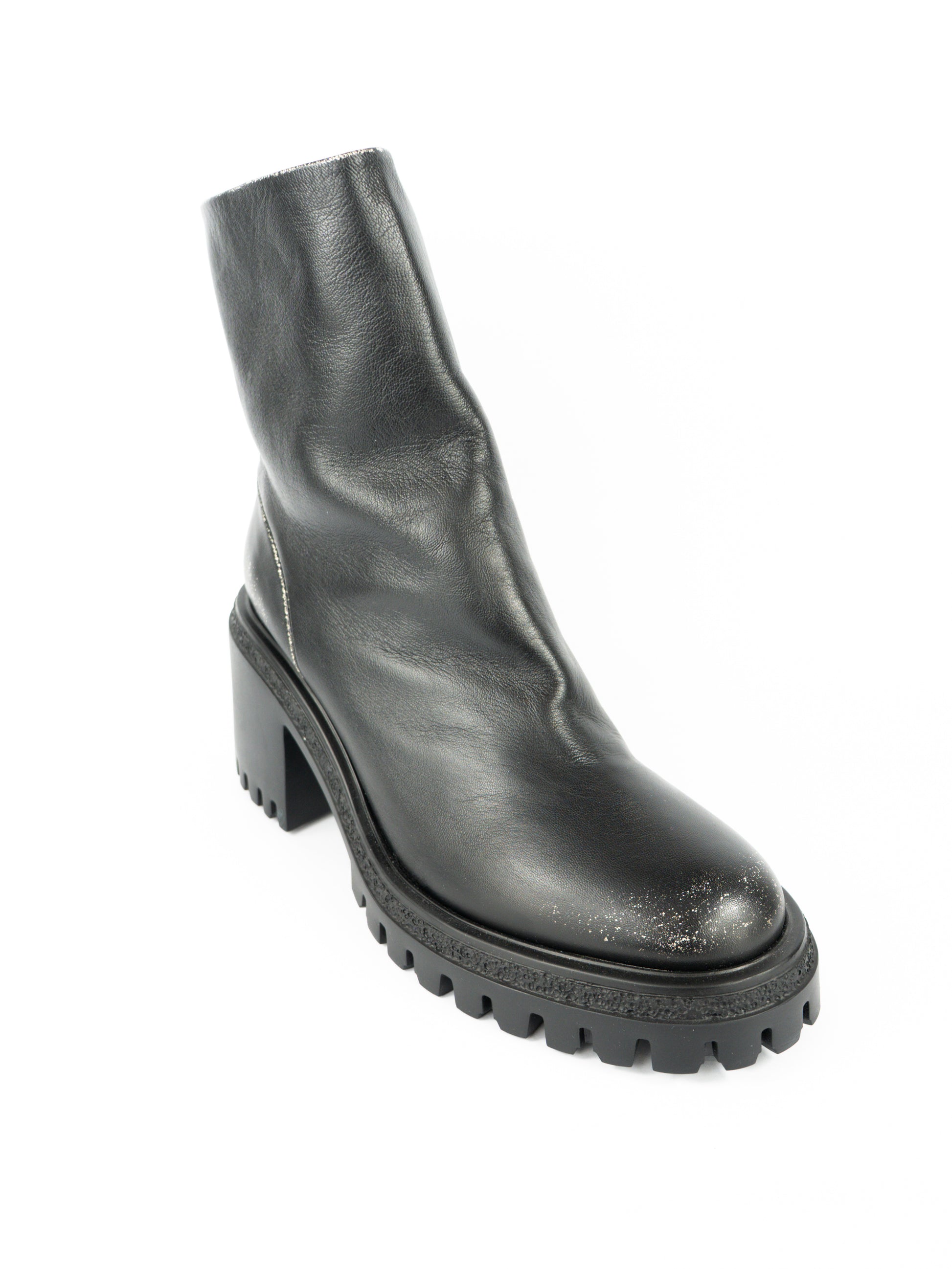 Melni ādas zābaki ar vecinātu efektu, rāvēju aizmugurē. Āda ir mīksta.