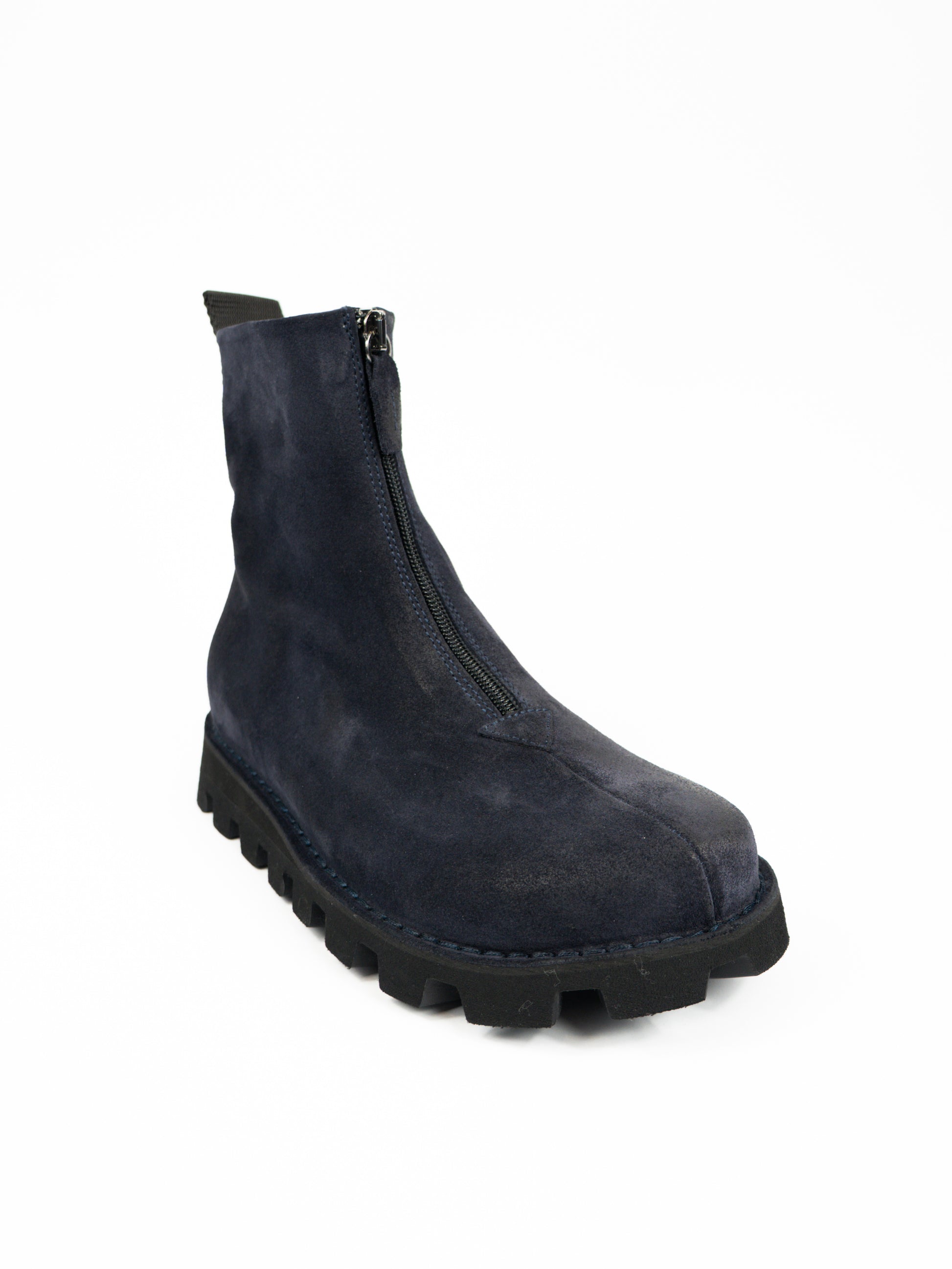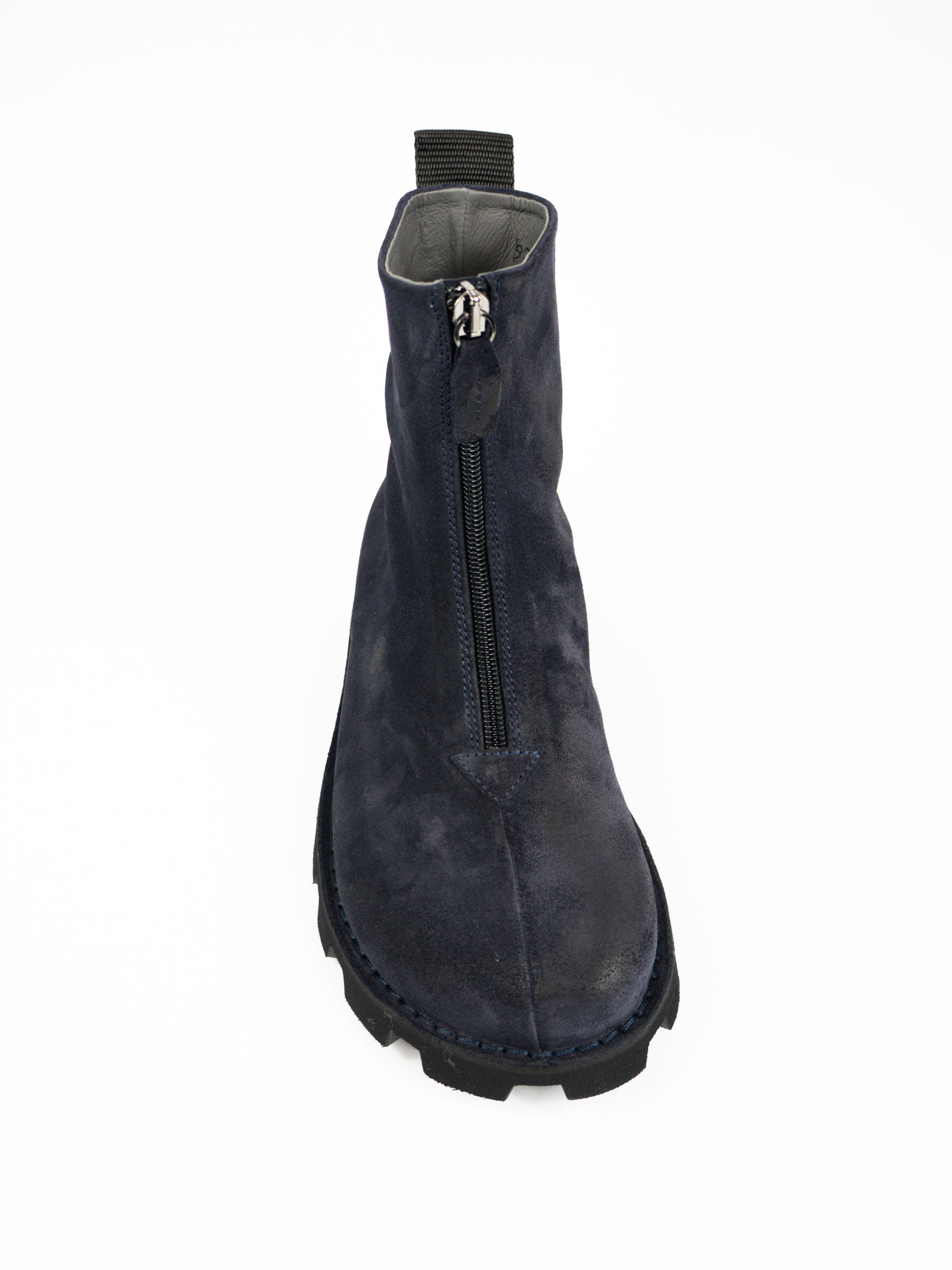 Tumši zili zamšādas zābaki ar rāvēju priekšpusē.