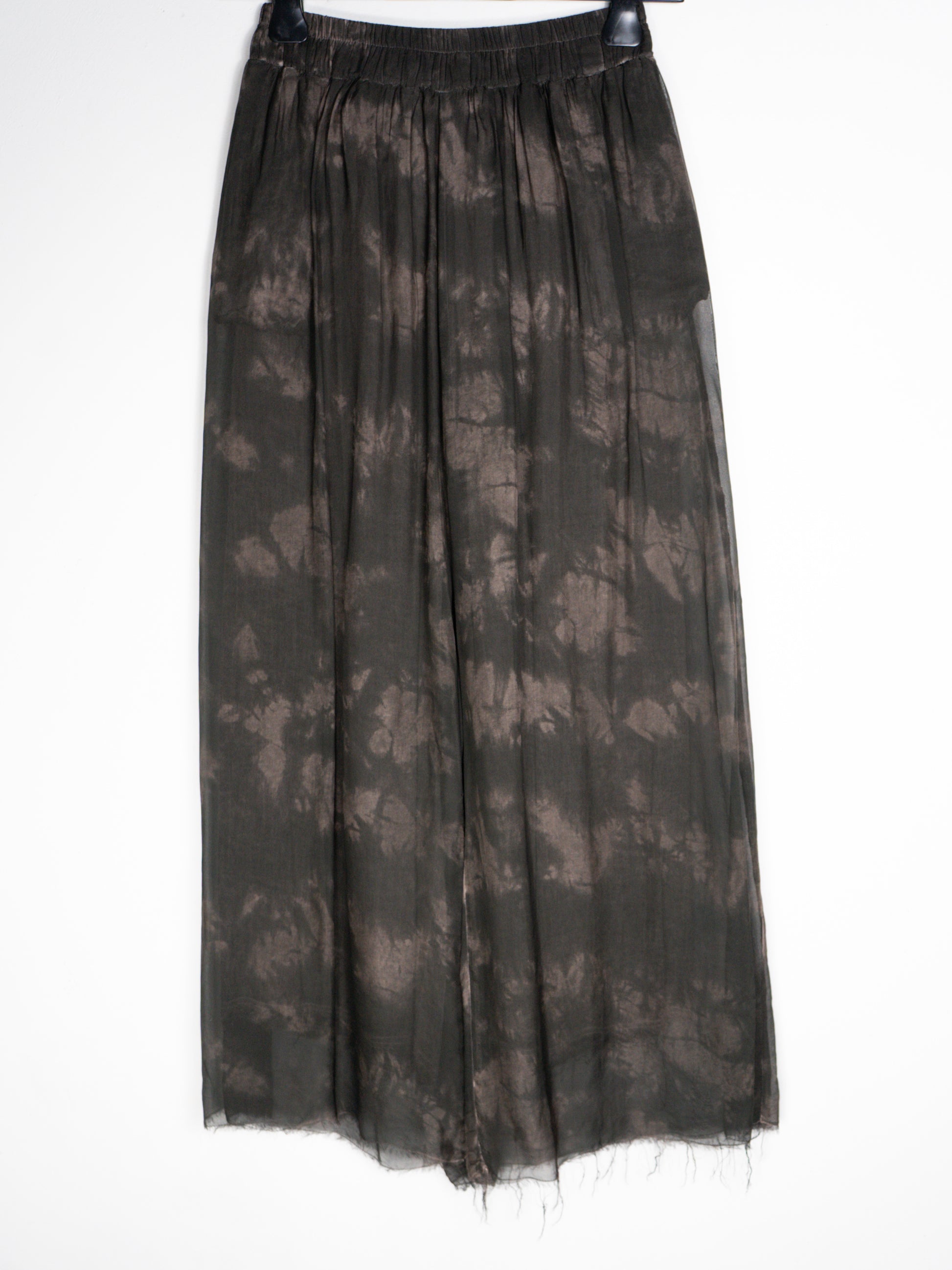 Platas, brūnas bikses ar gumiju viduklī un kabatām sānos. Ar oderi. 70% viskoze, 30% zīds; 80% viskoze, 20% vilna.