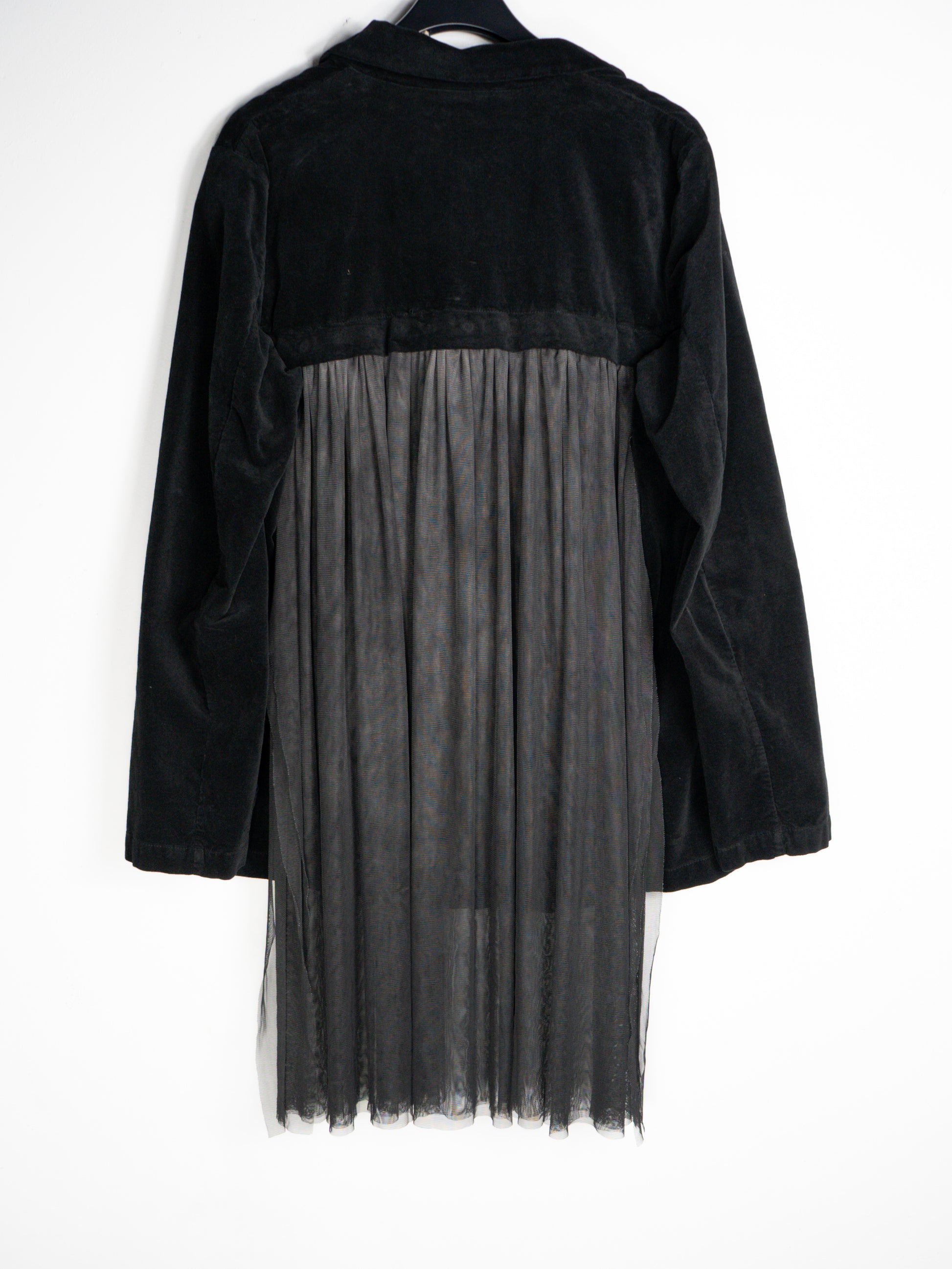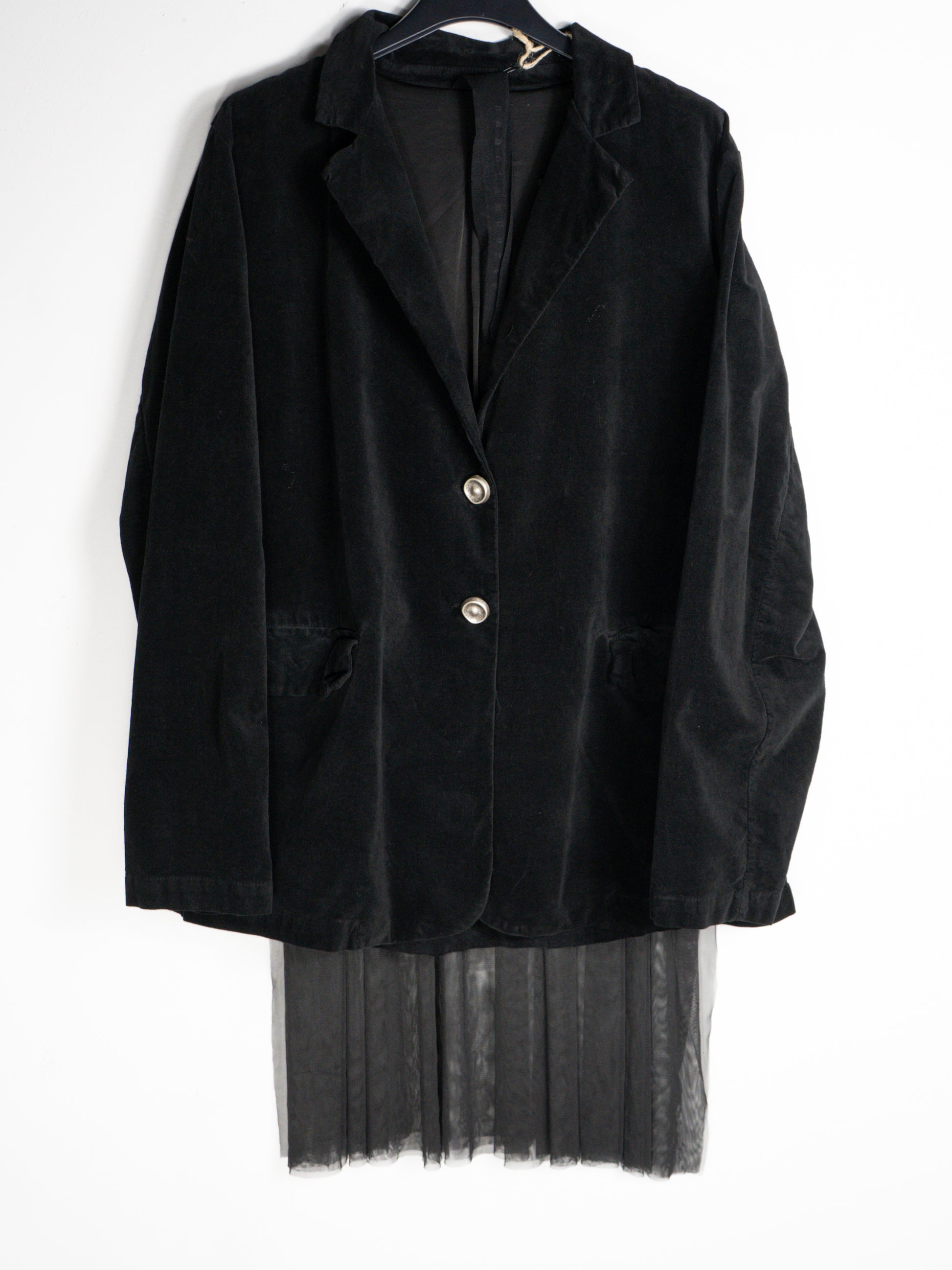 Melna samta žakete ar noņemamu tilla elementu. 97% kokvilna, 3% elastāns; 100% poliesters.