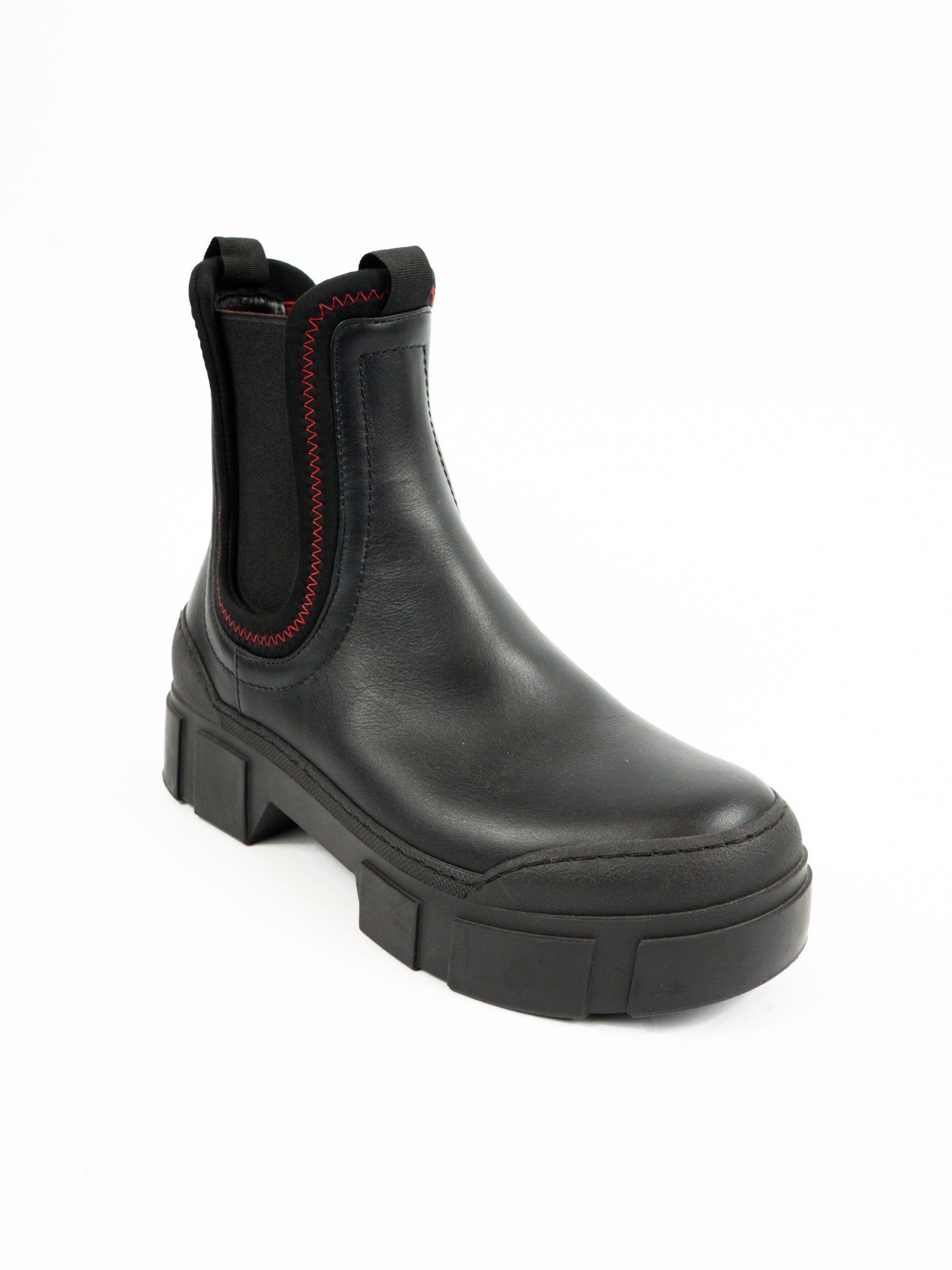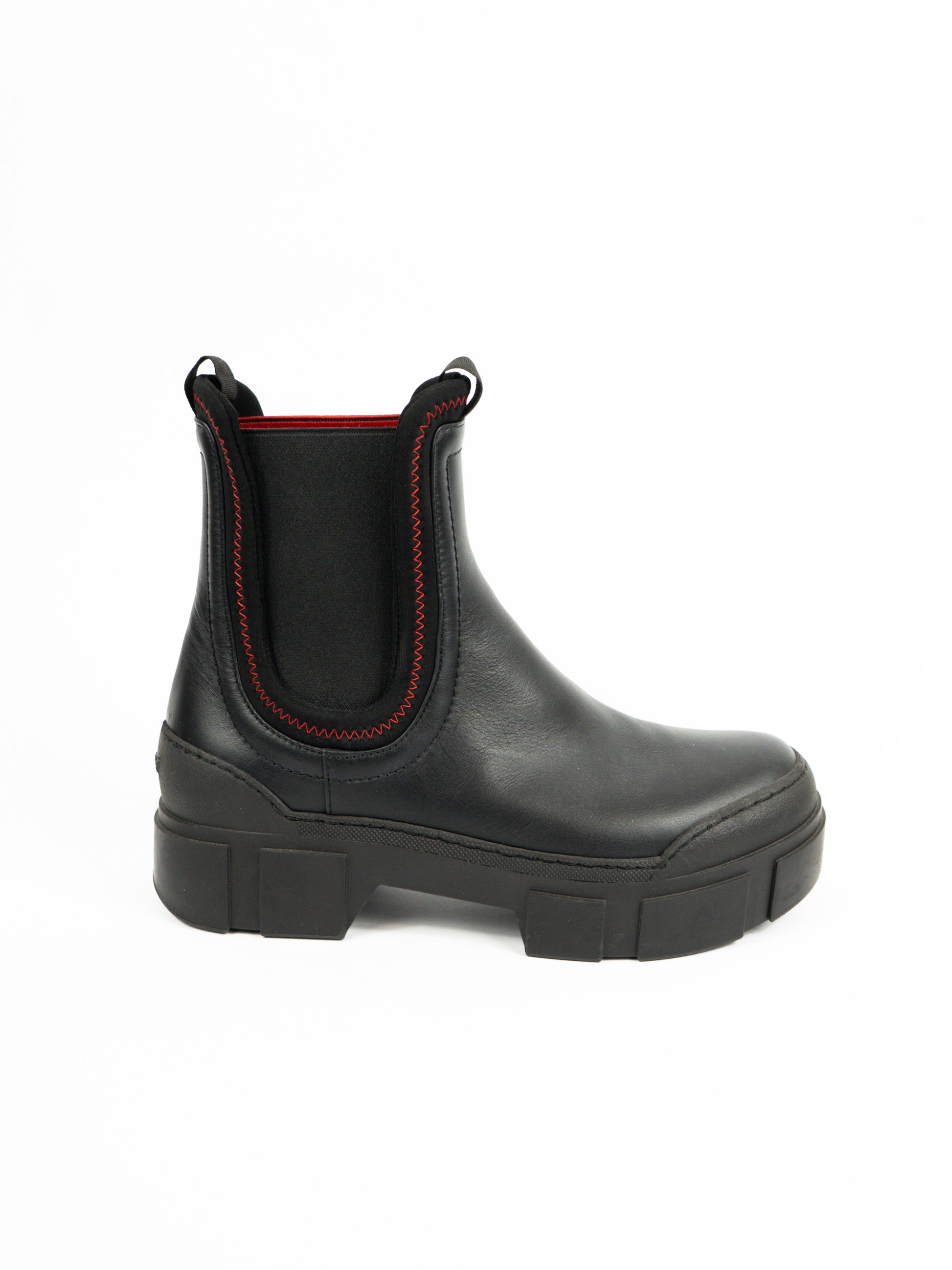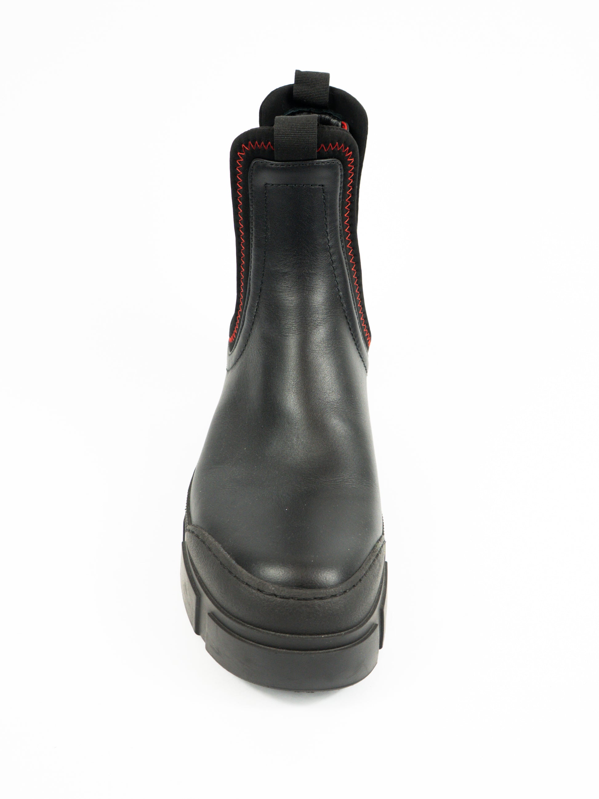 Melni ādas zābaki ar sarkanu izšuvumu.