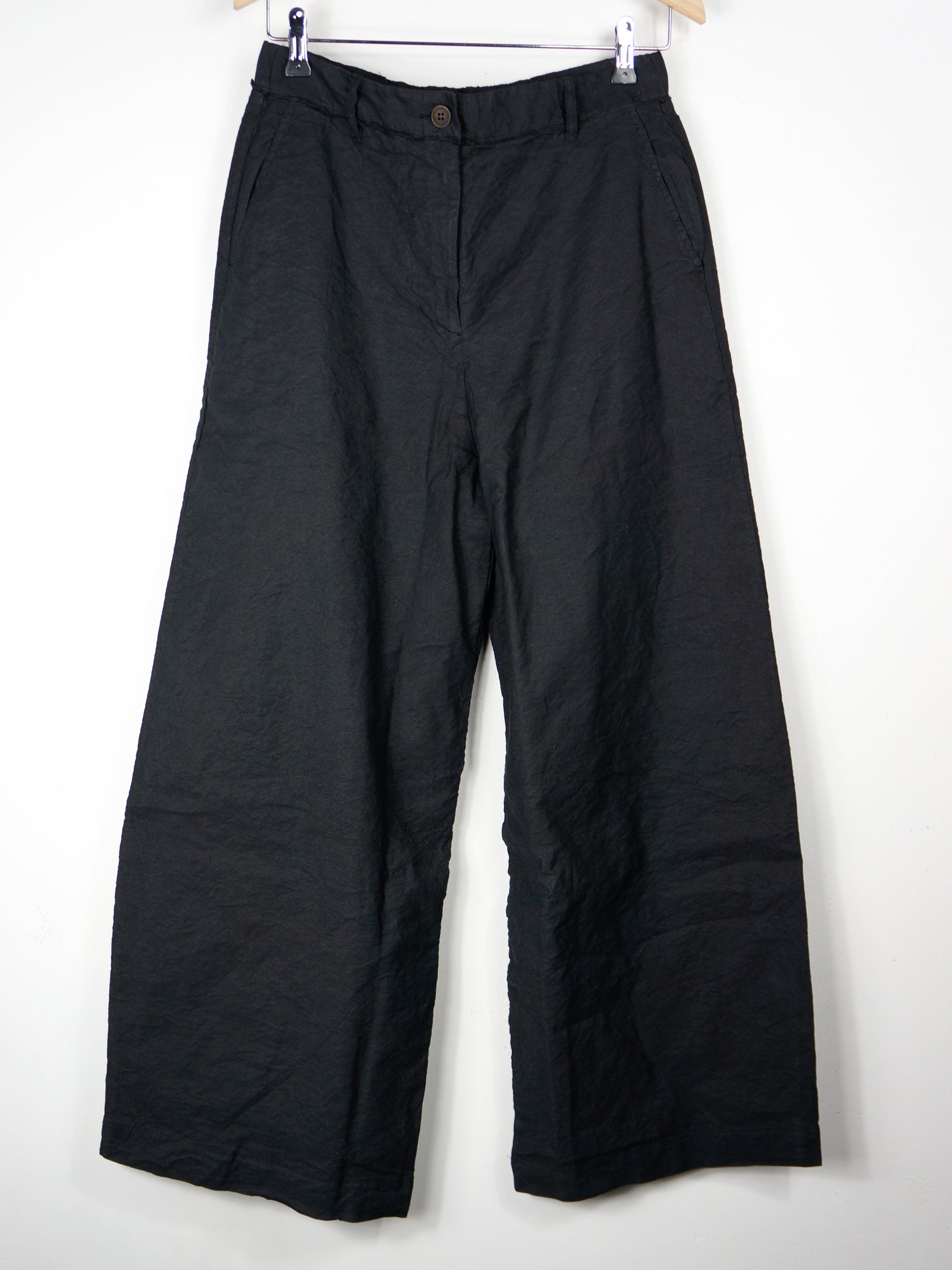 Melnas bikses no burzīta auduma ar nelielu spīdumu. 59% kokvilna, 28% lins, 9% metāla diegs, 4% elastāns; 100% kokvilna (odere).