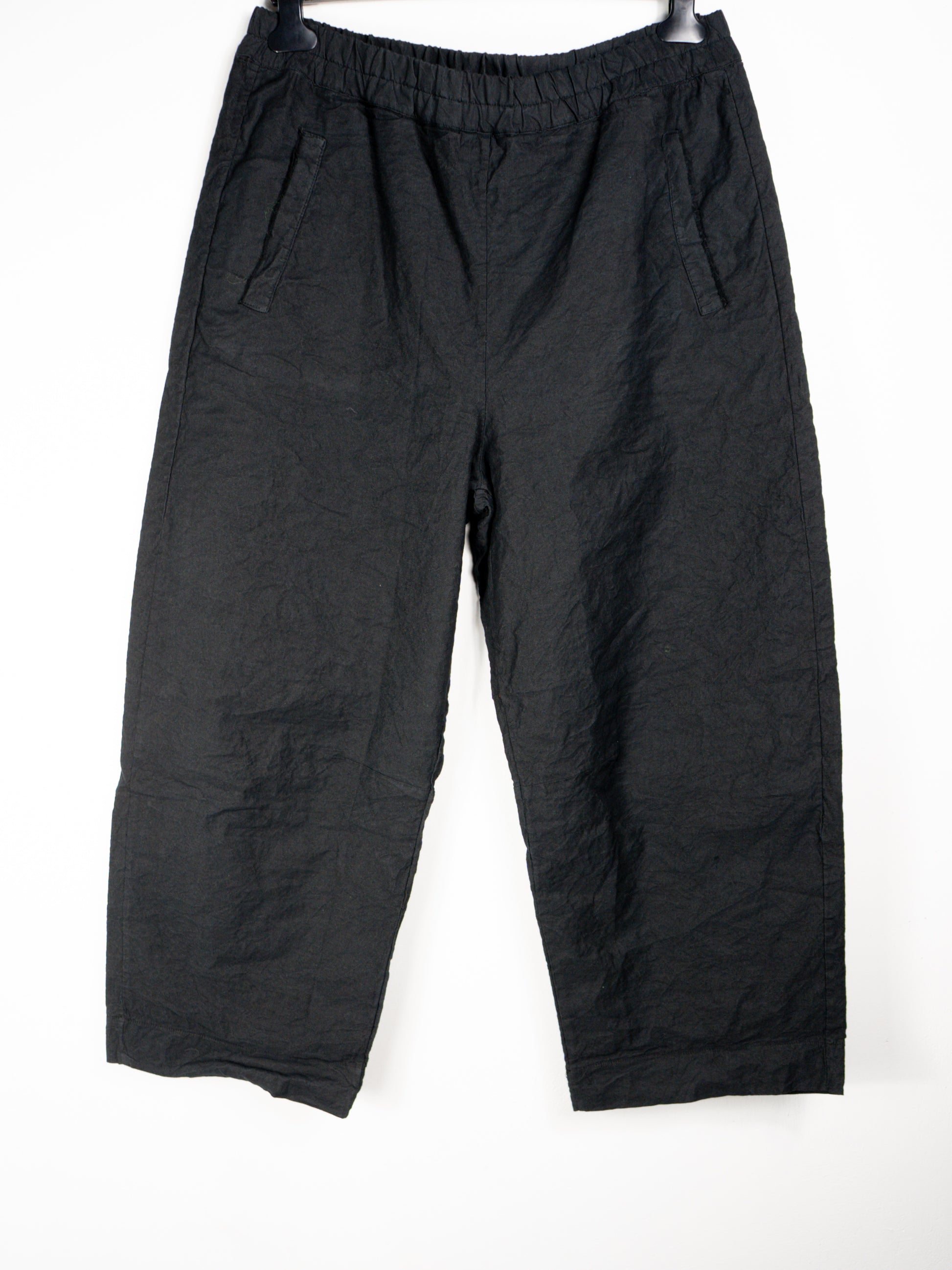 Melnas bikses no burzīta auduma. Ar gumiju. 59% kokvilna, 28% lins, 9% metāla diegi, 4% elastāns. Odere 100% kokvilna.