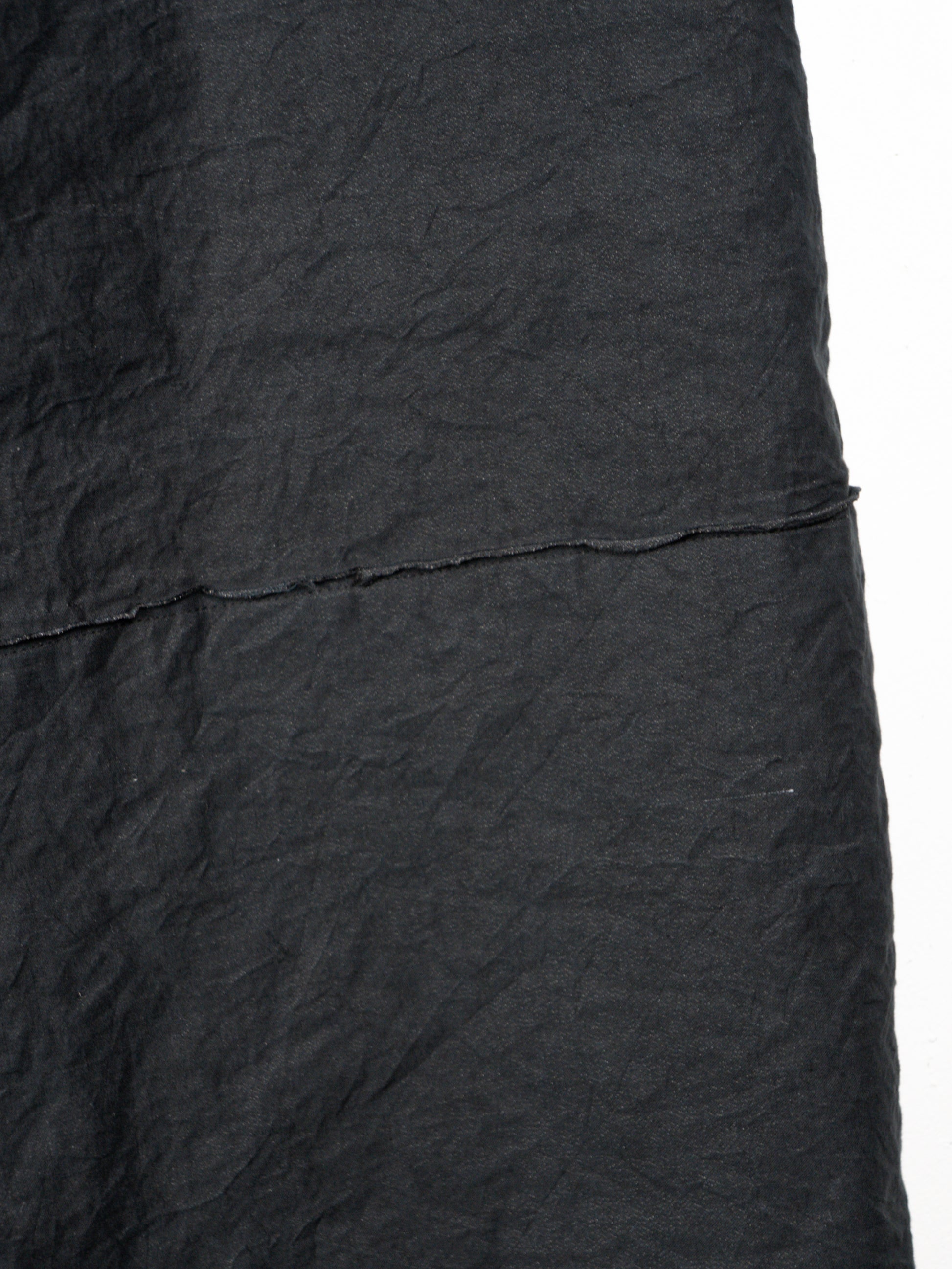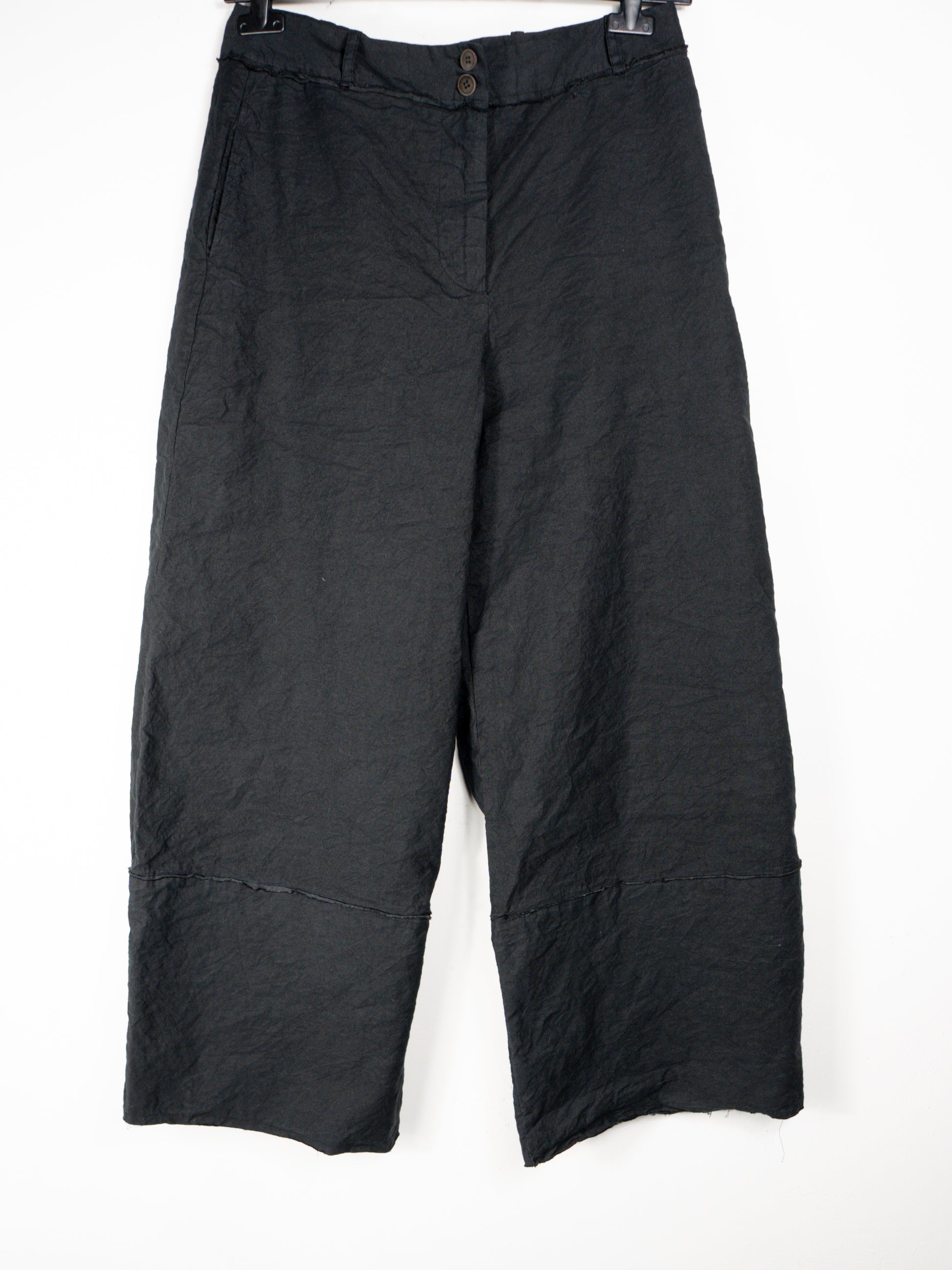 Melnas, platas bikses no burzīta auduma ar neapstrādātām malām. 59% kokvilna, 28% lins, 9% metāla diegi, 4% elastāns. Odere 100% kokvilna.