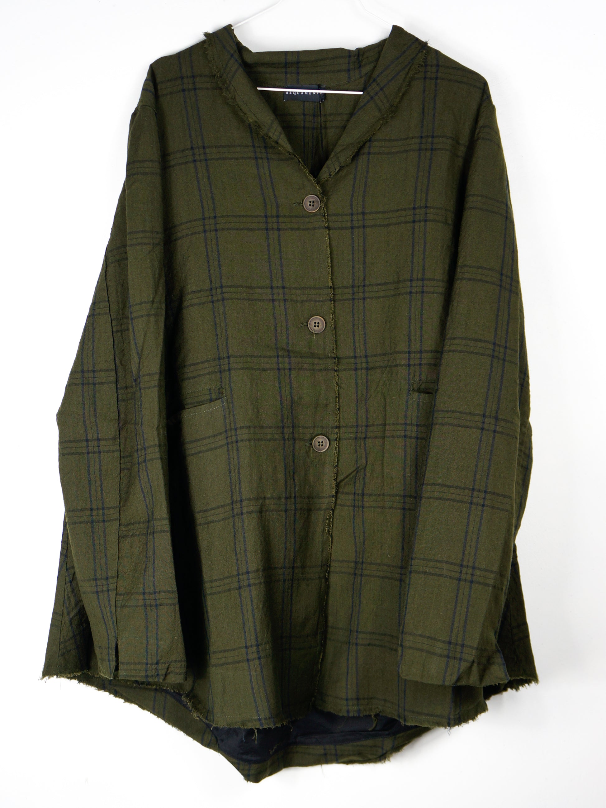 Tumši zaļa žakete ar rūtīm. 61% neapstrādāta vilna (virgin wool), 39% acetāts; 100% kokvilna.