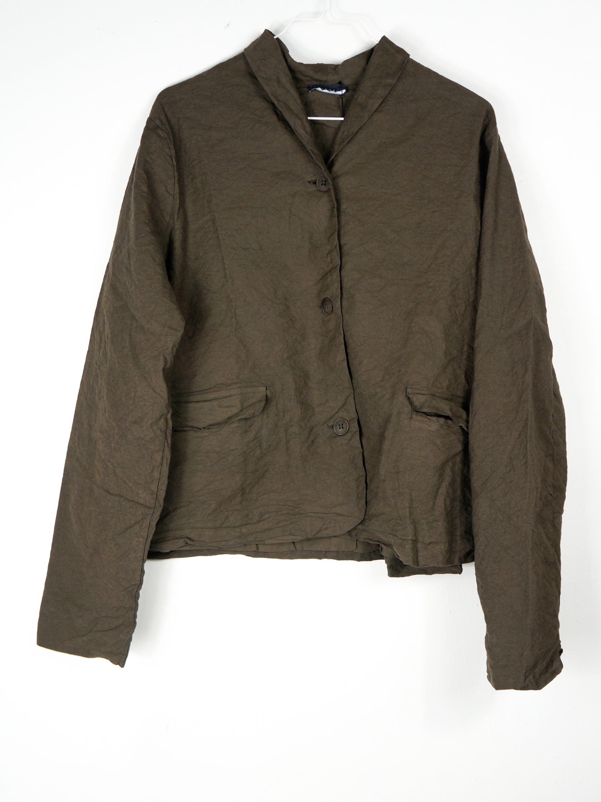 Tumši zaļa žakete no burzīta auduma ar nelielu spīdumu. 59% kokvilna, 28% lins, 9% metāla diegs, 4% elastāns; 100% kokvilna (odere).