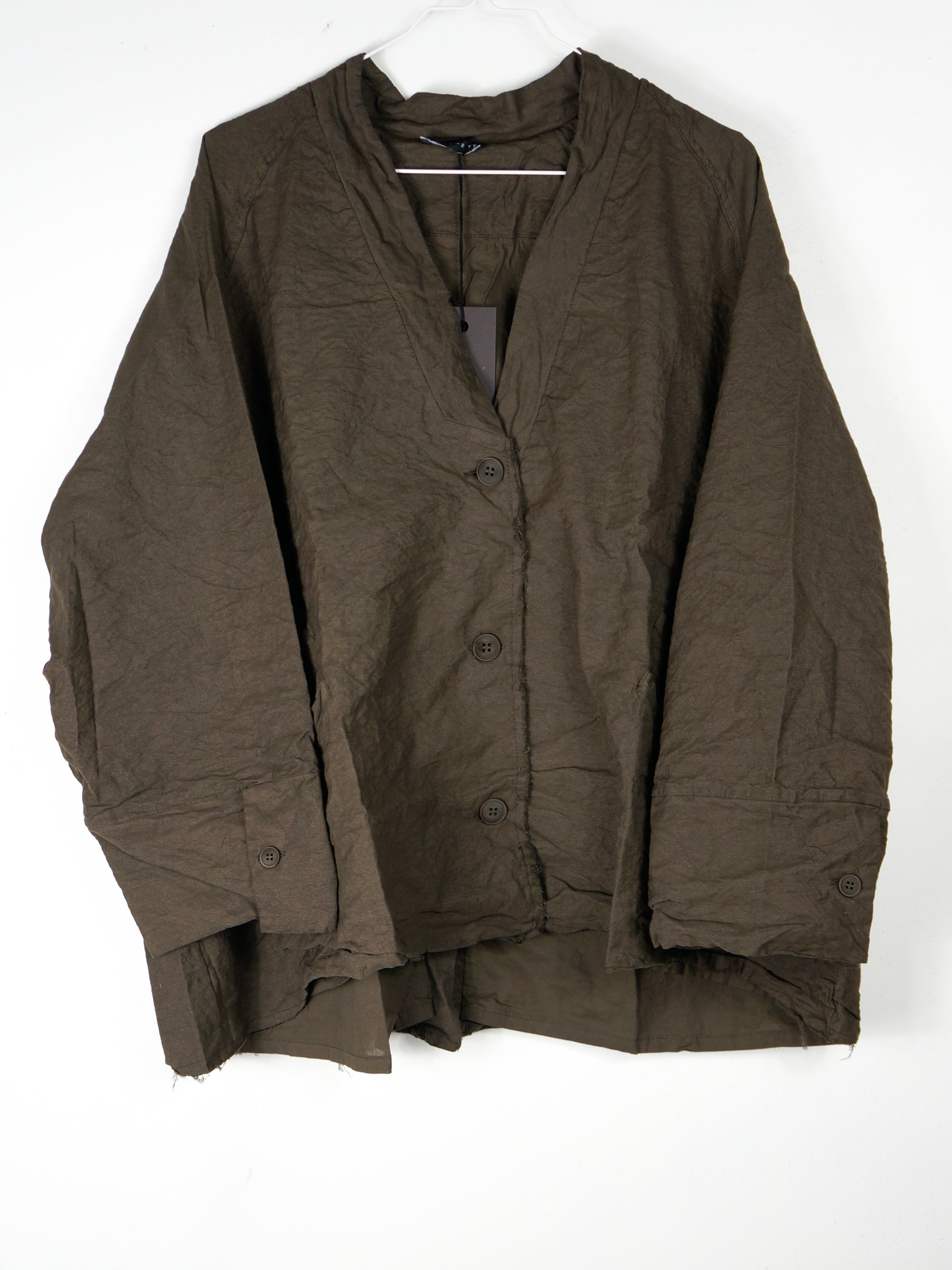 Tumši zaļa žakete no burzīta auduma ar nelielu spīdumu. 59% kokvilna, 28% lins, 9% metāla diegs, 4% elastāns; 100% kokvilna (odere).