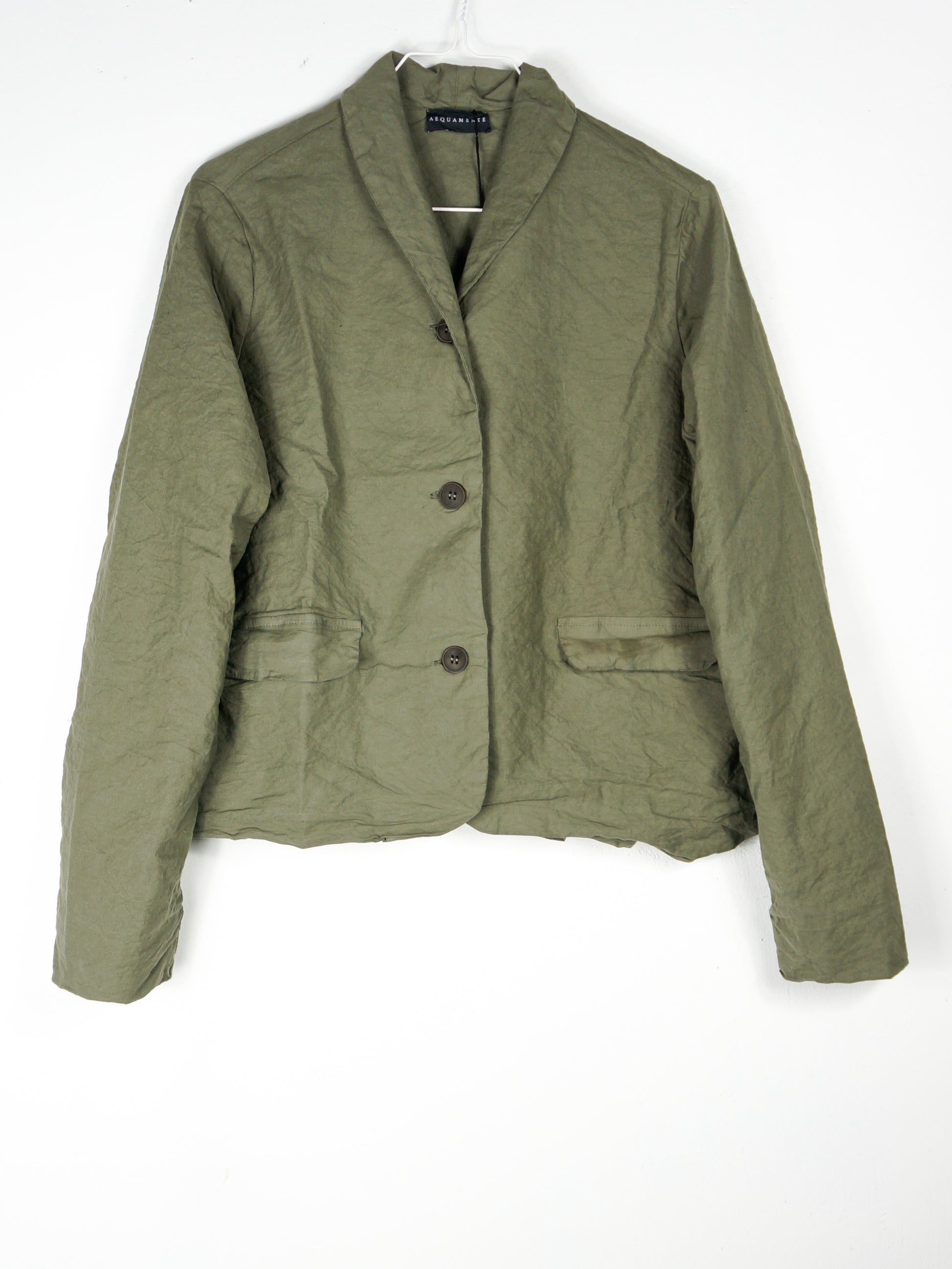 Zaļa žakete no burzīta auduma ar nelielu spīdumu. 59% kokvilna, 28% lins, 9% metāla diegs, 4% elastāns; 100% kokvilna (odere).