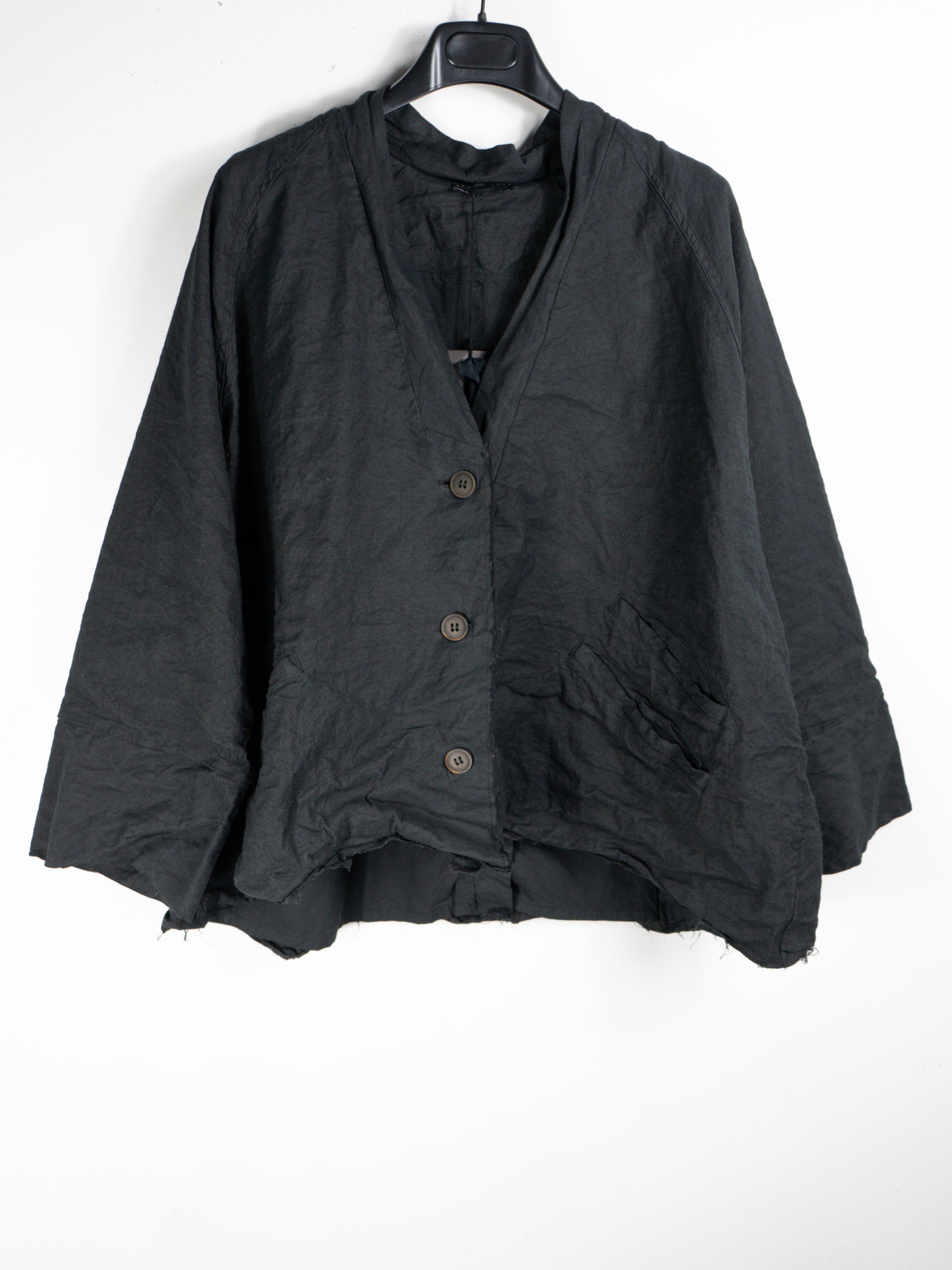 Melna žakete no burzīta auduma. 59% kokvilna, 28% lins, 9% metāla diegi, 4% elastāns. Odere 100% kokvilna.