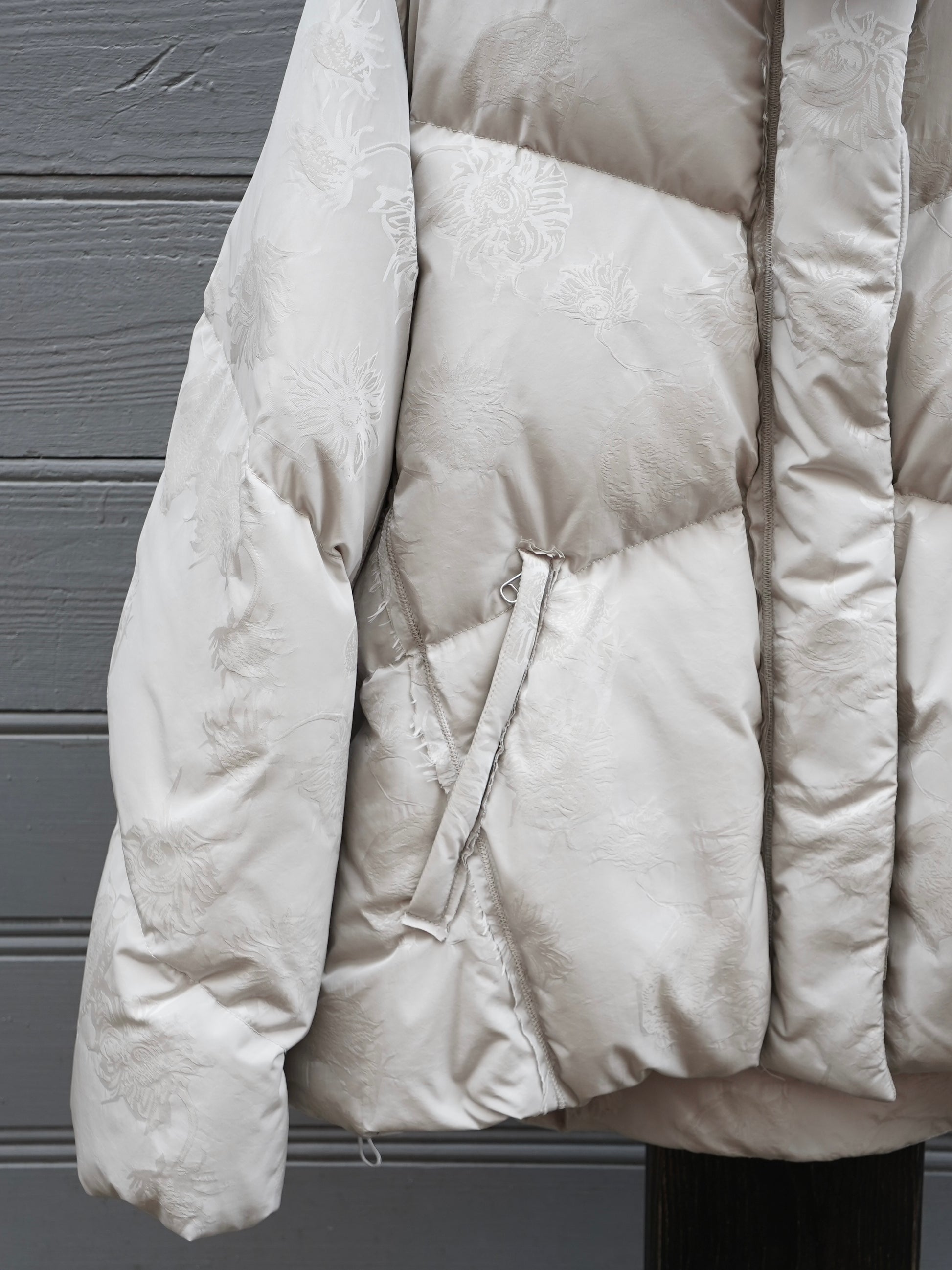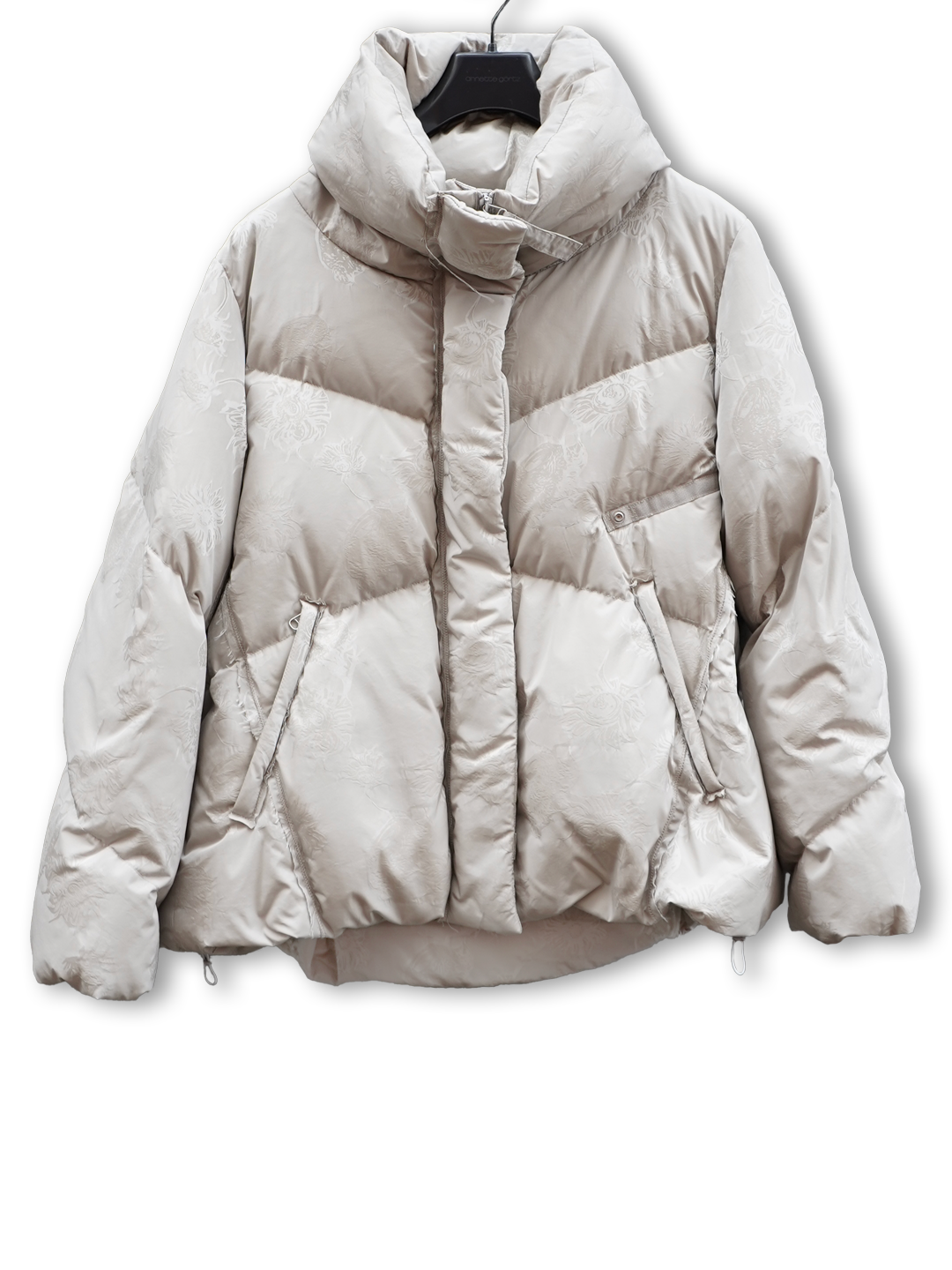 Gaiša jaka ar rāvēju un spiedpogām. Ziedu raksts. Savelkama apakšdaļa un viduklis. Jaku var valkāt arī citā veidā - pagriežot to no apakšas uz augšu. Pārstrādātas dūnas. 61% poliamīds, 39% poliesters. 90% dūnas, 10% spalvas.