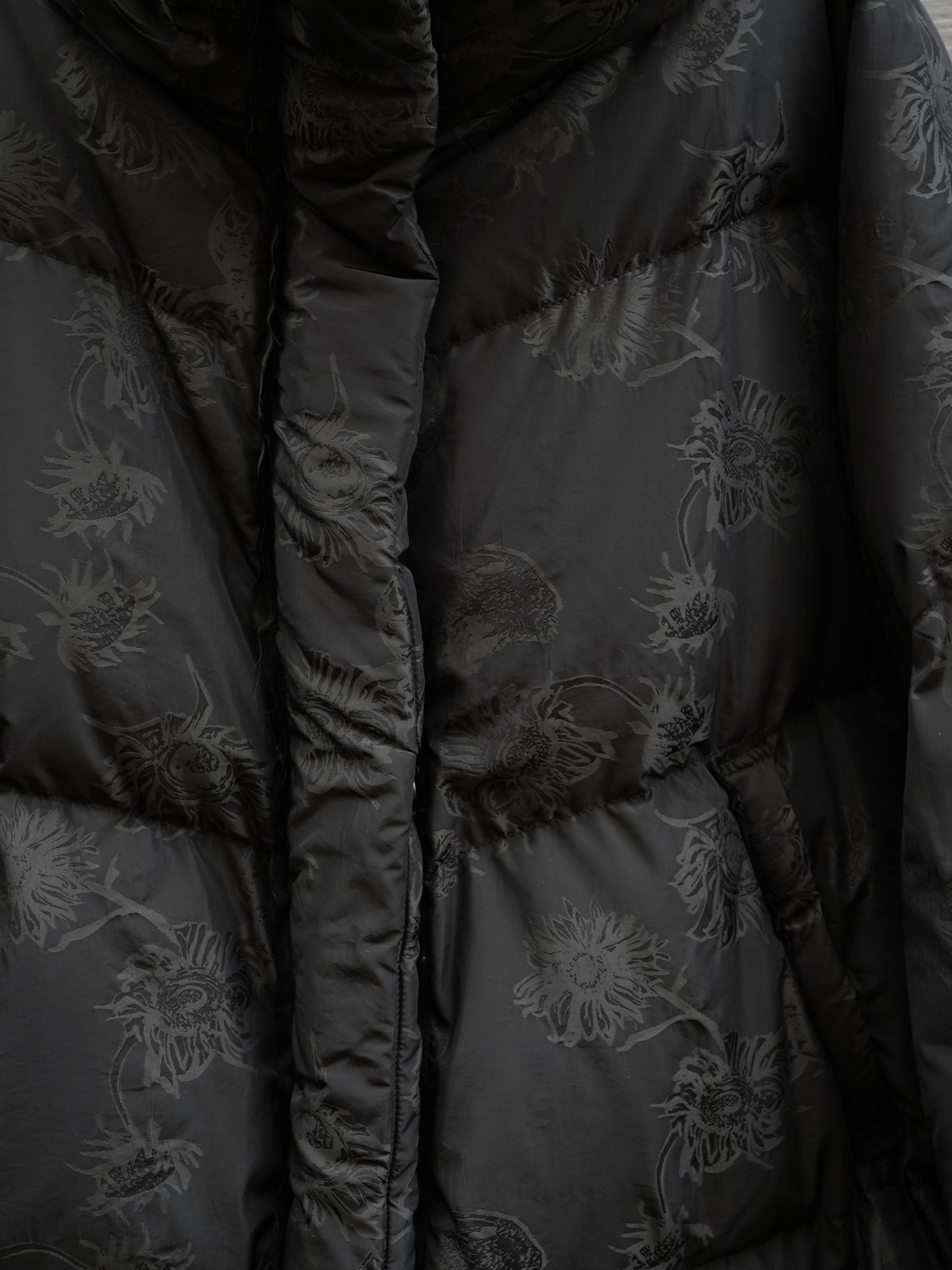 Melns mētelis ar rāvēju un spiedpogām. Ziedu raksts. Sānu apakšdaļā spiepogas, kuras savienojot, veido citu siluetu. Pārstrādātas dūnas. 61% poliamīds, 39% poliesters. 90% dūnas, 10% spalvas.