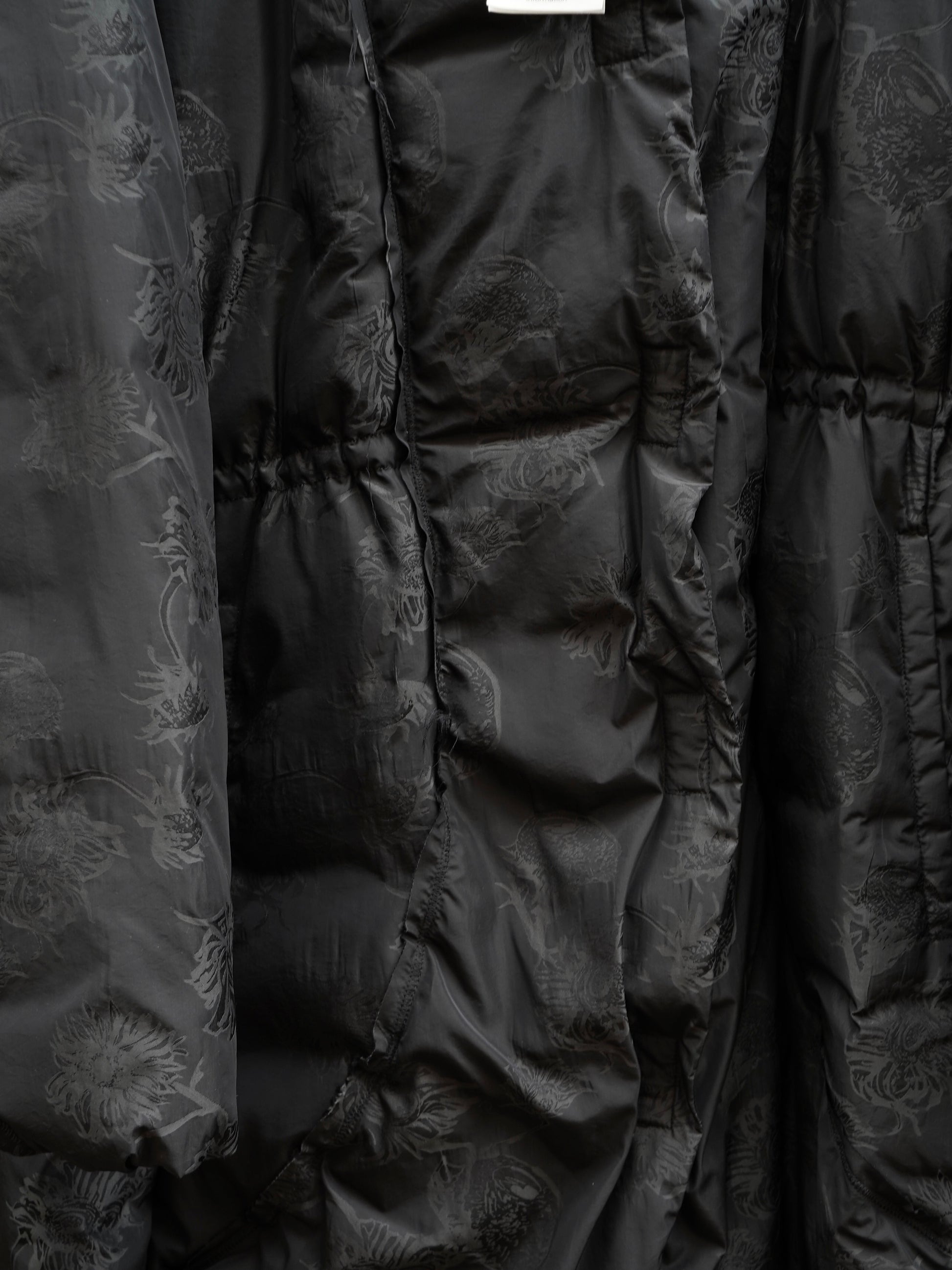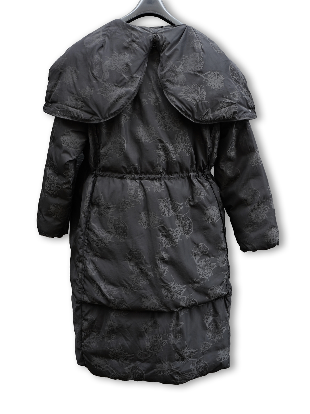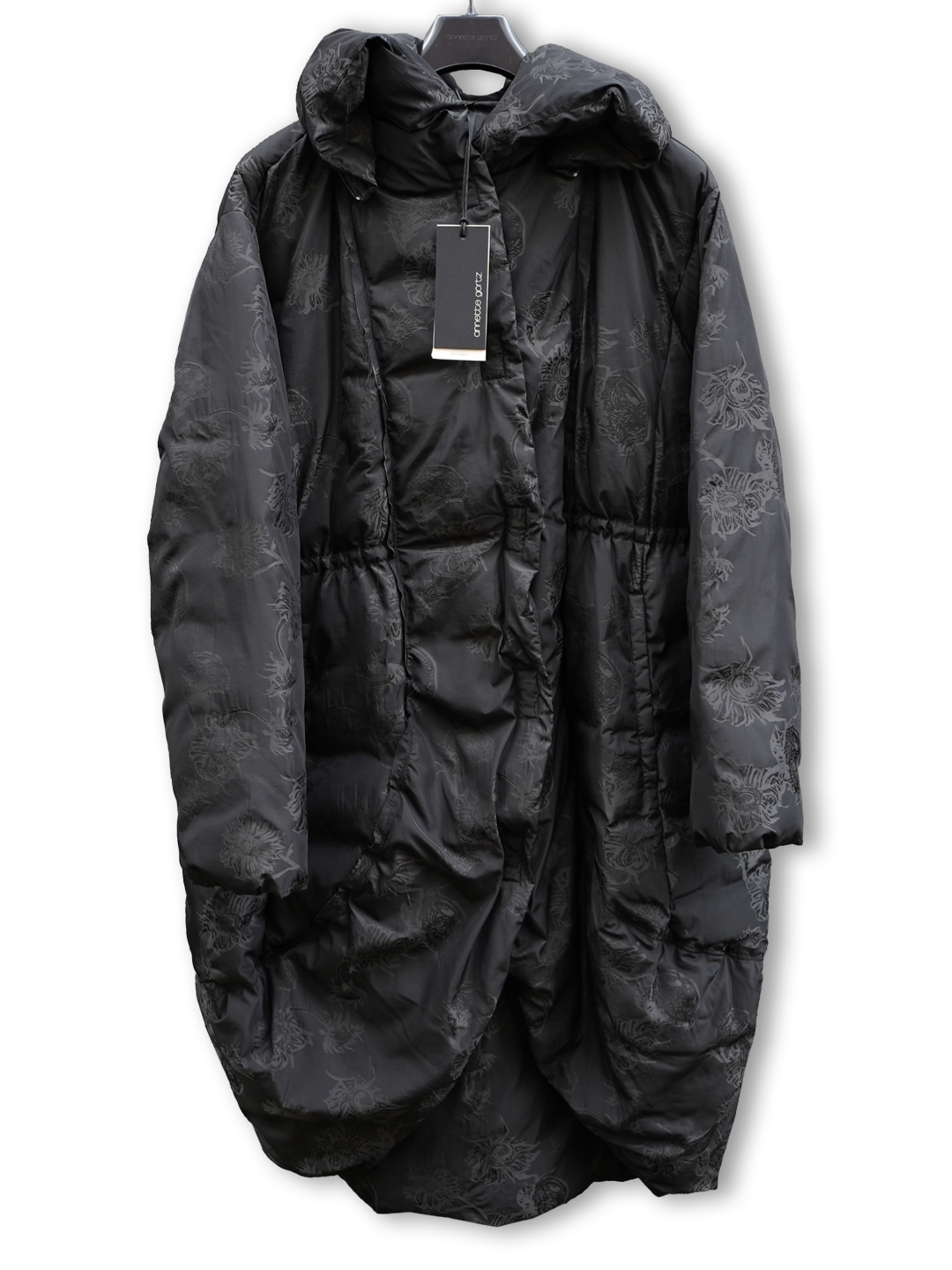 Melns mētelis ar spiedpogām. Ziedu raksts. Kapuce divi vienā - attaisot rāvēju, to var pārveidot kā apkakli. Viduklis savelkams. Pārstrādātas dūnas. 61% poliamīds, 39% poliesters. 90% dūnas, 10% spalvas.