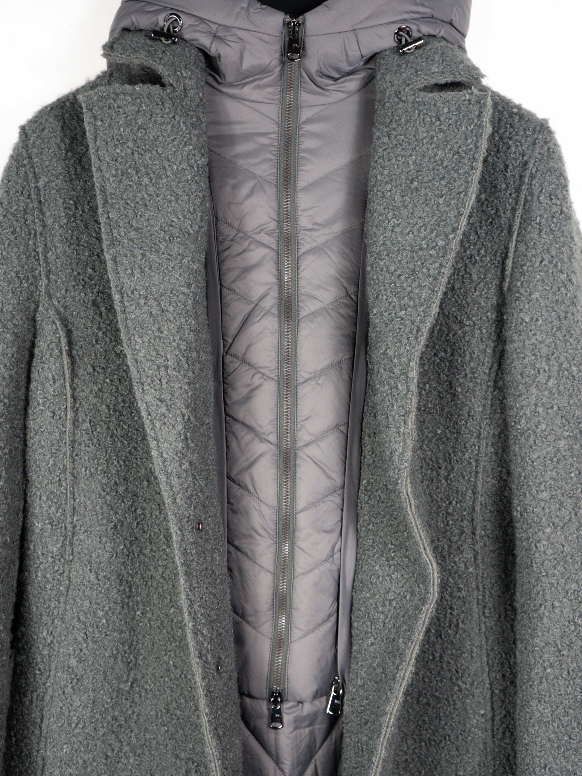 Mētelis ar stepētu iekšpusi. Noņemama kapuce un siltinājums priekšpusē. Kapuci var savilkt. 100% poliesters.