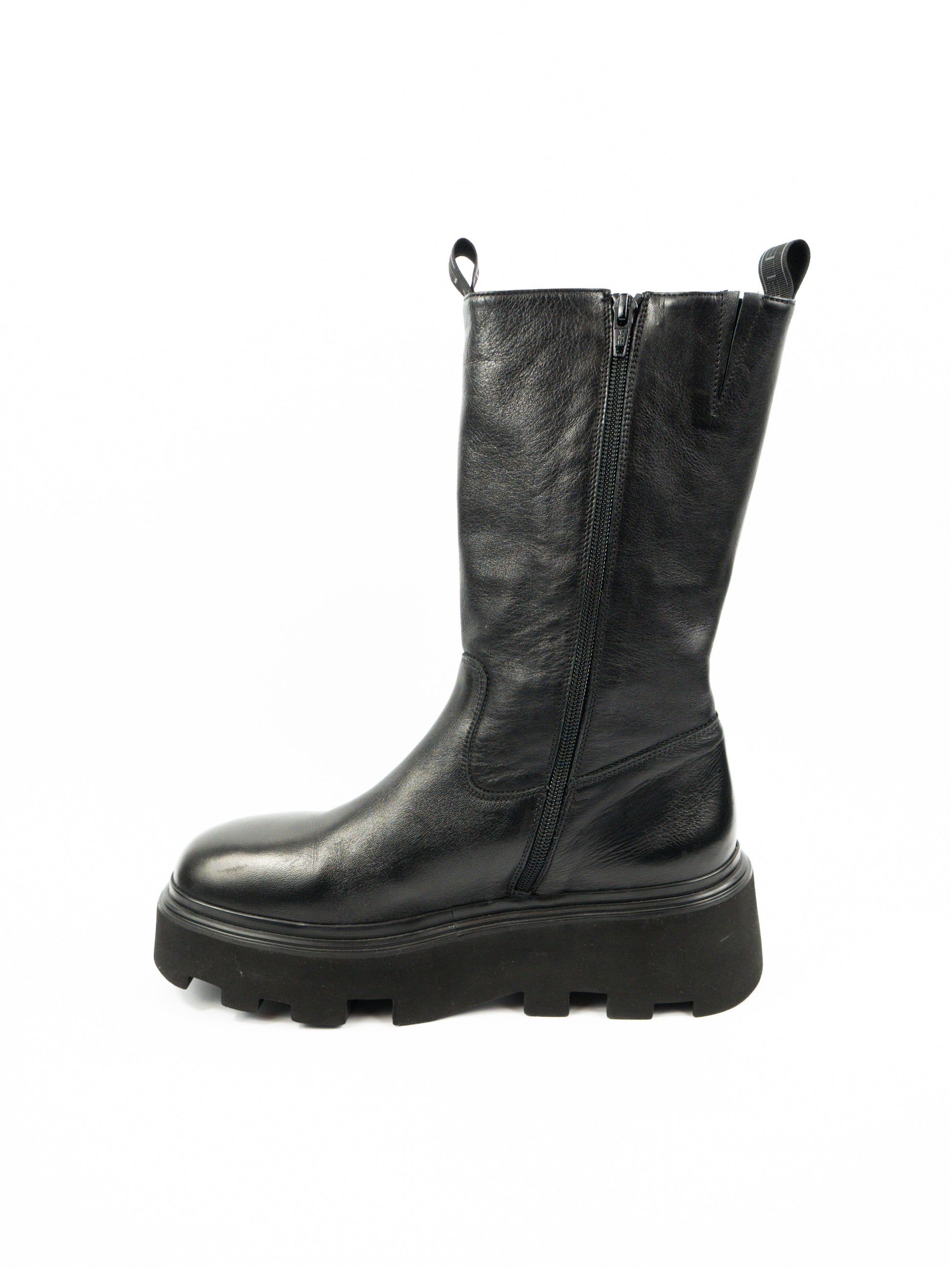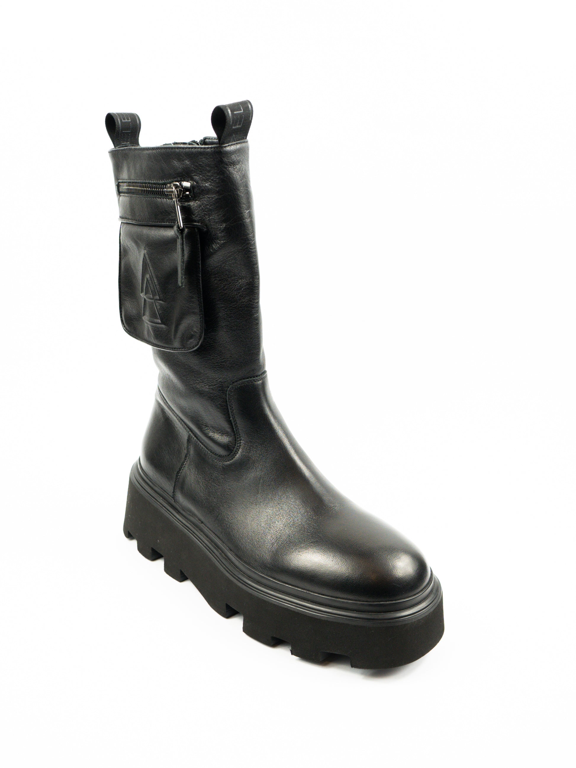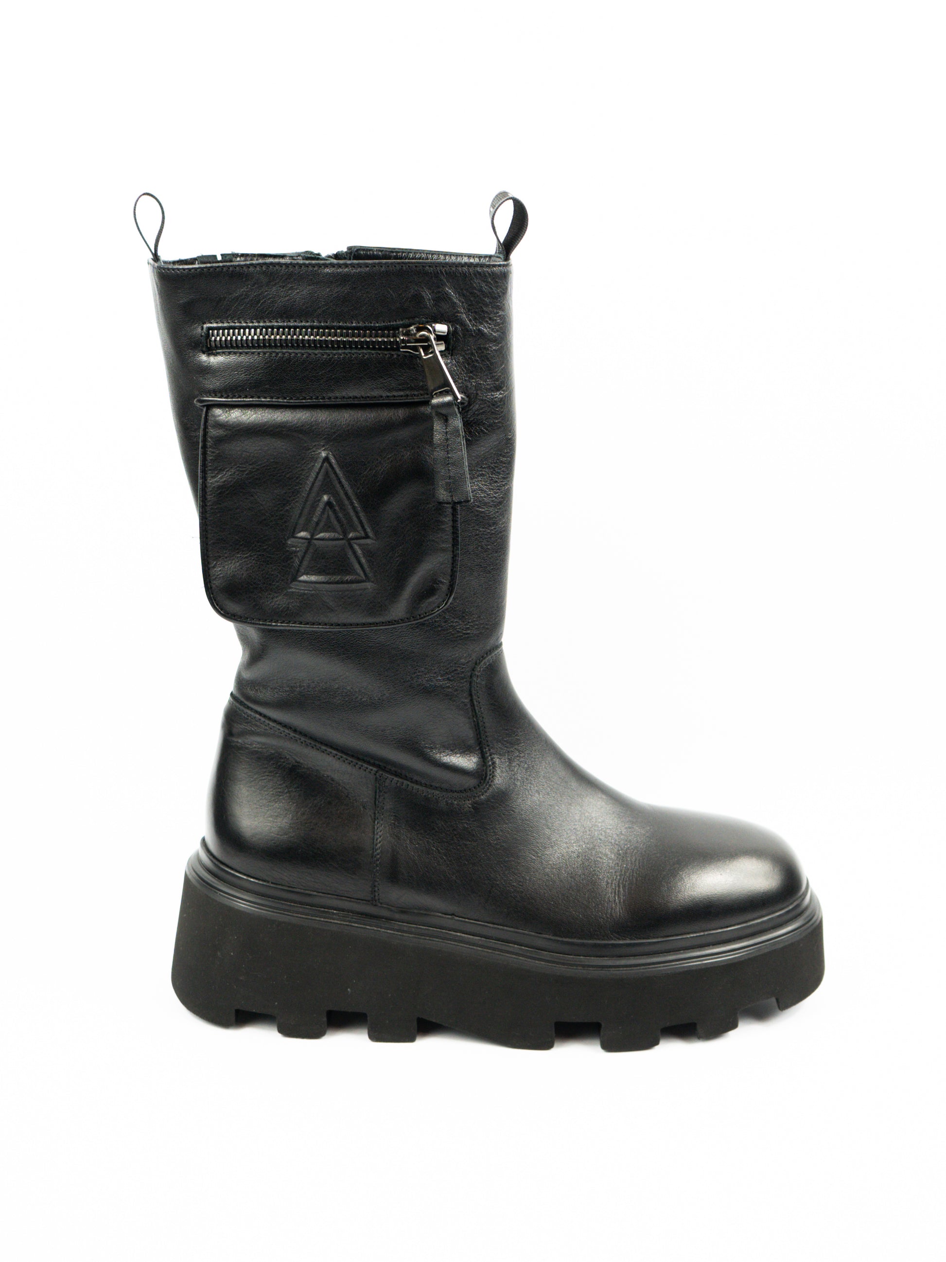 Melni ādas zābaki ar nelielu kabatiņu, biezu zoli un rāvēju sānā.