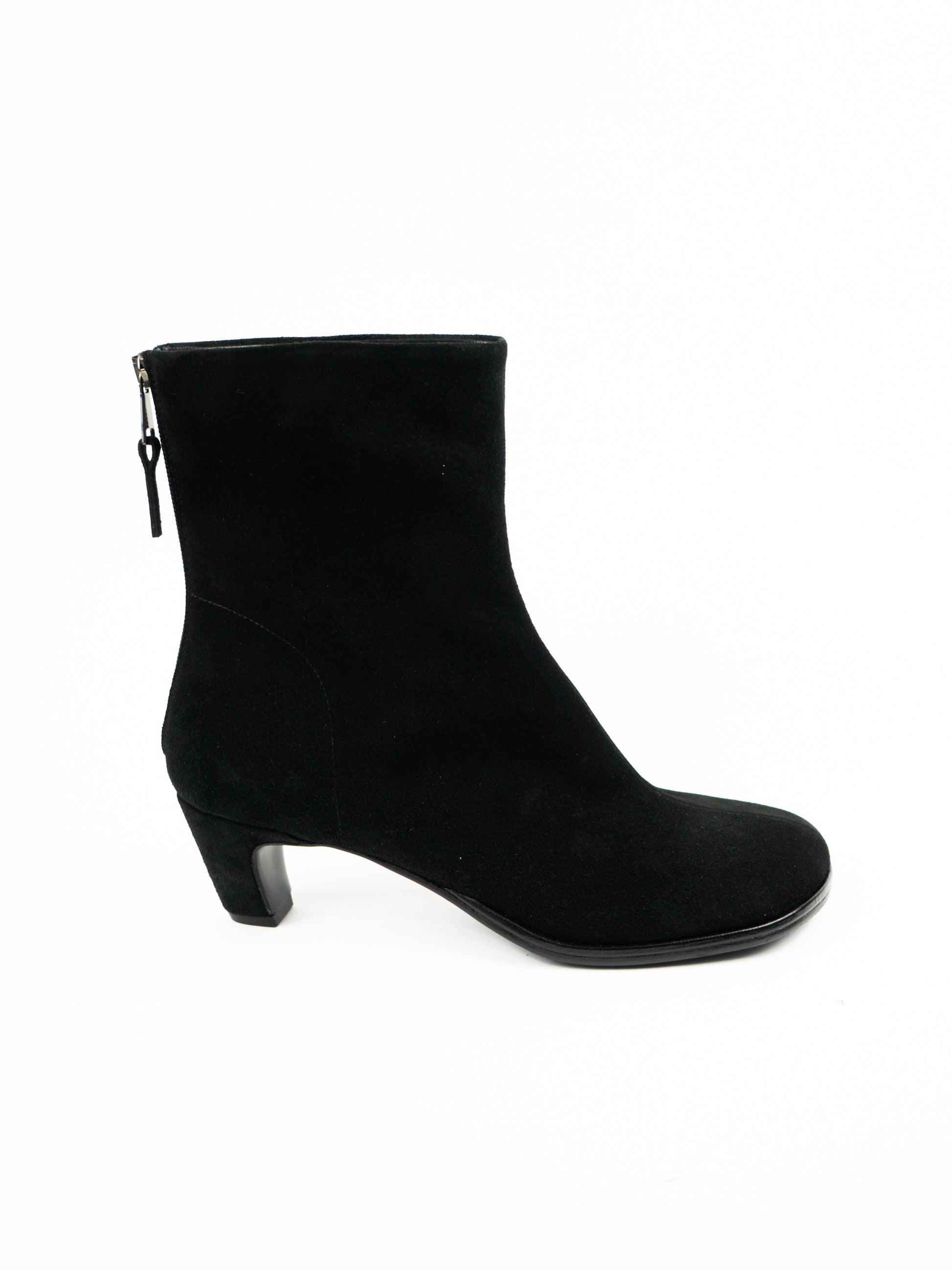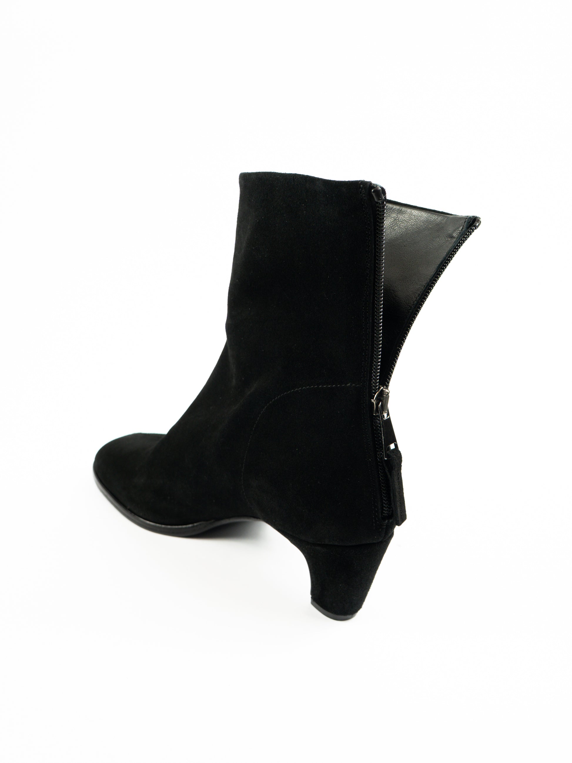 Zamšādas zābaki ar papēdi un rāvēju aizmugurē.