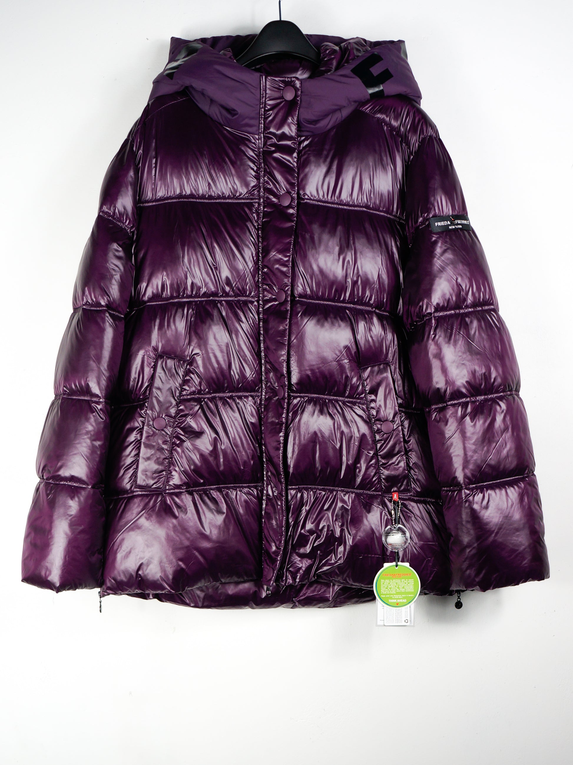 Violeta jaka ar thermolite pildījumu, kas veidots no 100% pārstrādātām pet pudelēm un uztur siltumu.