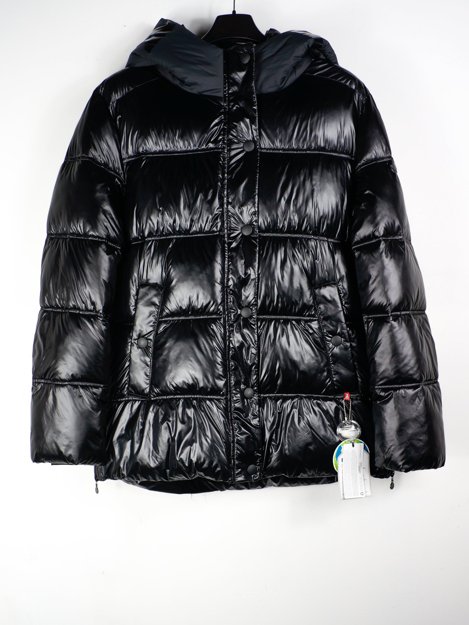 Melna jaka ar thermolite pildījumu, kas veidots no 100% pārstrādātām pet pudelēm un uztur siltumu.
