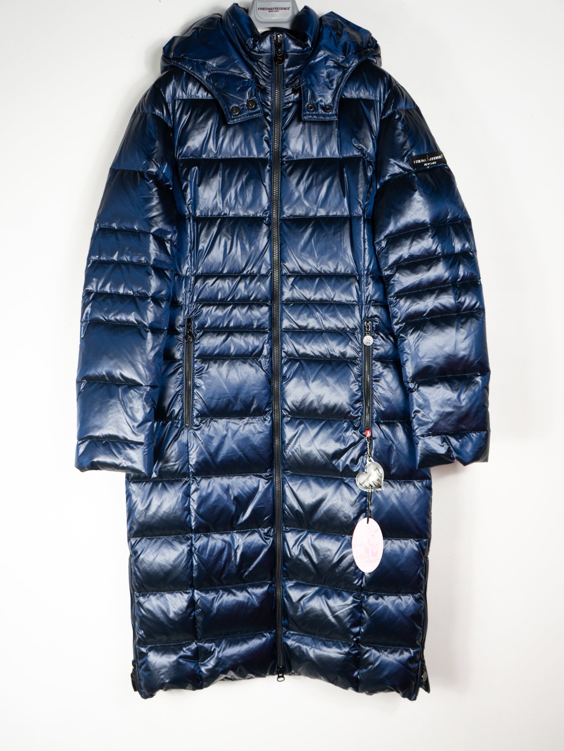 Mētelis ar kapuci. Pildīts ar dūnām. Ar vairākām iekškabatām. 70% dūnas, 30% spalvas.