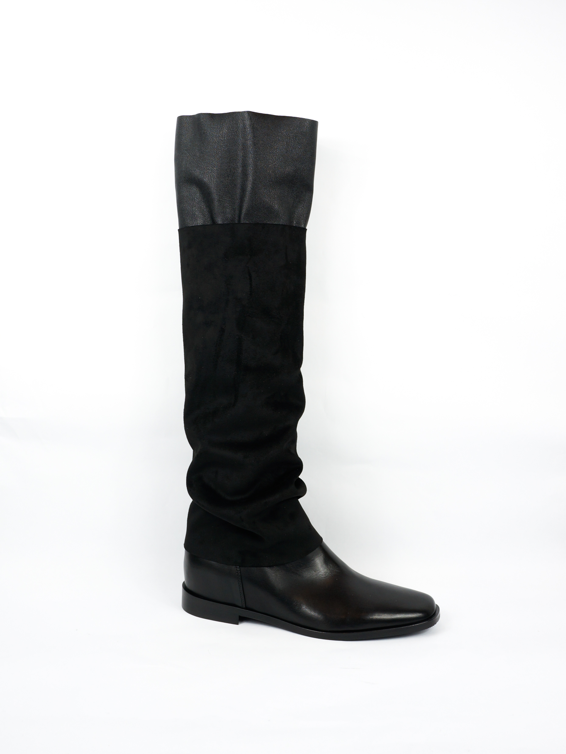 Melni ādas zābaki ar uzvelkamu zamšādas stulmu.