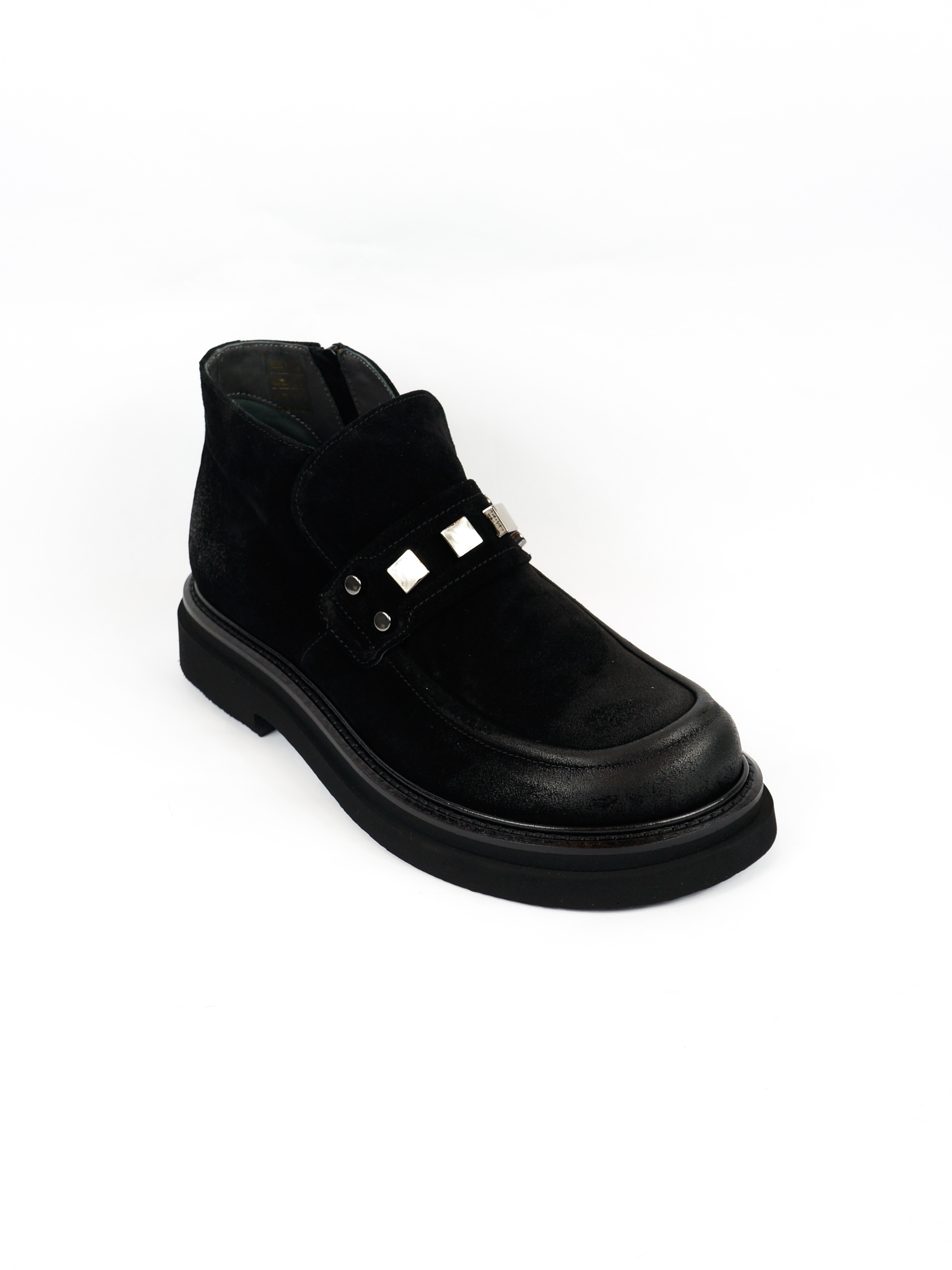 Īsi, melni zābaki ar rāvēju un metāla detaļām.
