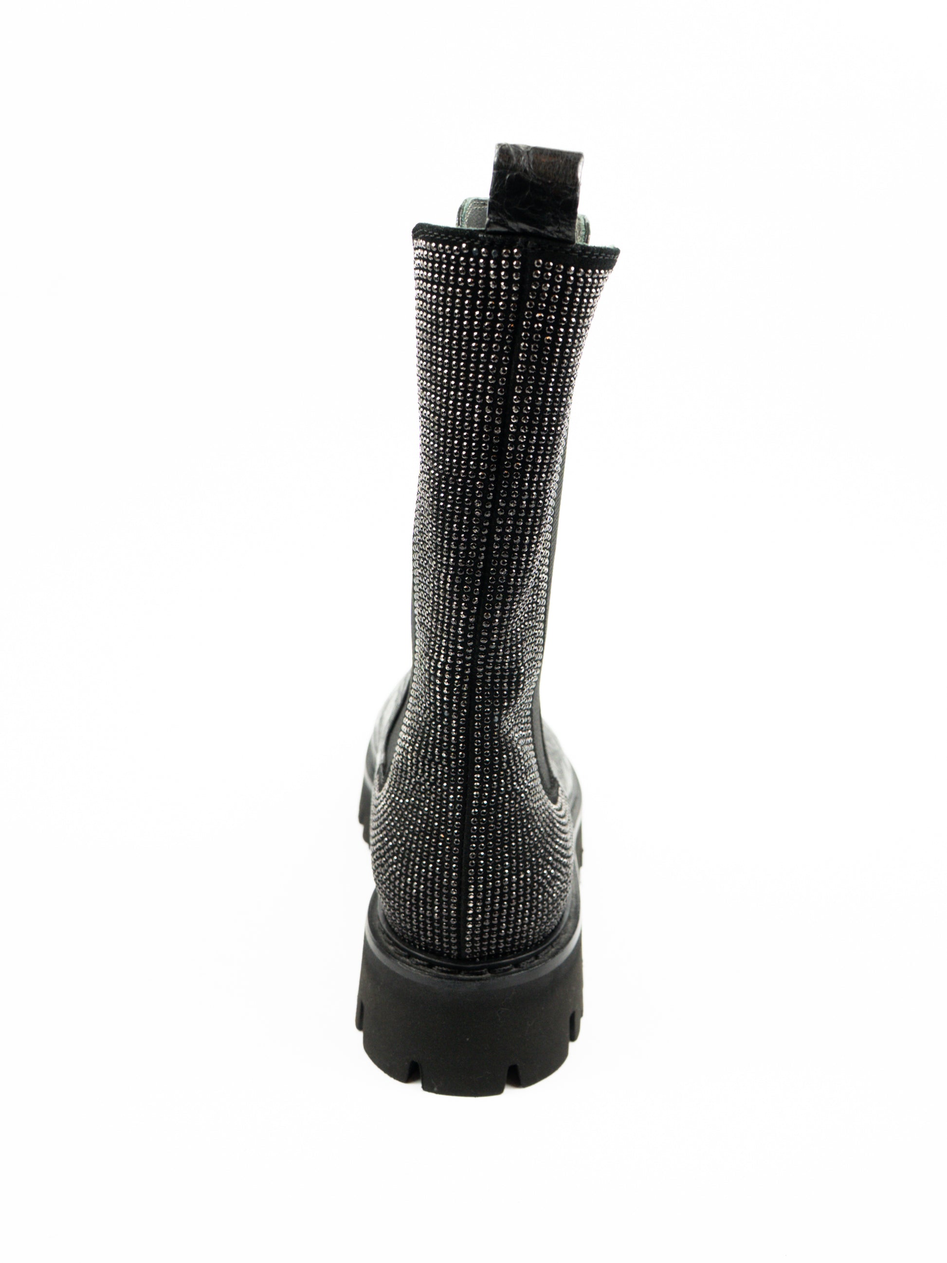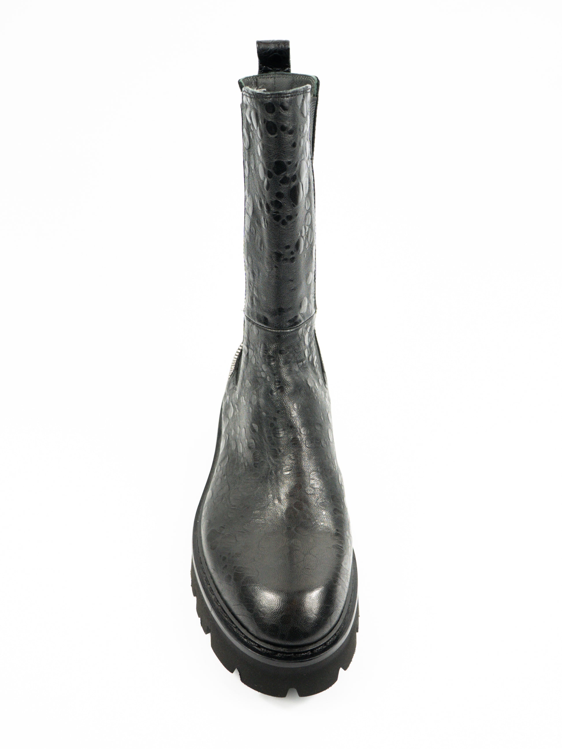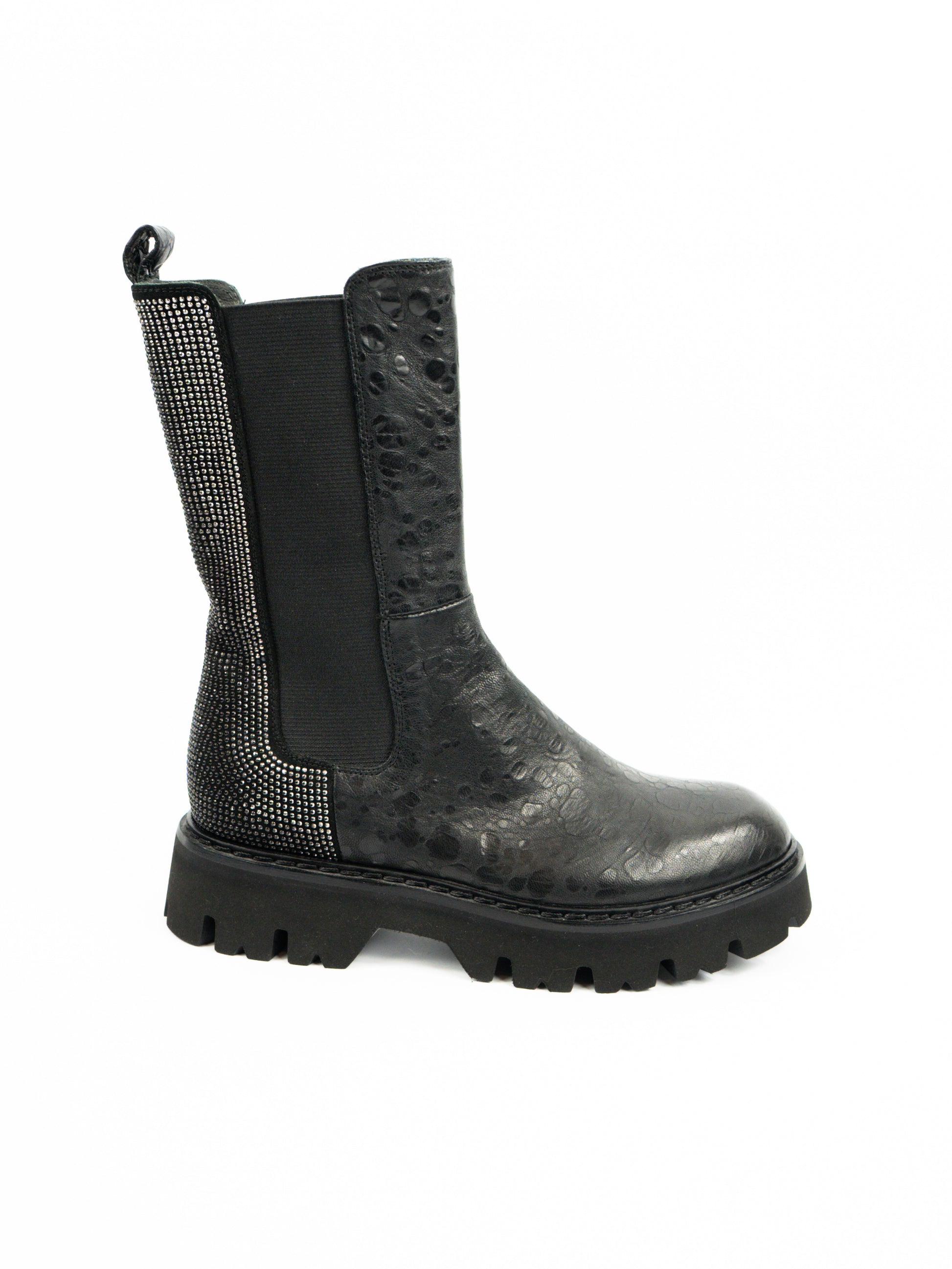 Melni, mīkstas ādas zābaki ar tekstūru un faktūru. Aizmugurē mirdzumi.