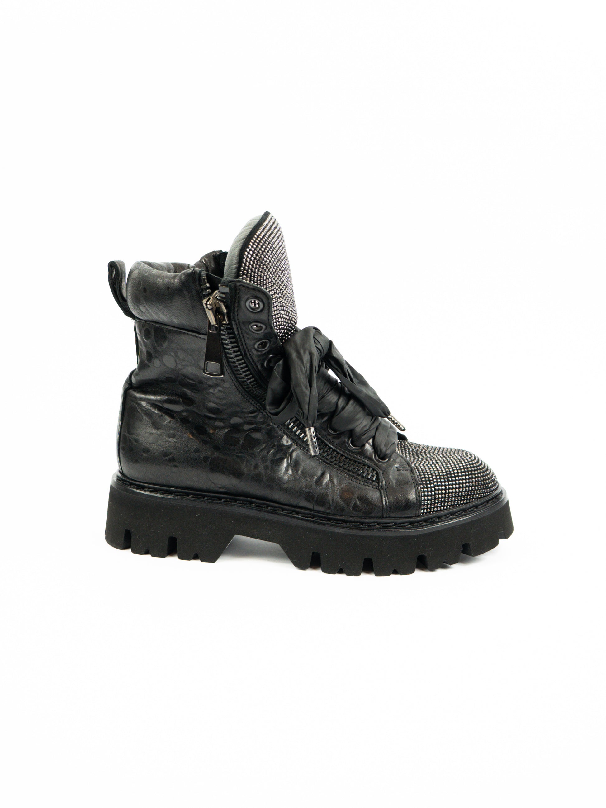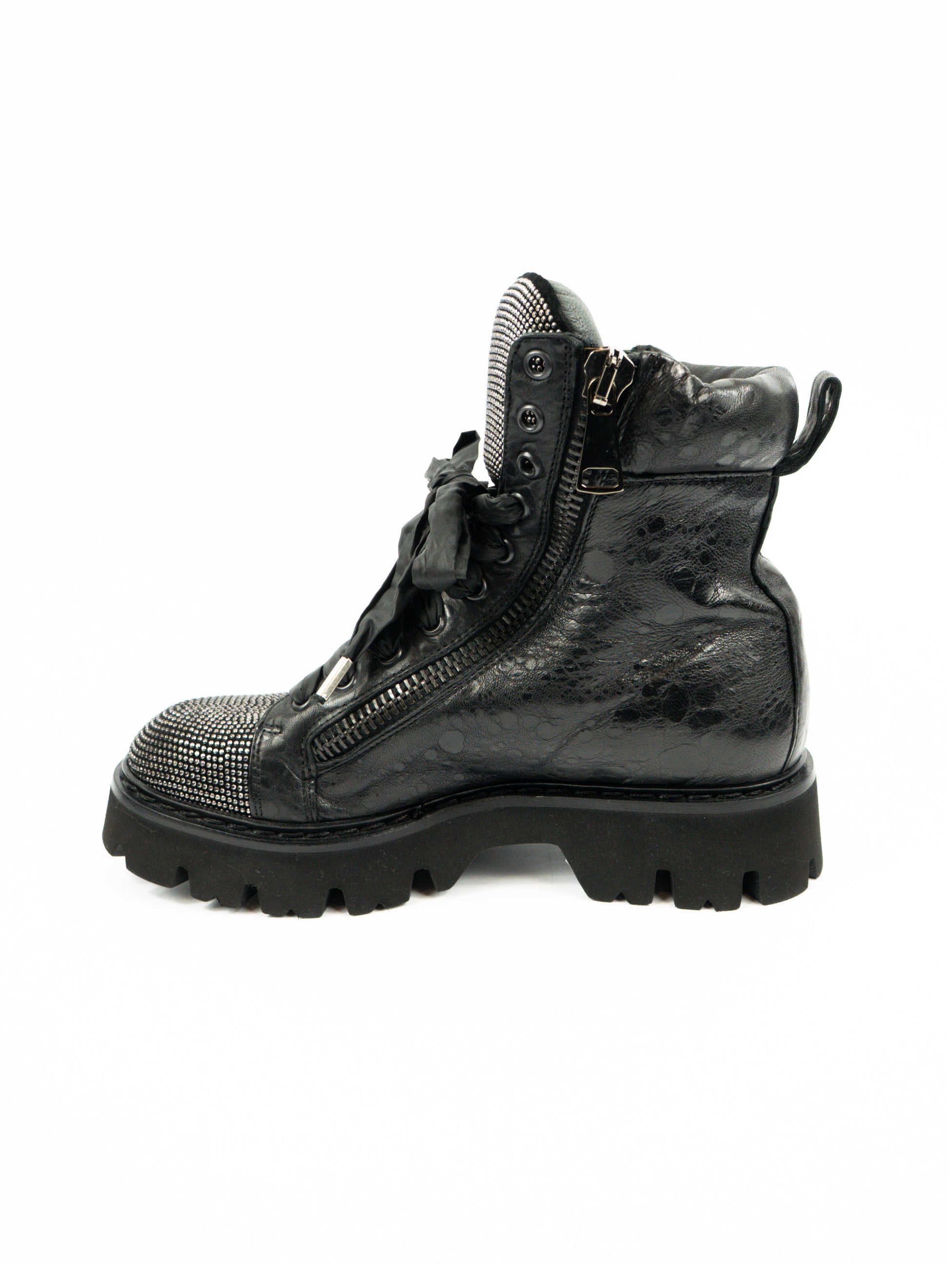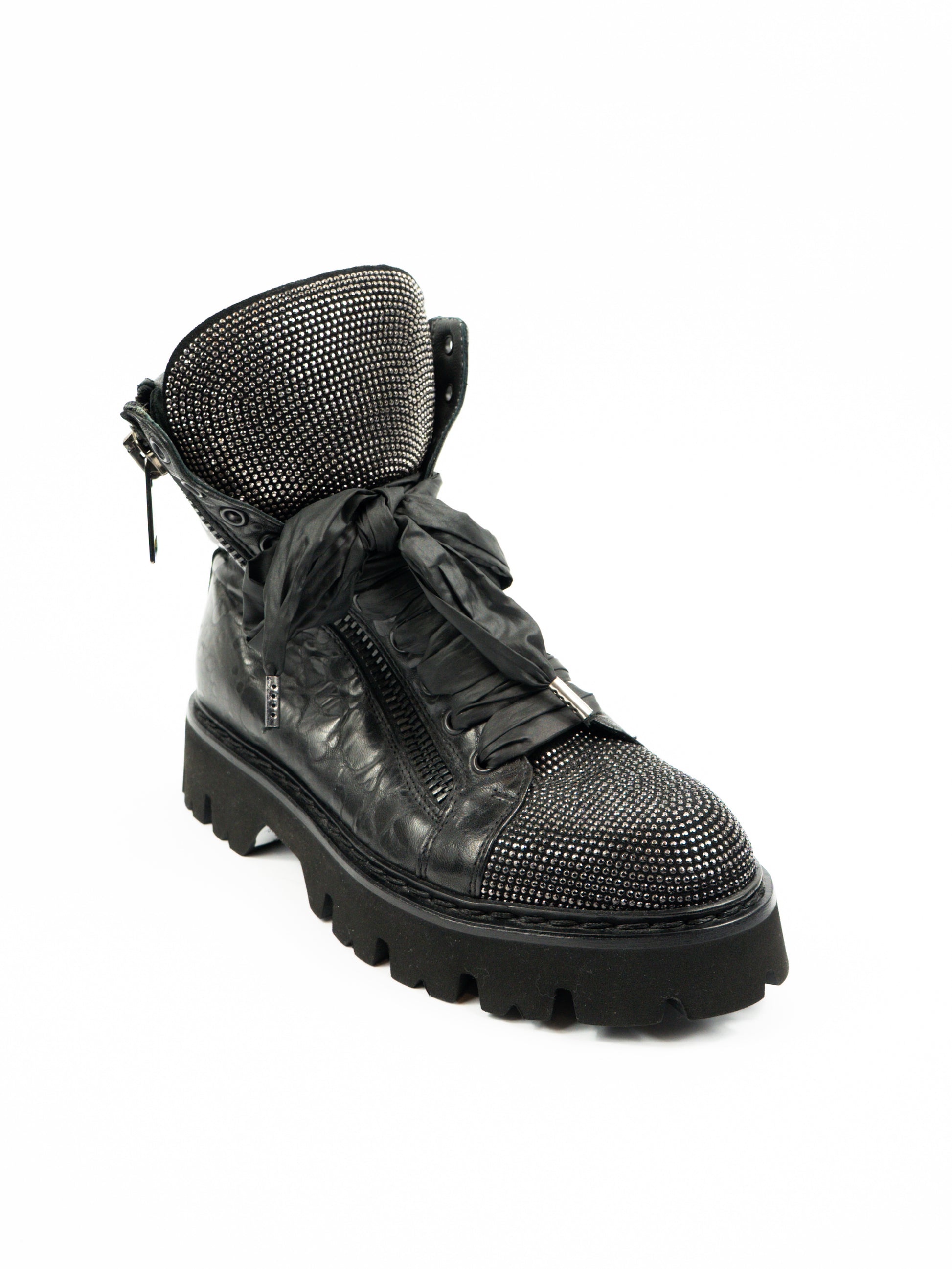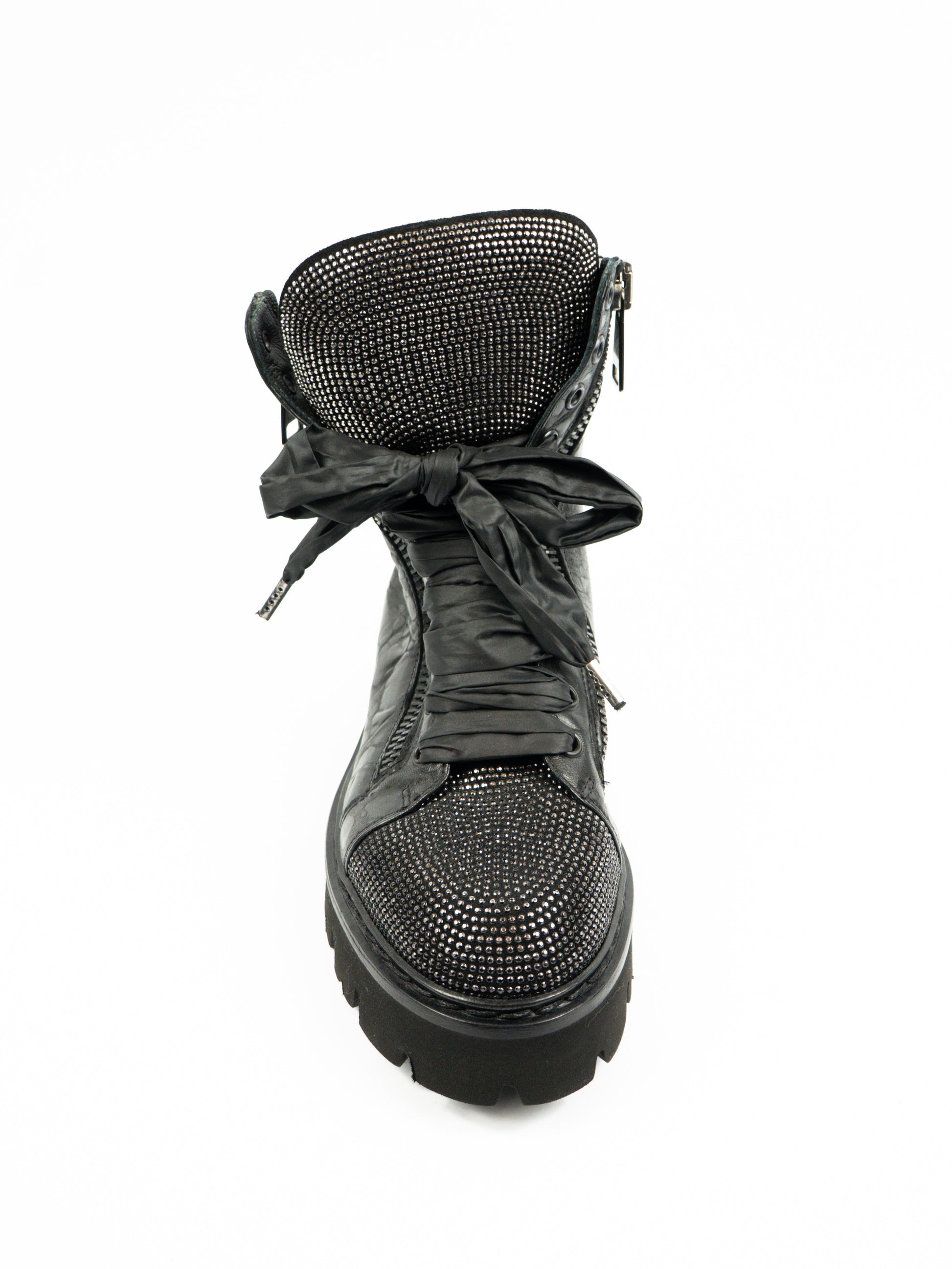 Melni, mīkstas ādas zābaki ar rāvējiem sānos. Priekšpusē akmentiņi.