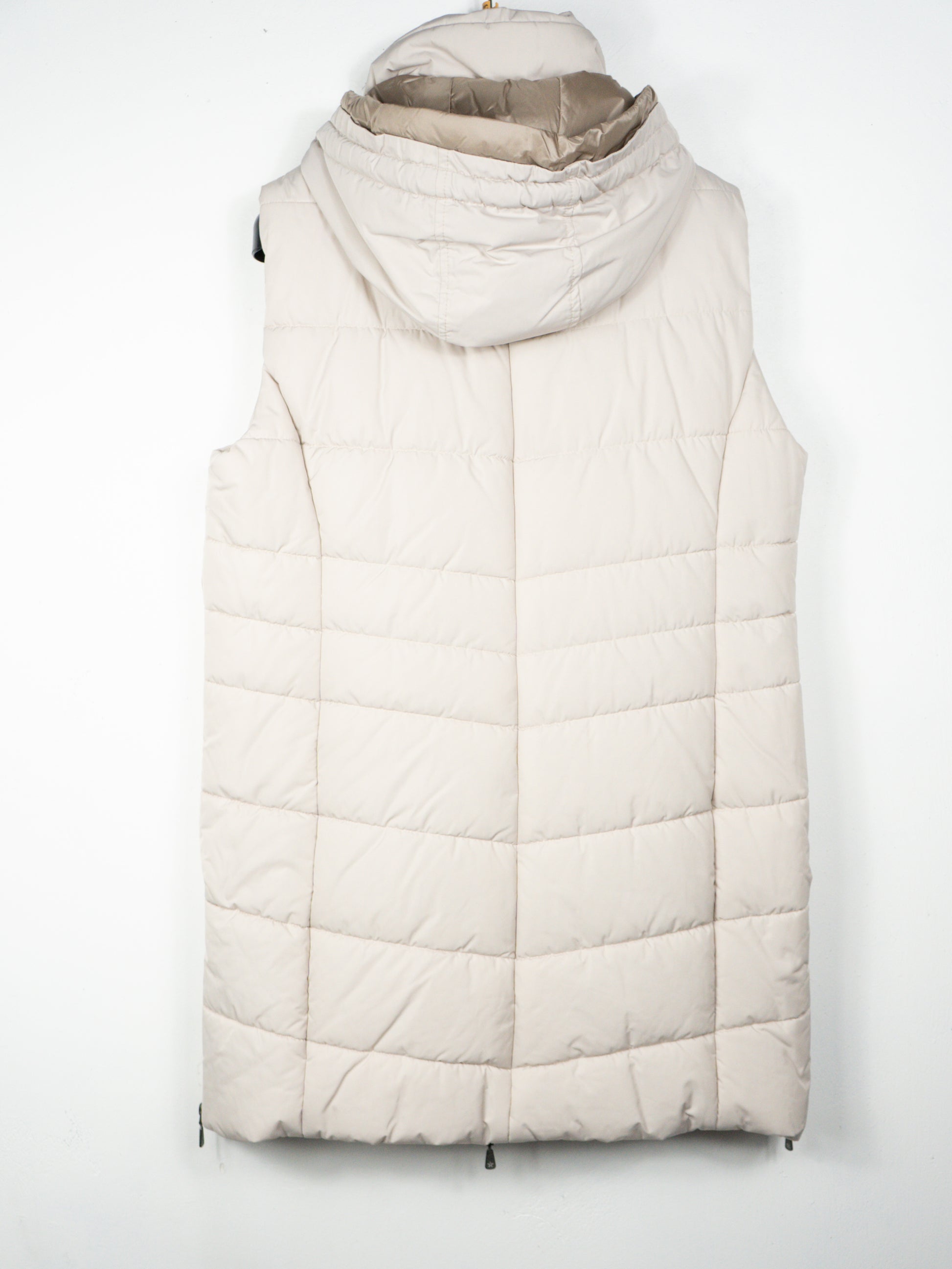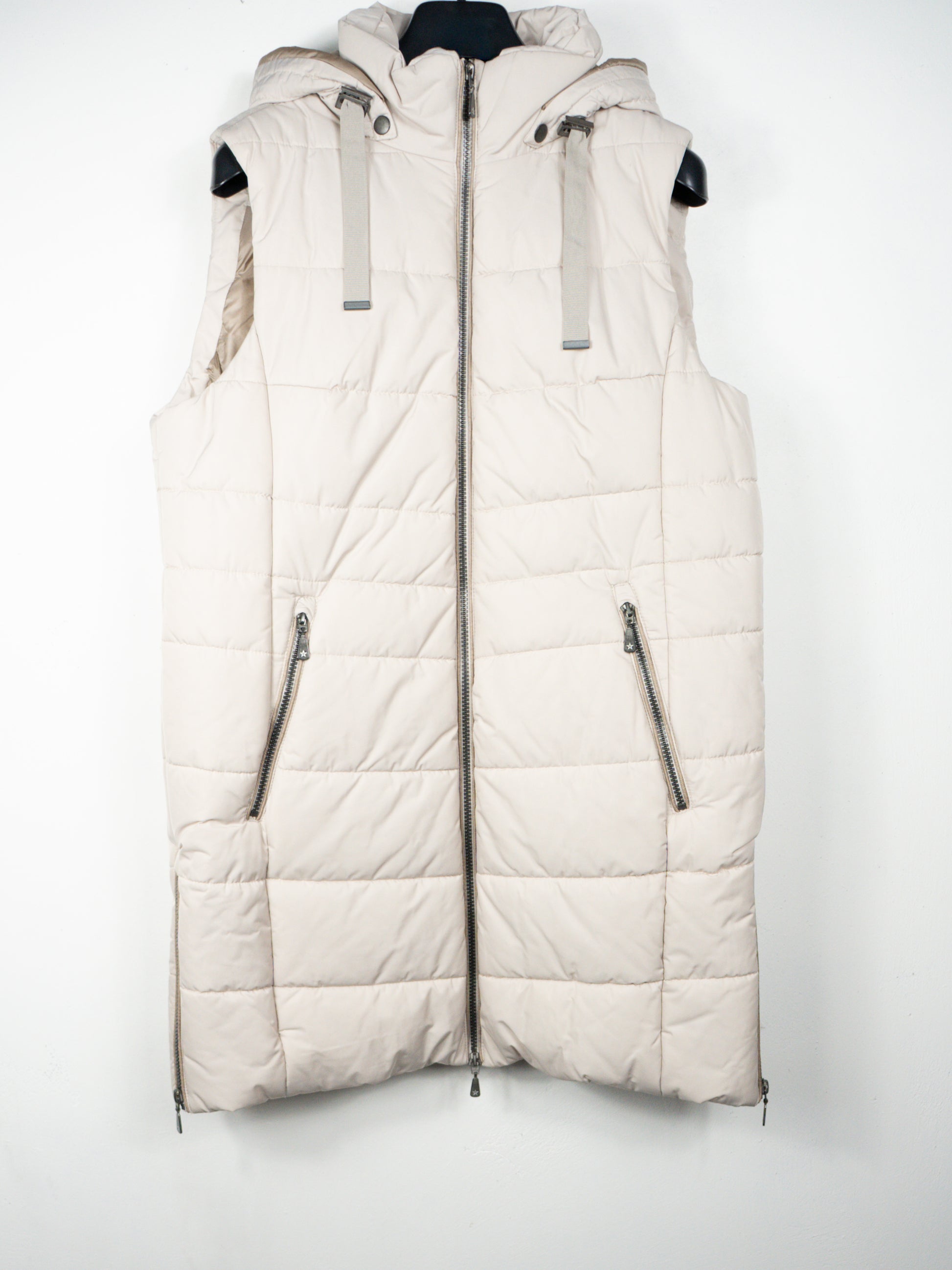 Vidēja garuma, bēša veste ar noņemamu kapuci. Pildīta ar thermofleece - viegls un sildošs, ūdens atgrūdošs, elpojošs, ātri žūstošs un vēja atgrūdošs. 100% poliesters.