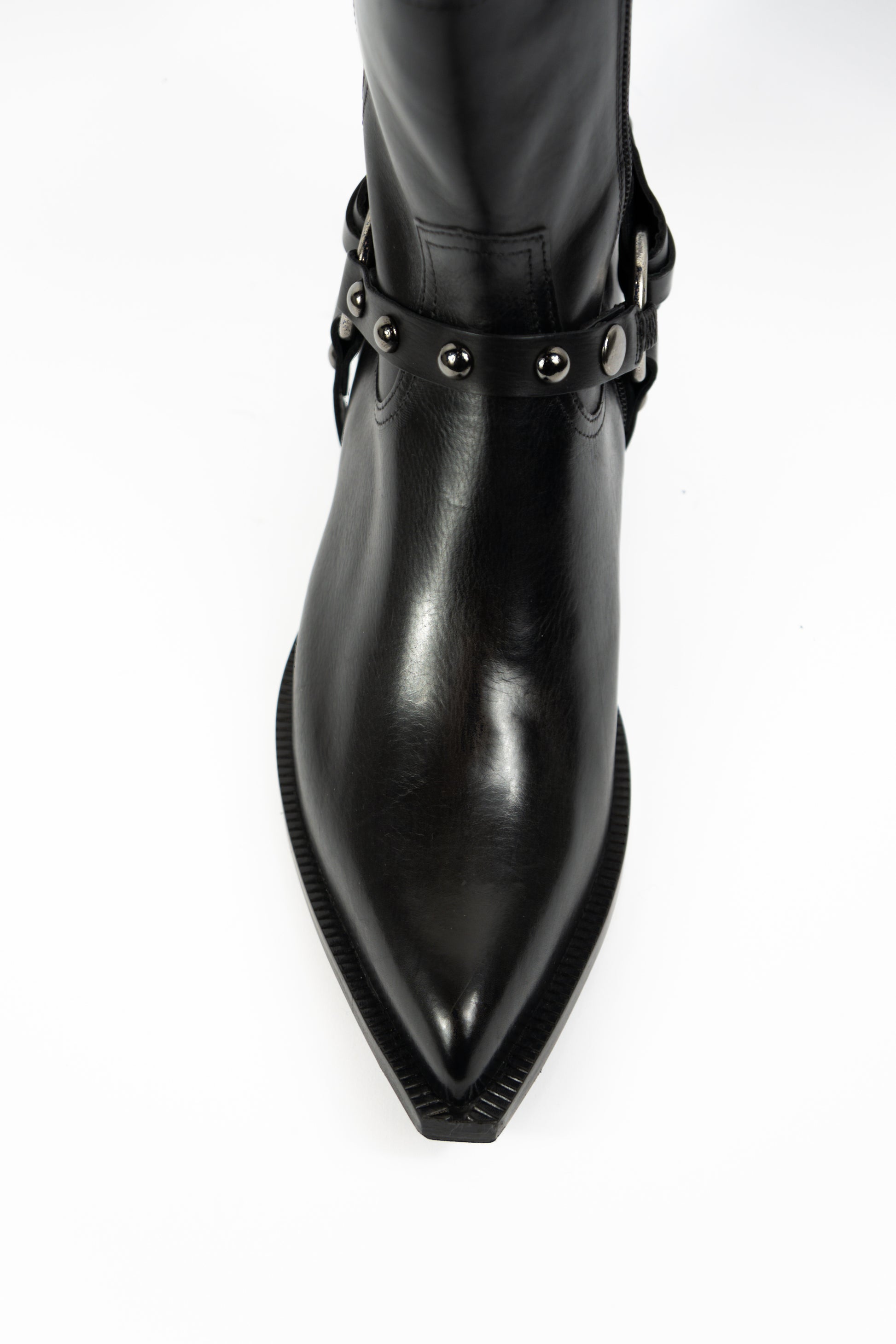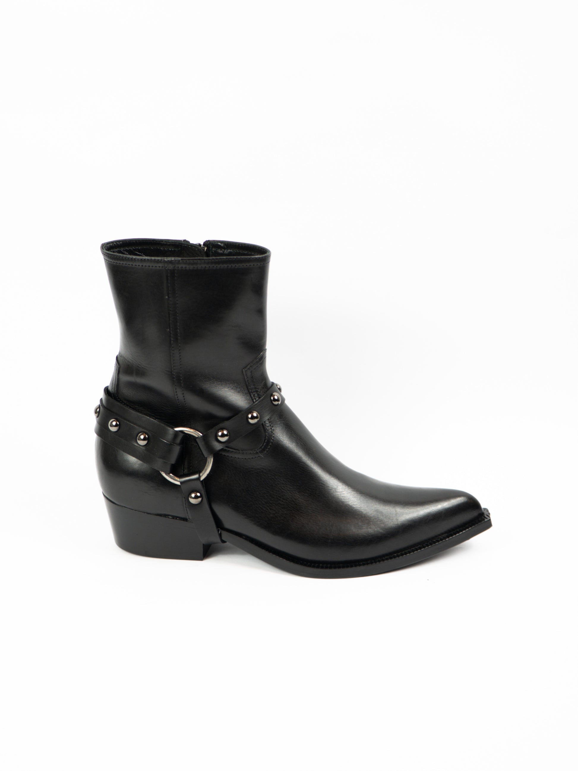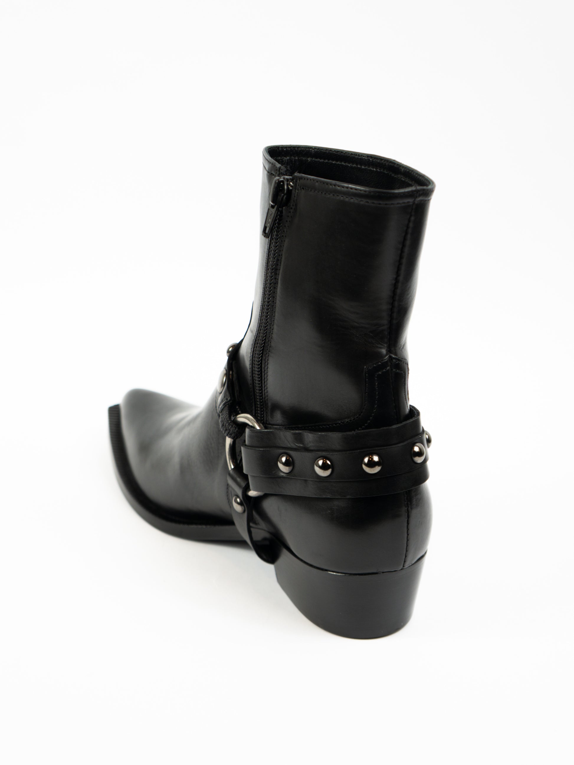 Melni kovbojtipa zābaki ar sprādzi un rāvēju sānā.