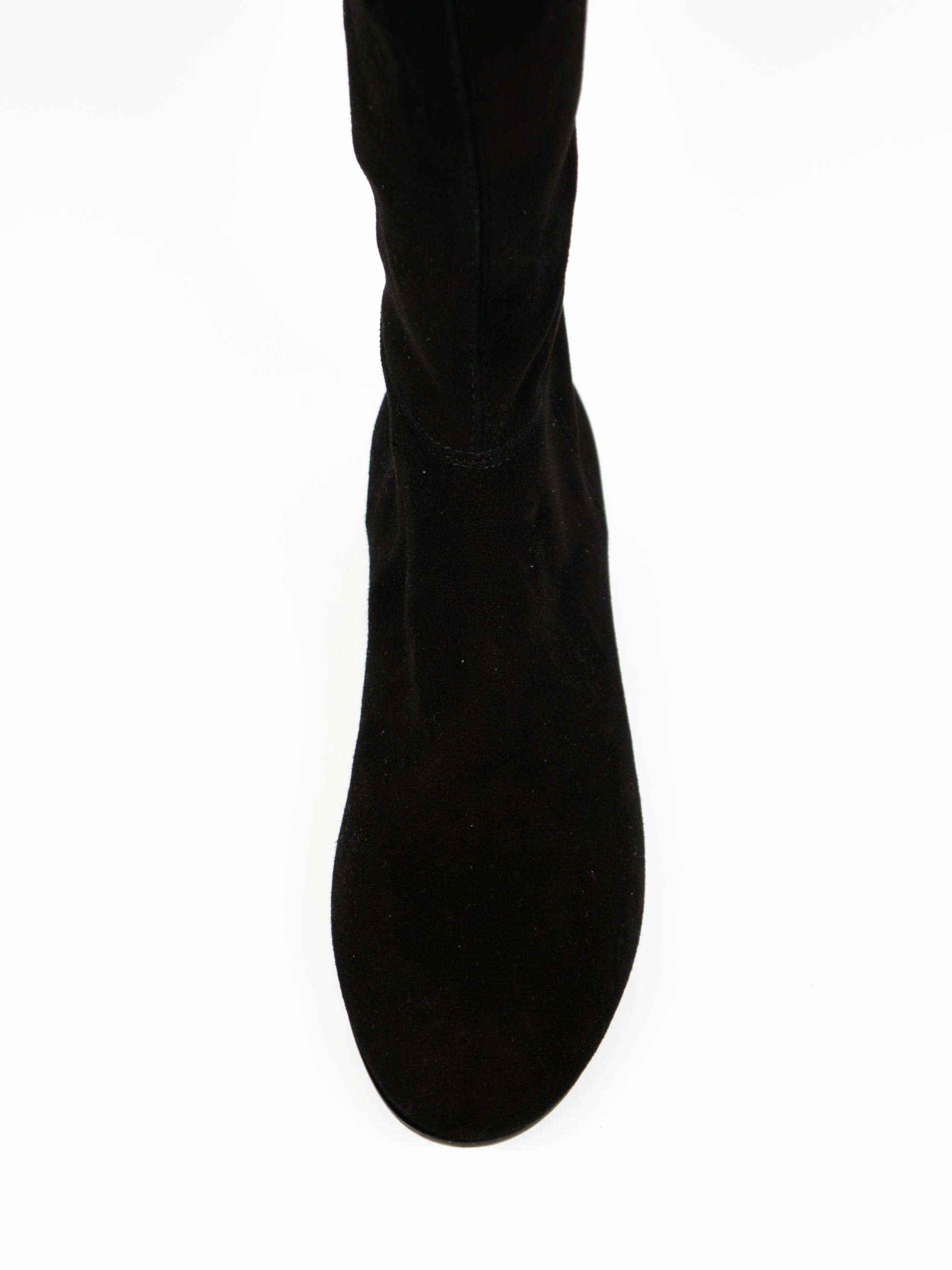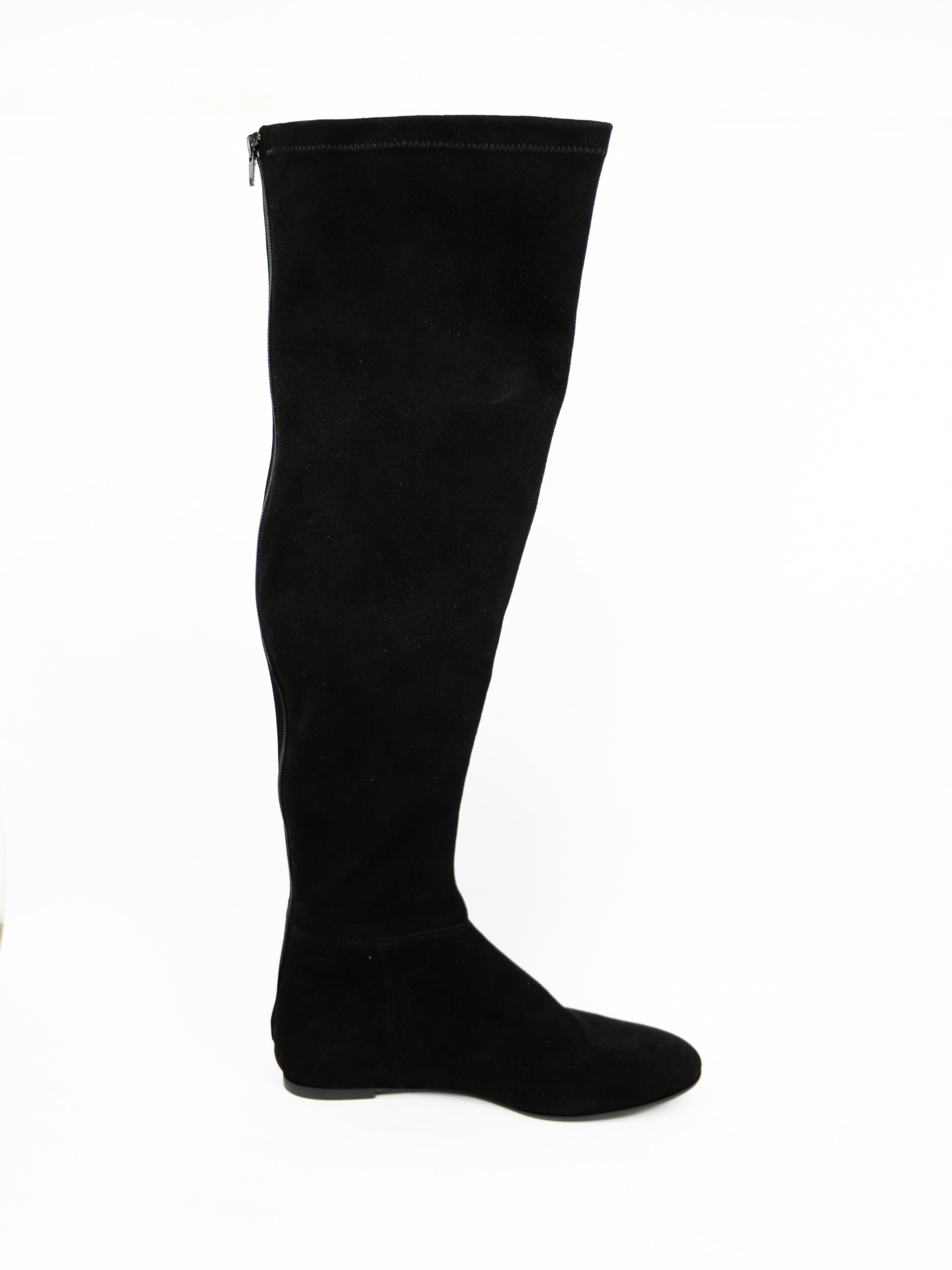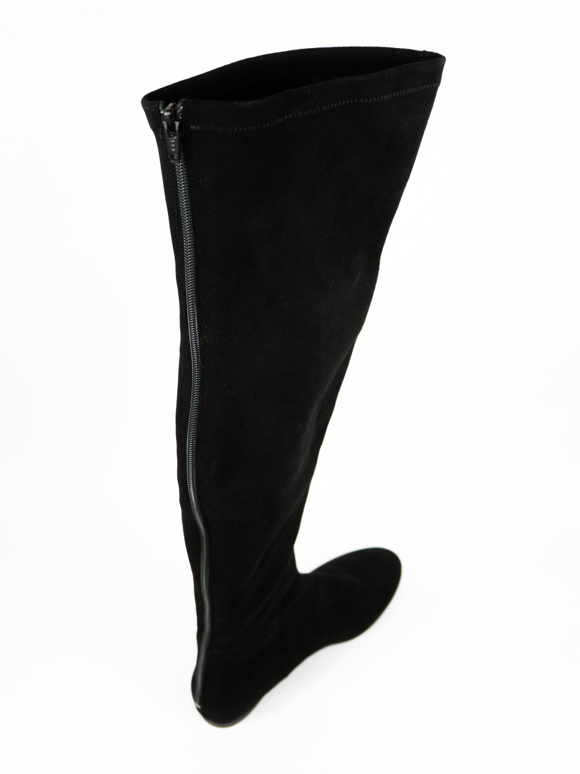 Melni zamšādas zābaki pāri celim. Aizmugurē rāvējs.
