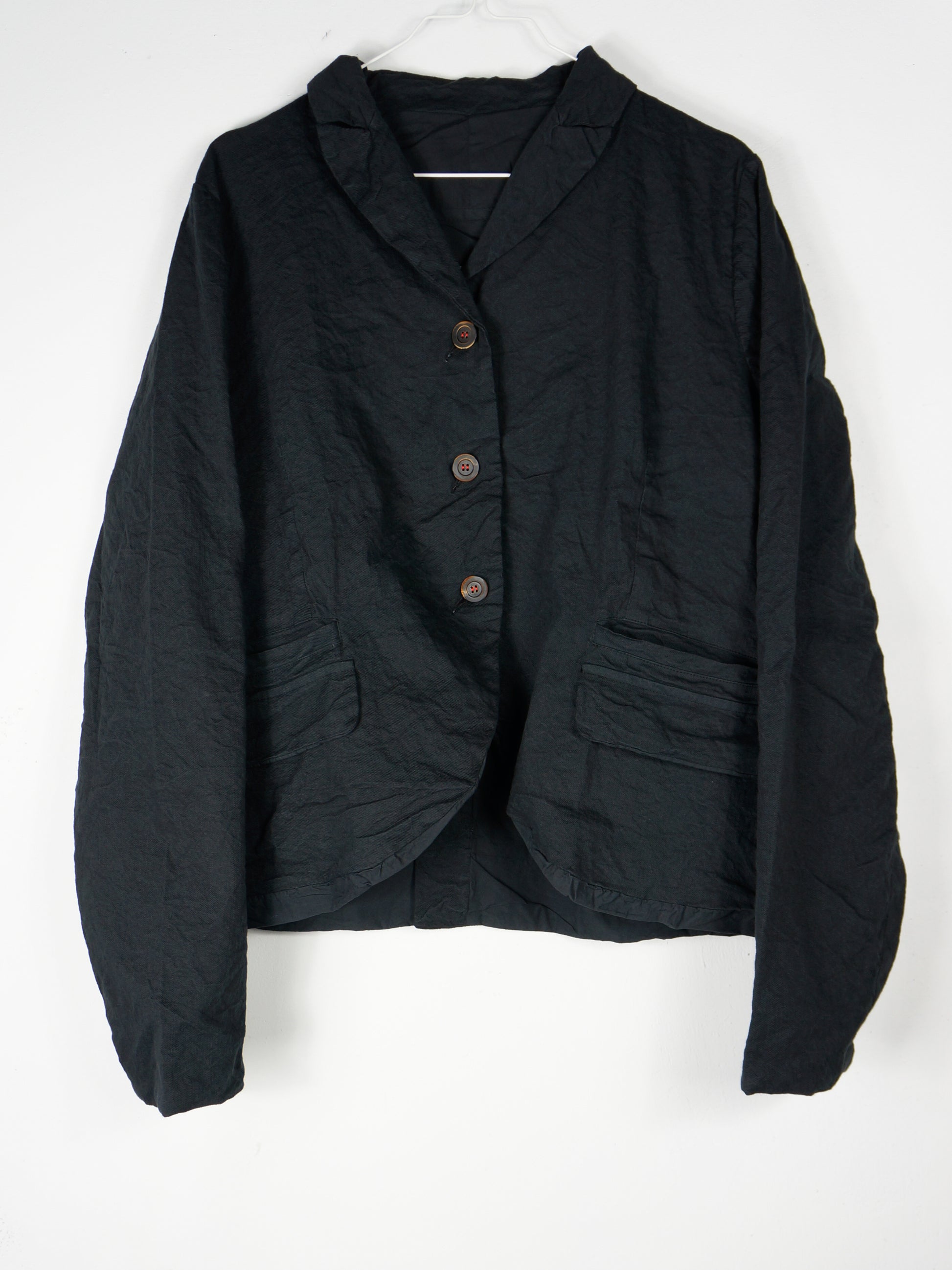 Melna žakete no burzīta auduma. 85% kokvilna, 11% metāliski diegi, 4% elastāns; 100% kokvilna (odere).