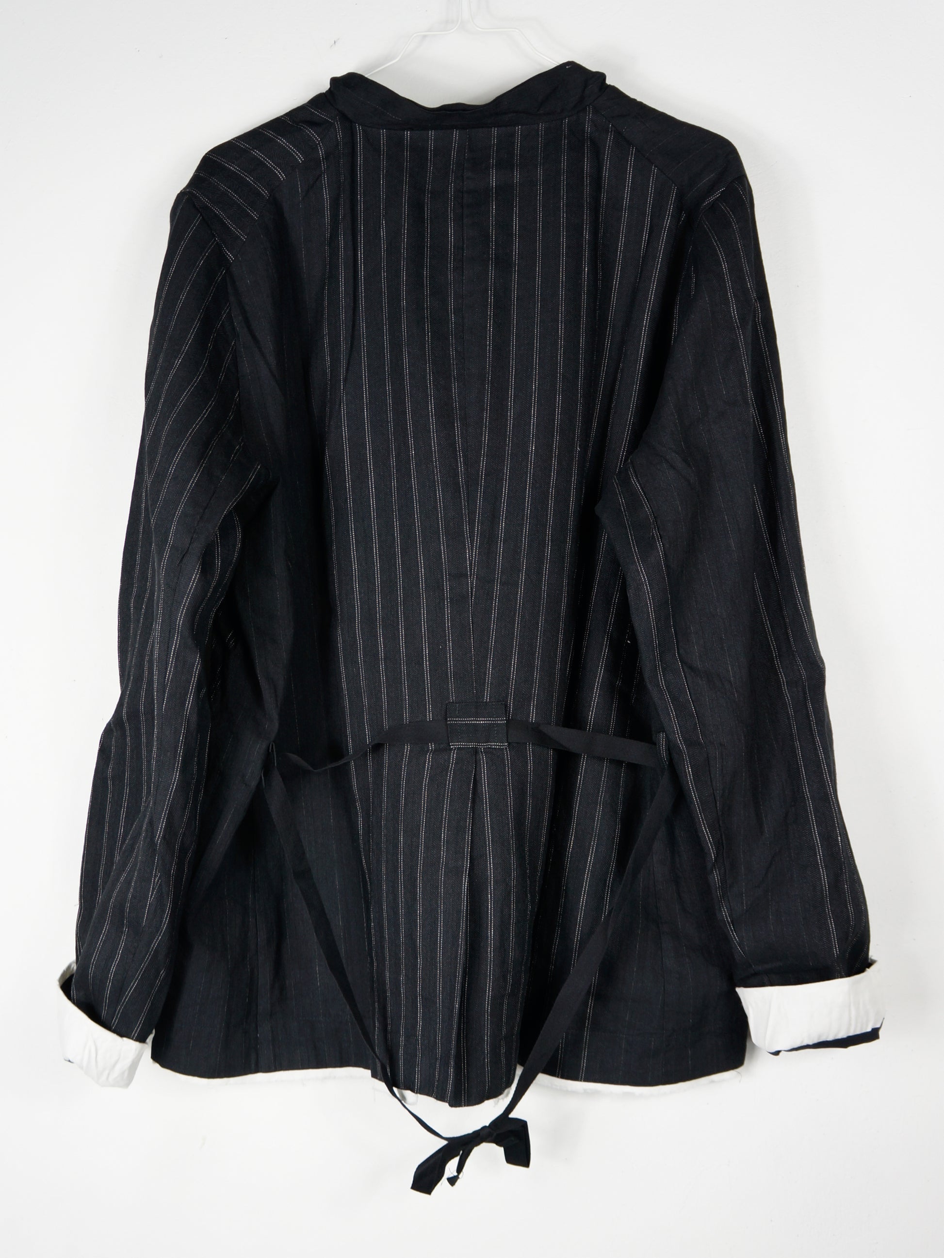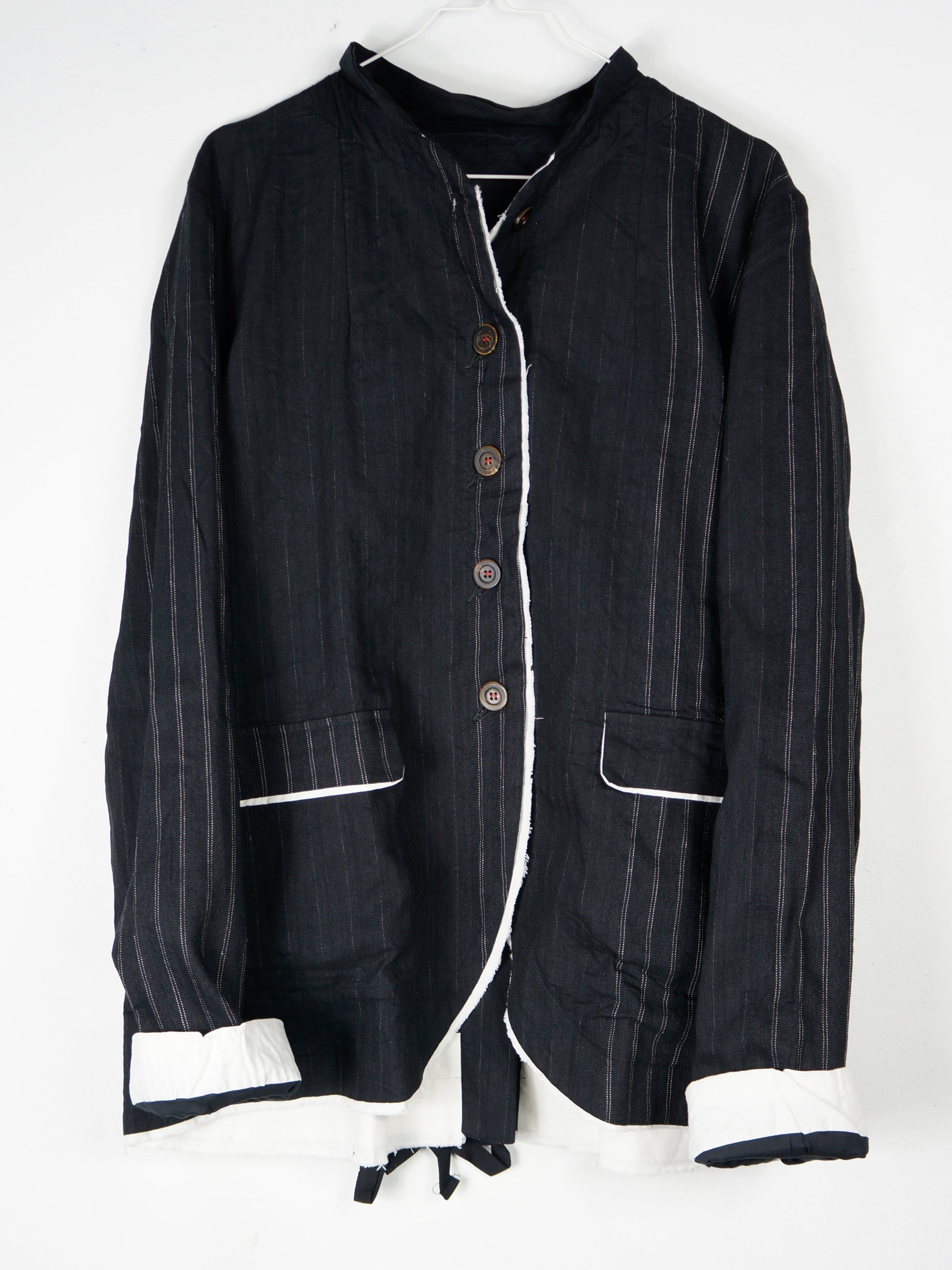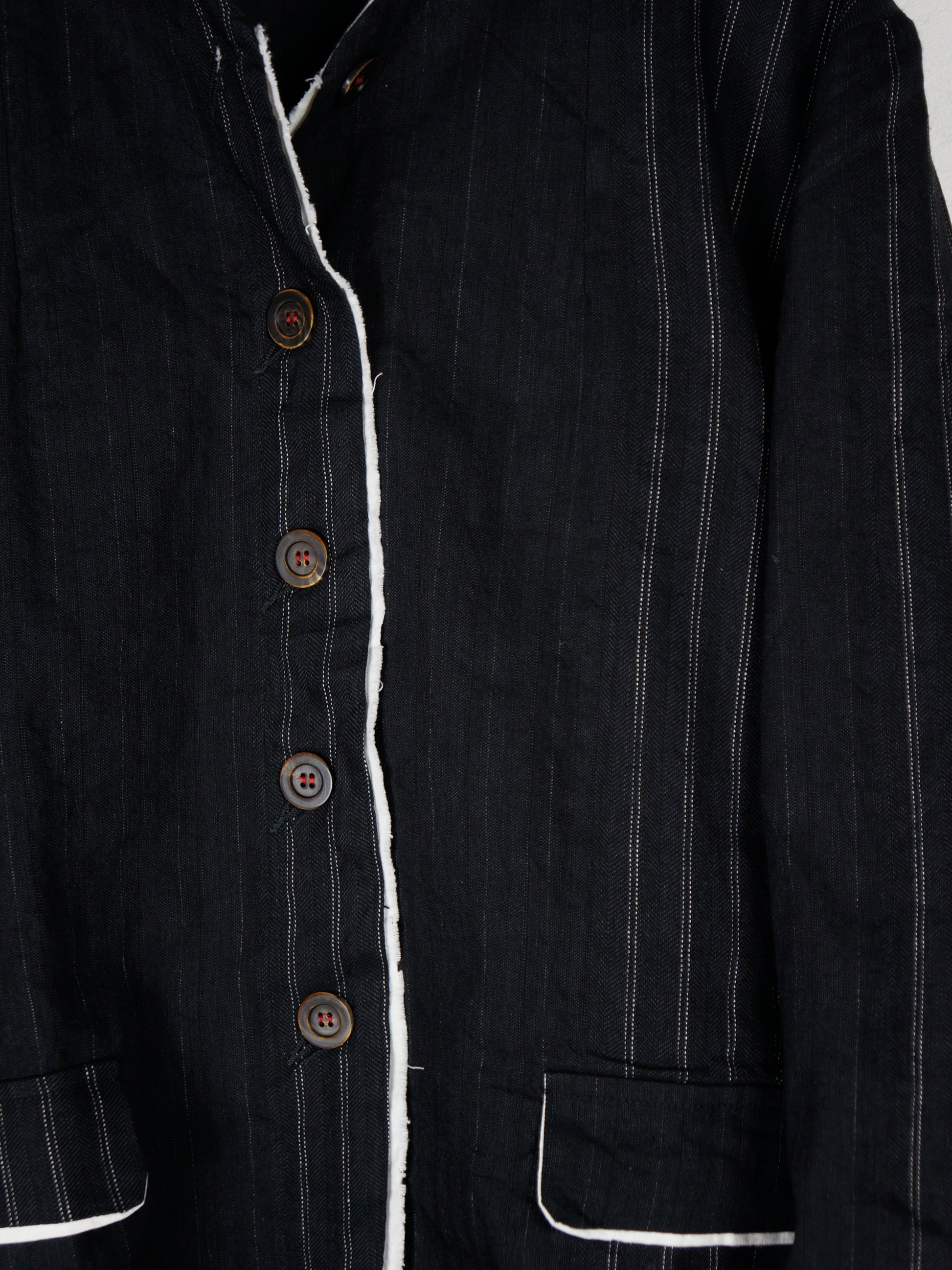 Melna žakete ar svītrām un baltu maliņu. Aizmugure savelkama. 38% lins, 28% kokvilna, 26% viskoze, 13% vilna; 100% kokvilna (odere).