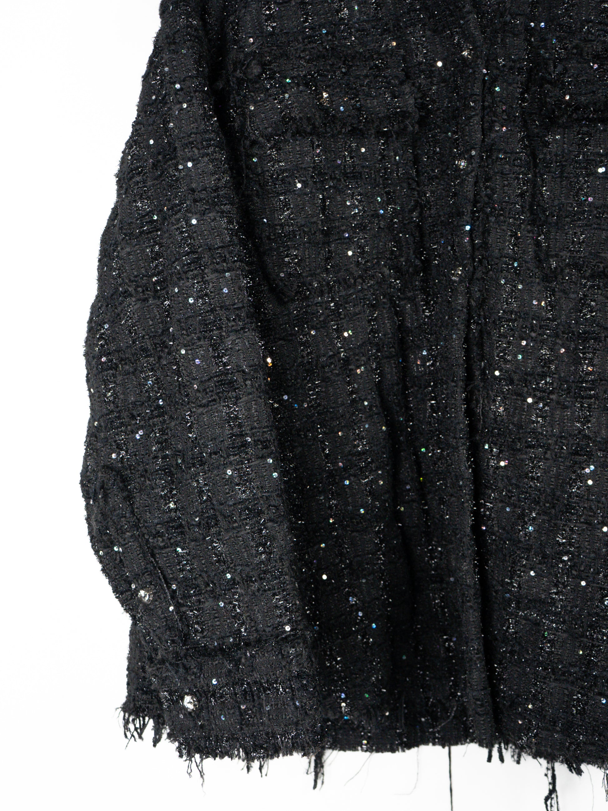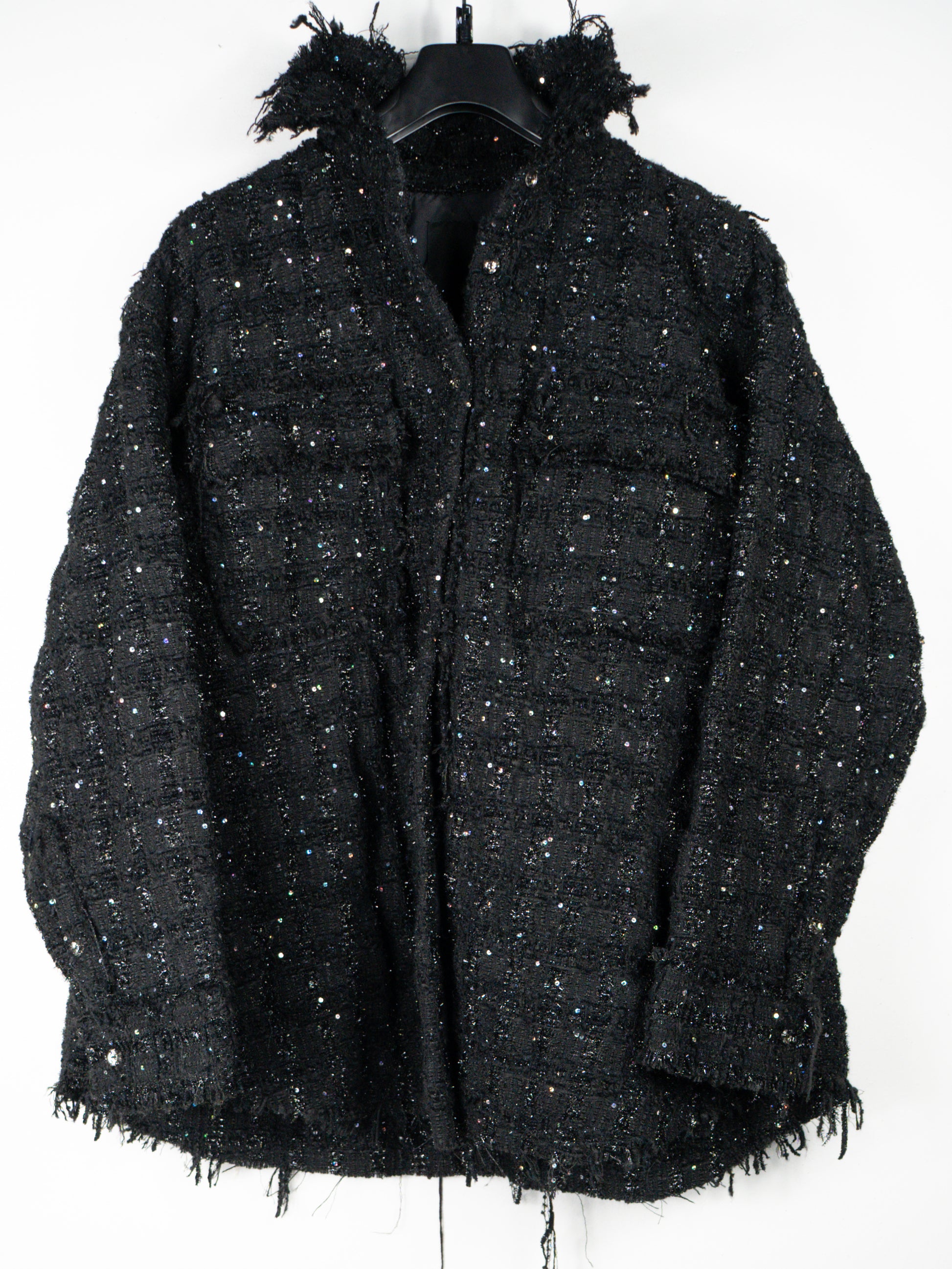 Melna tvīda jaka ar fliteriem un spīdīgiem diegiem. Priekšpusē pogas un kabatas. Iekšpusē dūnu pildījums. 90% dūnas, 10% spalvas.