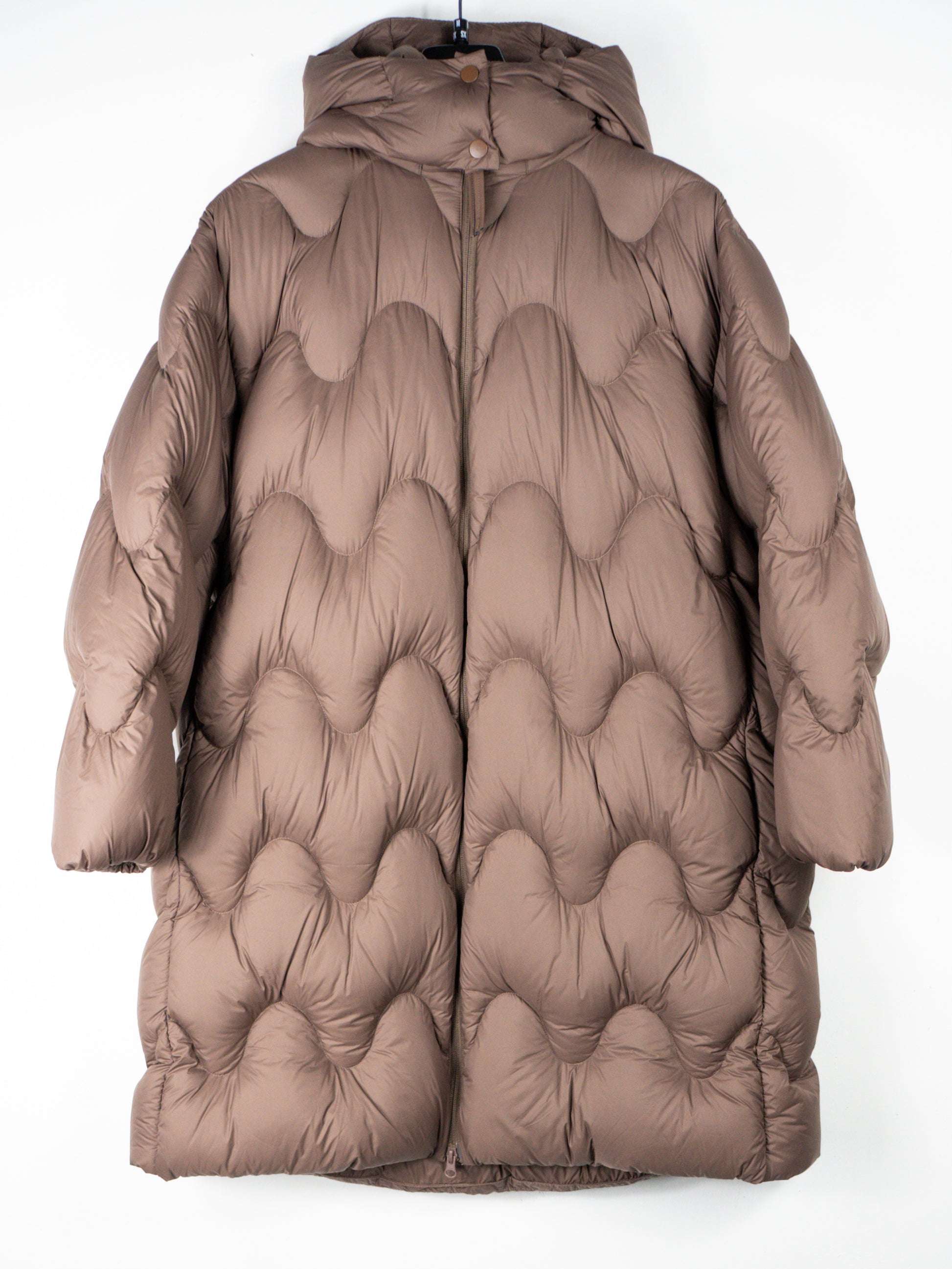 Dūnu jaka ar savelkamu apakšdaļu un noņemamu kapuci. 100% poliamīds; 90% dūnas, 10% spalvas.