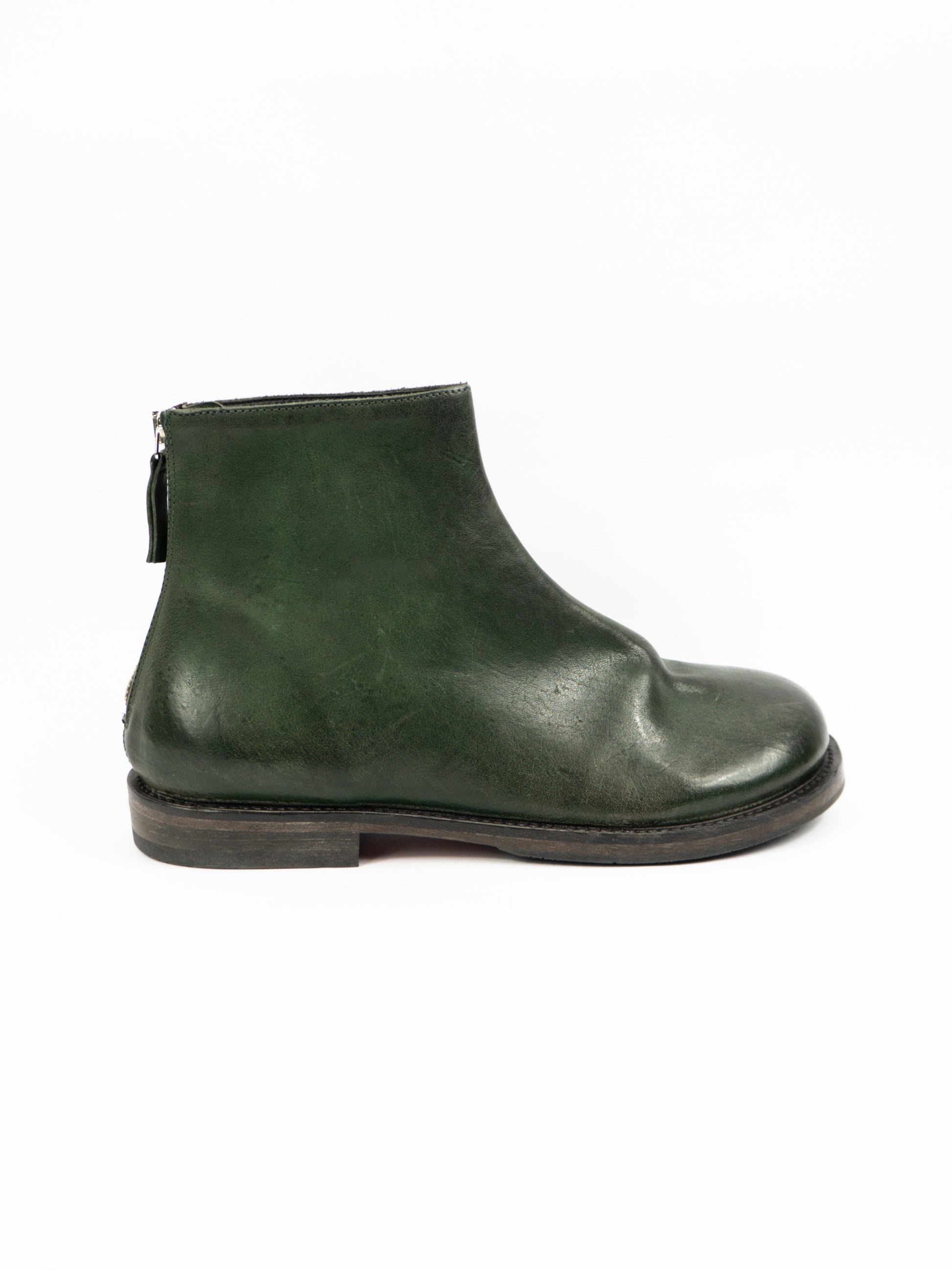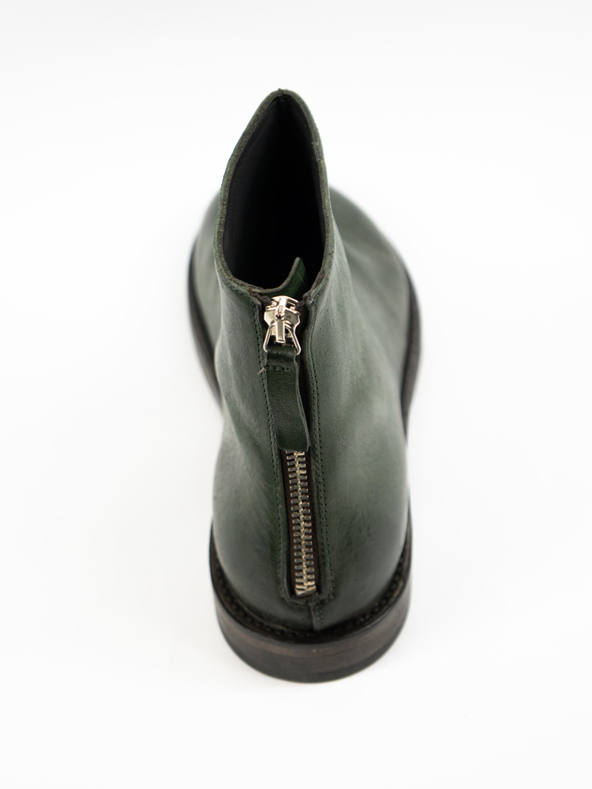 Tumši zaļi ādas zābaki ar rāvēju aizmugurē.