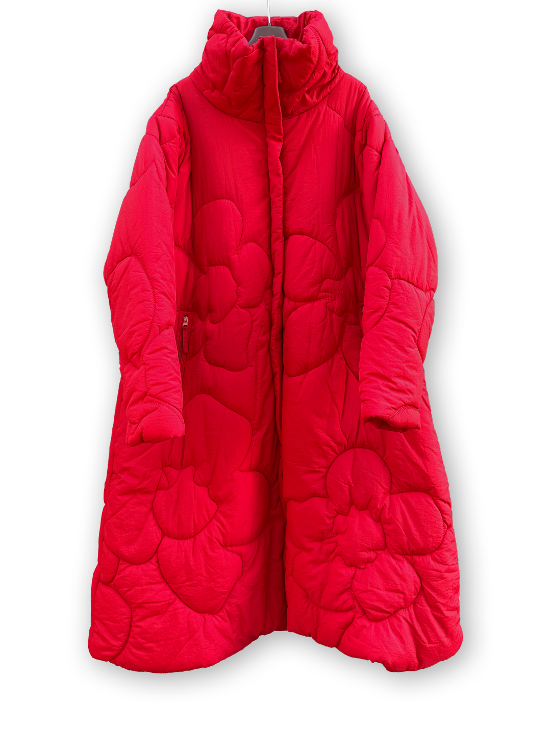 Sarkans mētelis ar ziedu rakstu. 100% poliamīds.