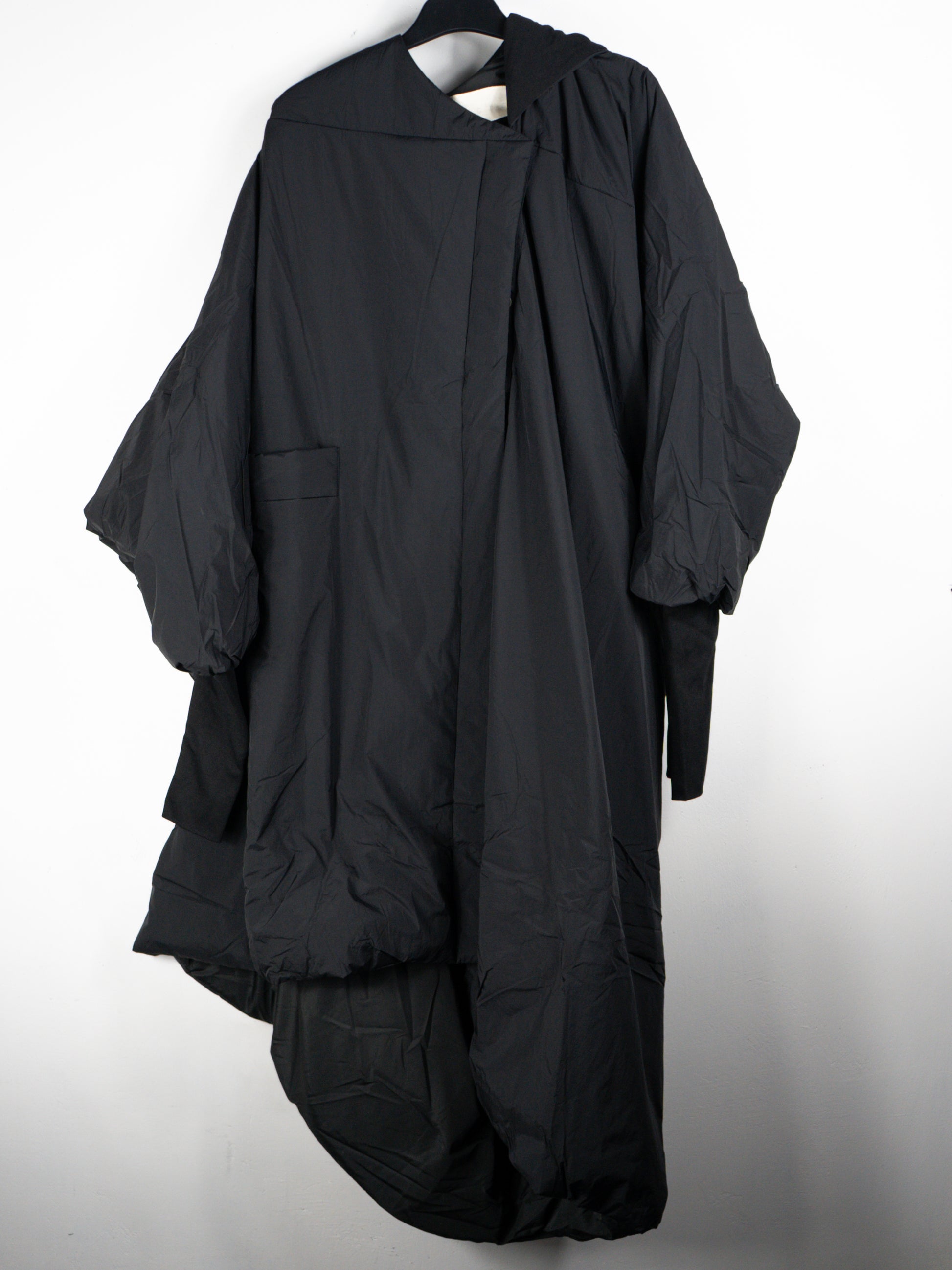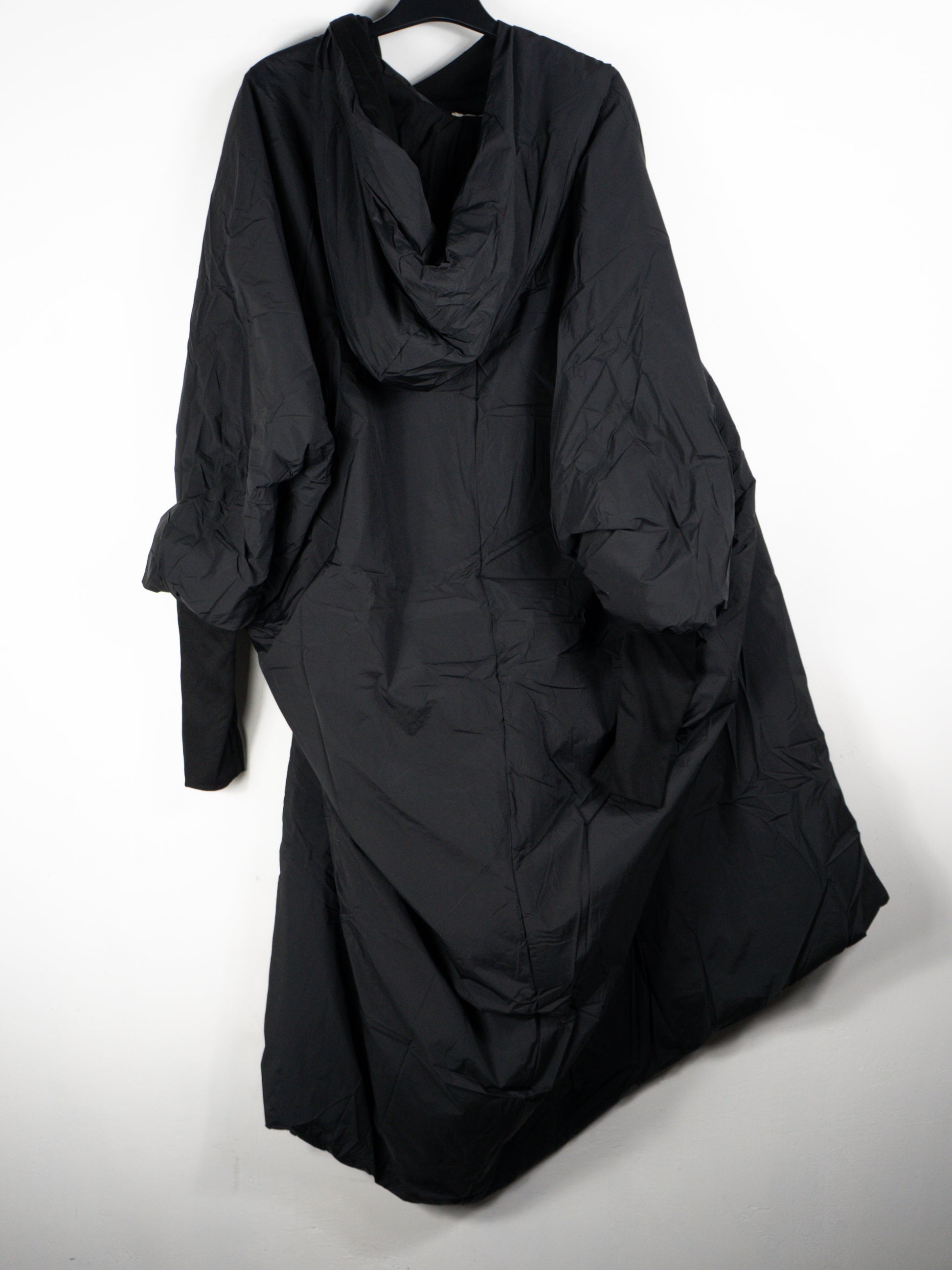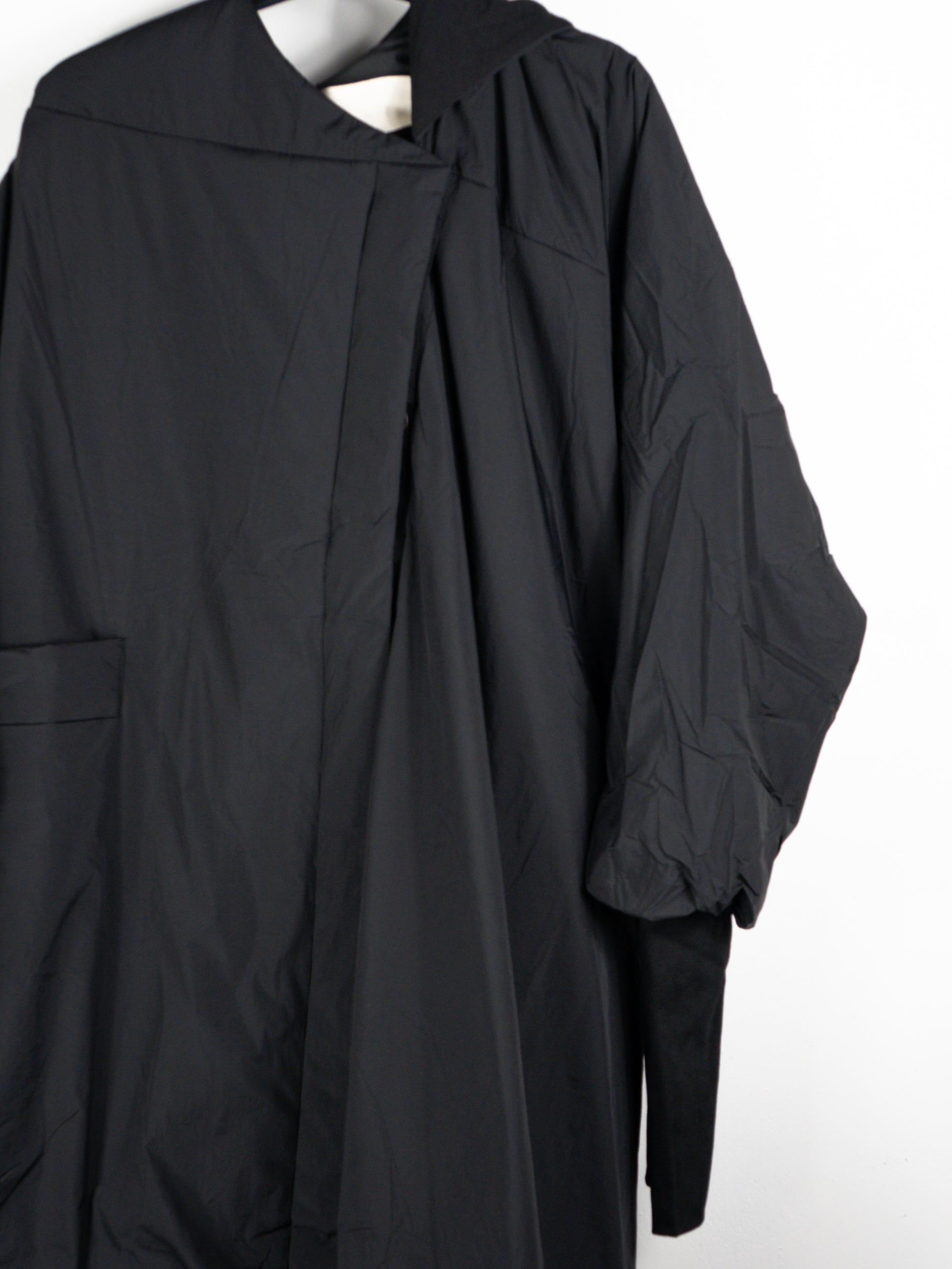 Mētelis ar pildījumu, asimetriskām kabatām, pogām un kapuci. 100% poliamīds.