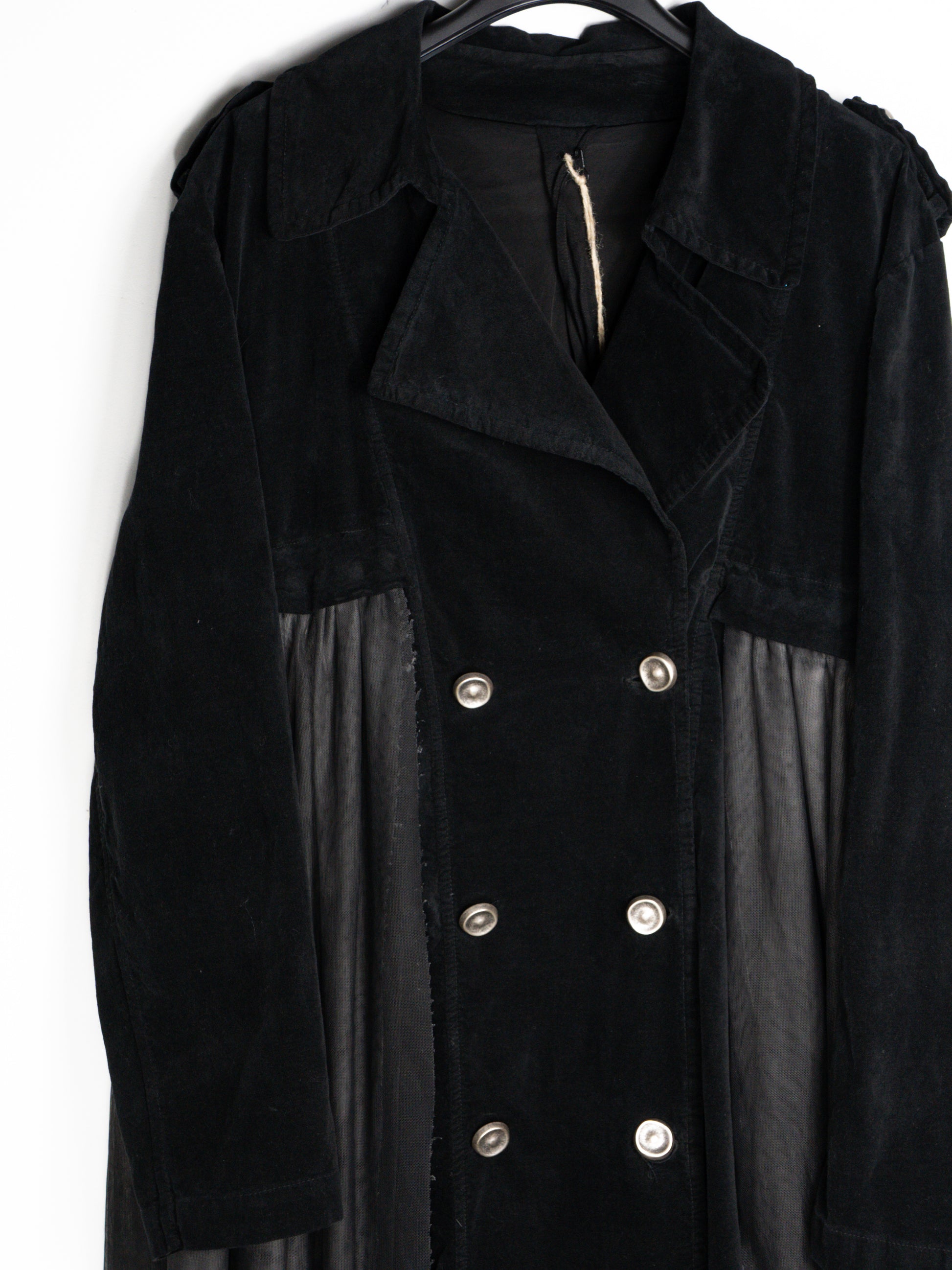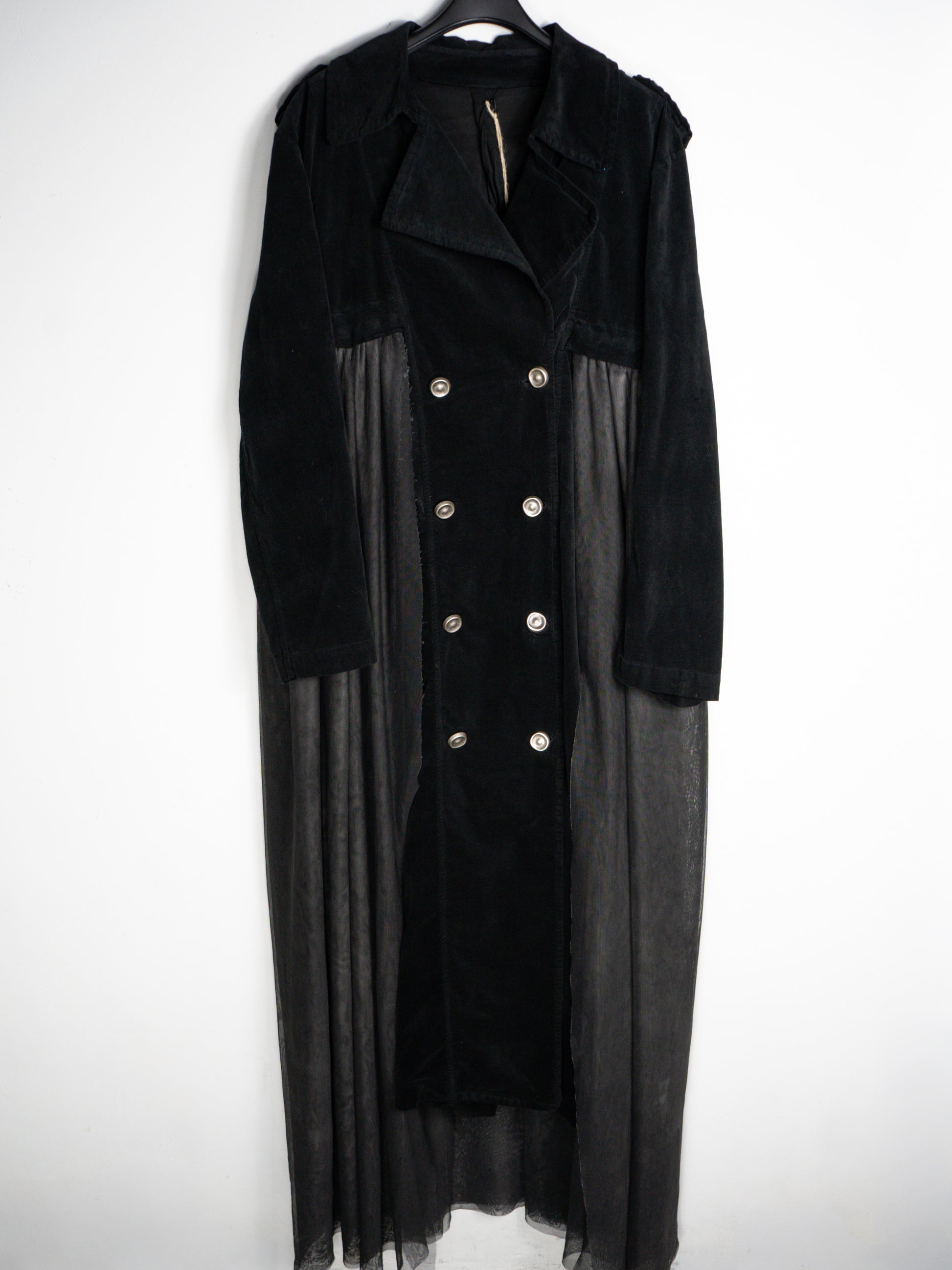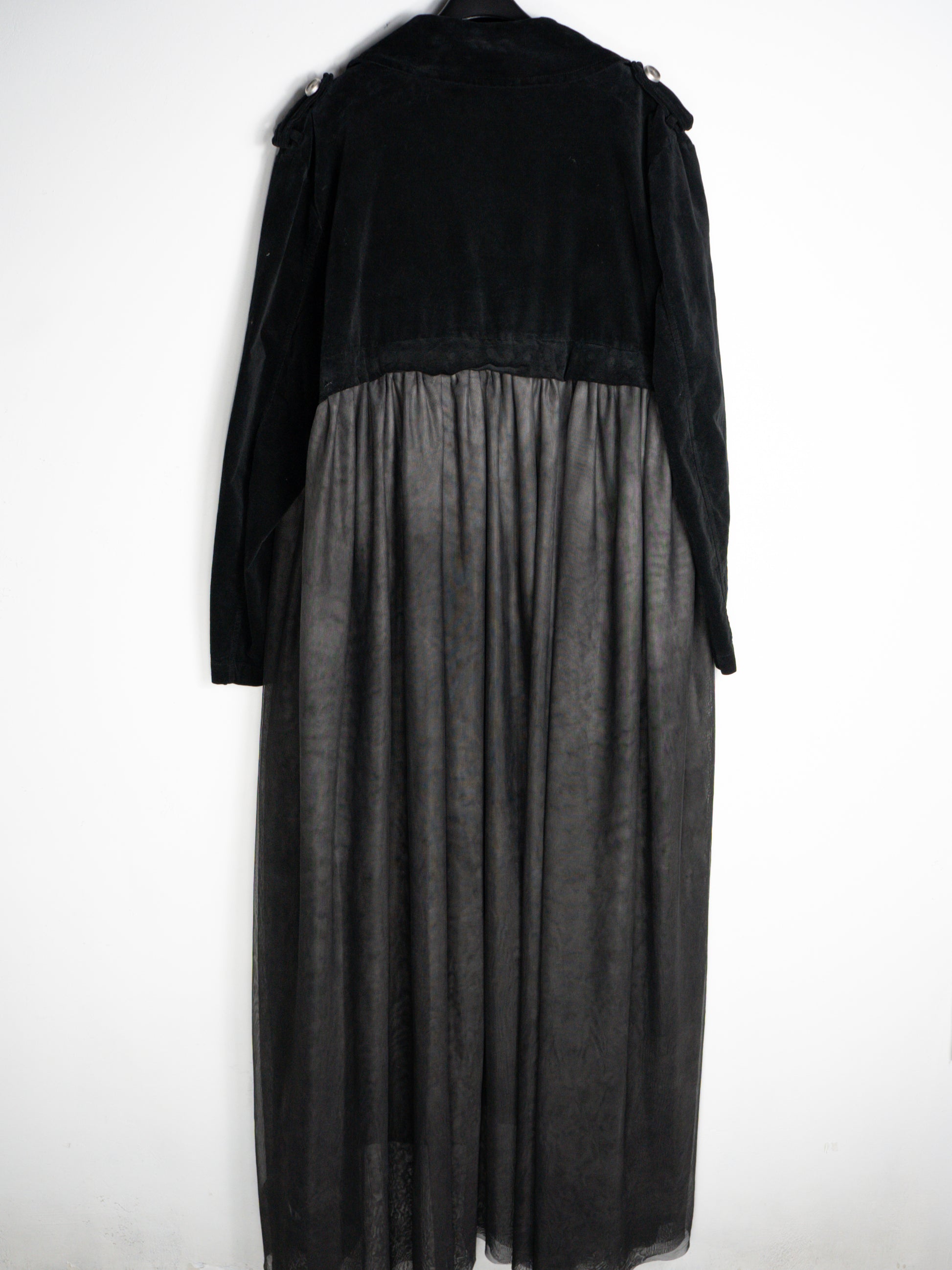 Melns mētelis no samta un tilla. Ar pogām un kabatām. Tills ir noņemams ar spiedpogām. 97% kokvilna, 3% elastāns; 100% poliesters.