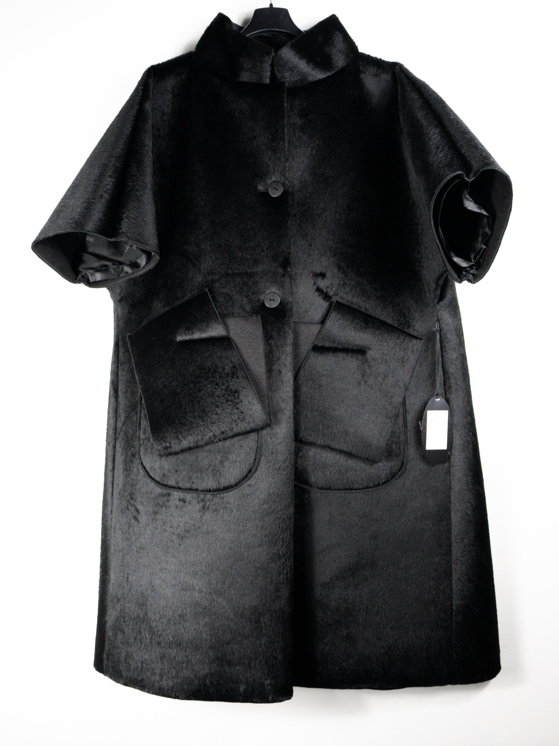 Melns dizaina mētelis ar pogām un kabatām. 100% poliesters; 100% viskoze.