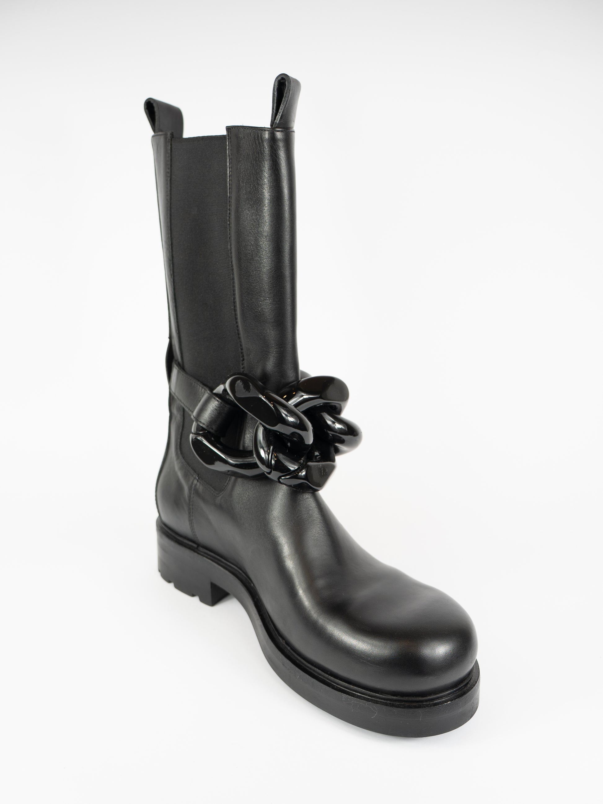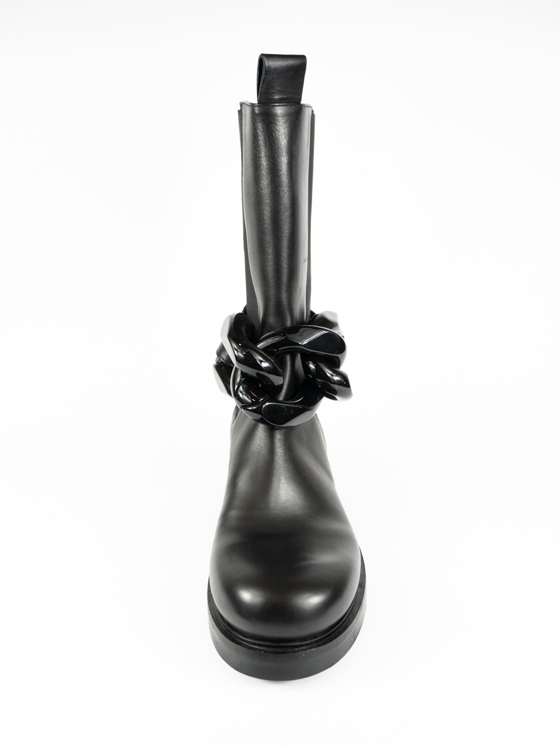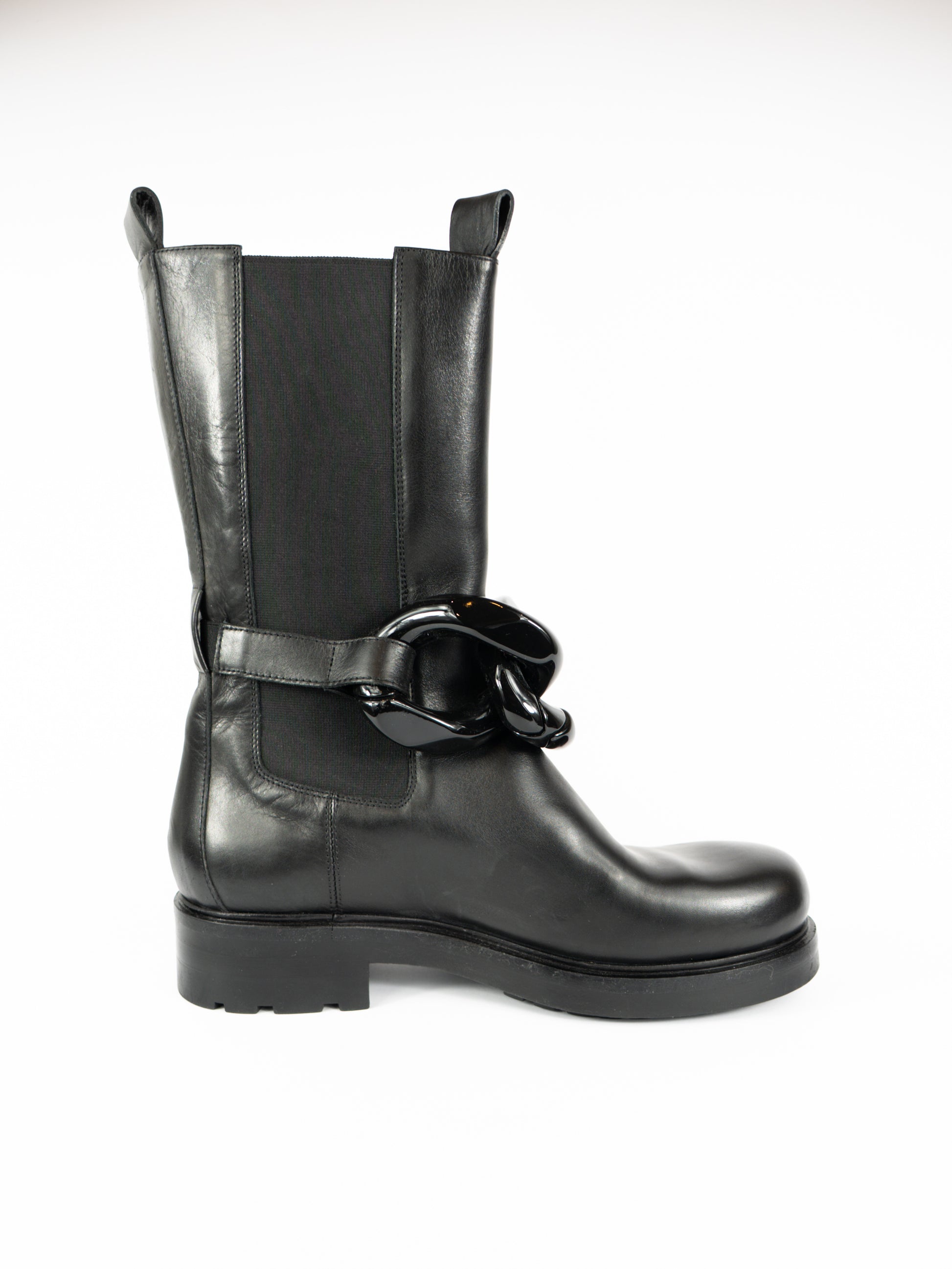Ādas zābaki ar dekoratīvu ķēdi.